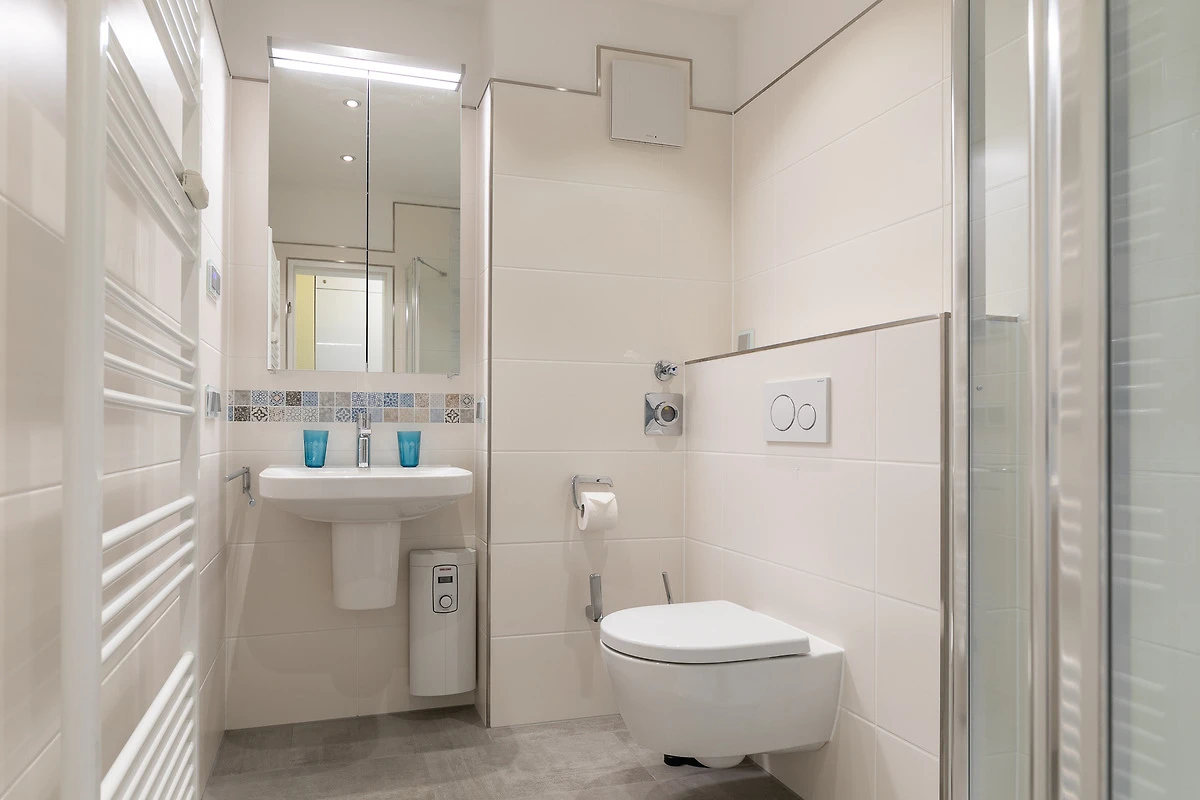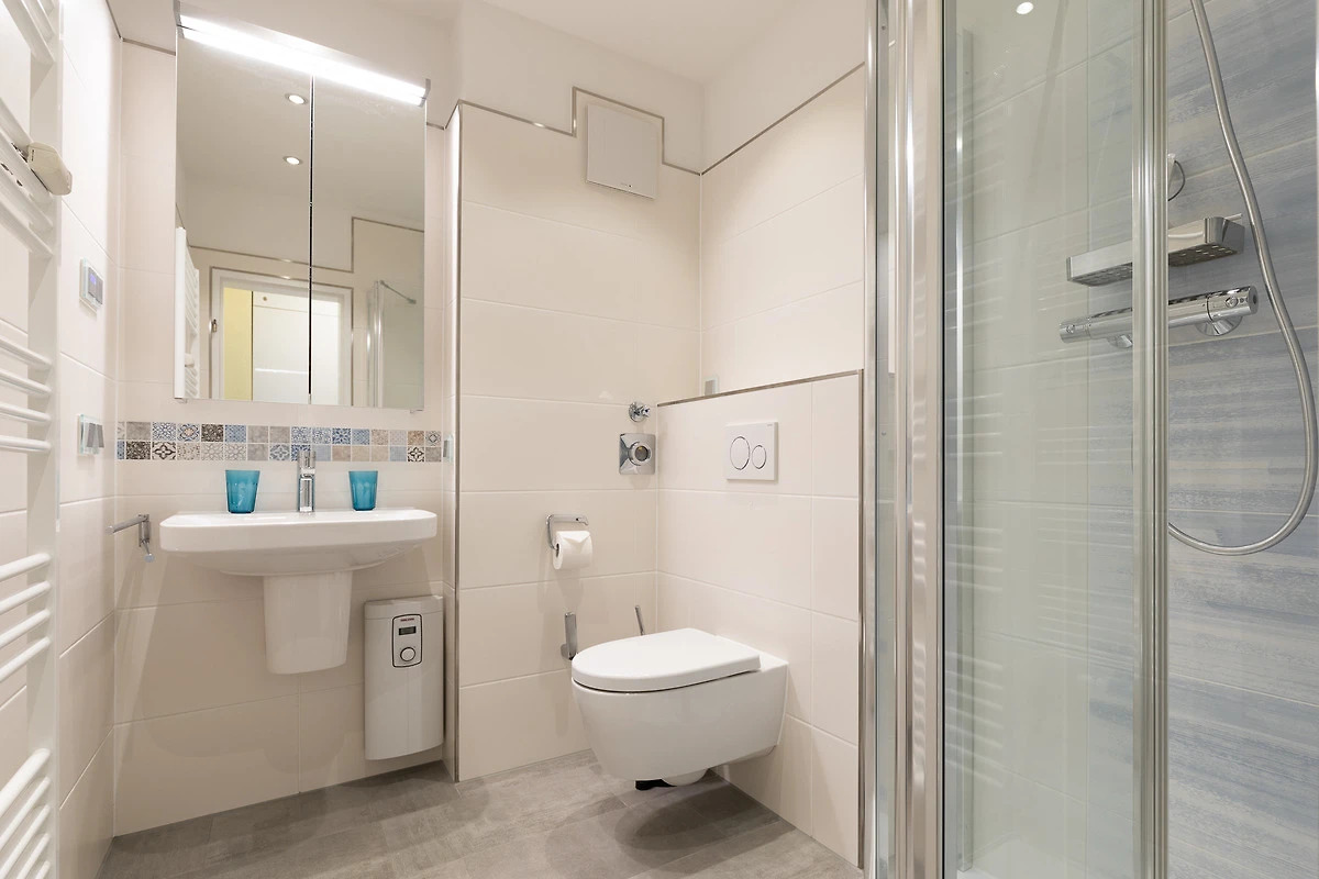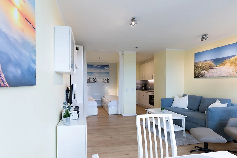 Die 1 Zimmer Wohnung, ca. 35m² ist für bis zu 3 Personen ausgestattet, helles Wohnzimmer mit Sofa (Schlafsofa), Sessel mit Fussteil, Flatscreen TV, Essplatz mit 4 Stühlen, abgetrennter Schlafbereich (Schlafnische, ohne Tür) mit 2 Einzelbetten (jeweils 90 x 200 cm) und Zugang zum Balkon (kleiner Nordbalkon - bietet Platz für 2 Personen, mit Gartenmöbel), Küchenzeile (Ceranfeld mit 2 Kochstellen, Mikrowelle, Kühlschrank - mit Gefrierfach, Geschirrspüler, Kaffeemaschine, Wasserkocher, Toaster), 1 Bad mit Dusche (mit Regenschauerdusche) und WC, Flur, WLAN inkl., PKW-Stellplatz am Haus, Nichtraucher, es sind keine Tiere erlaubt.