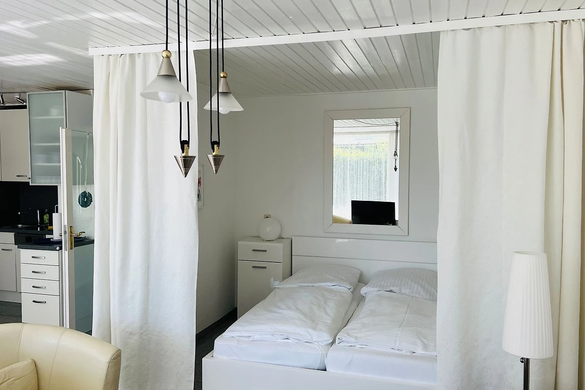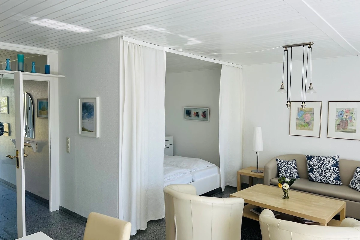 Probiers mal mit Gemütlichkeit: Der gemütliche Wohnbereich bietet neben SAT-TV auch Möglichkeiten z.B. zum Lesen oder Ausruhen. Der Schlafbereich ist vom Wohnbereich durch einen Vorhang getrennt.