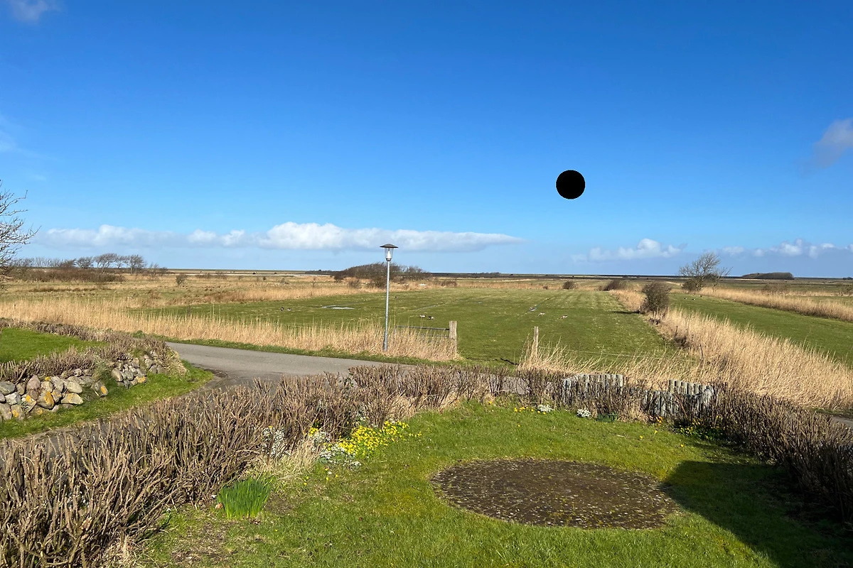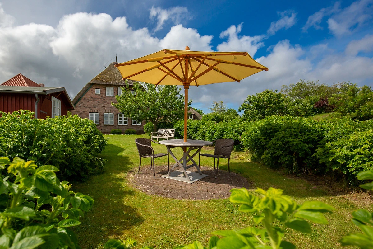 Der Garten ist umgeben von einem mit Heckenrosen bewachsenem Friesenwall und bietet freien Blick in die Marsch. Auf den bequemen Gartenmöbeln mit Polstern kann man es sich in der Sonne gemütlich machen