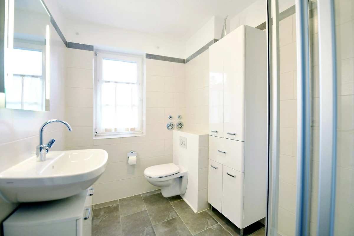 Die Erdgeschosswohnung Nr. 1 bietet Platz für zwei bis vier Personen. Ein grosszügiges und helles Wohnzimmer mit bequemen Sofa, ein Essplatz sowie eine moderne Küchenecke lassen keine Wünsche offen. Vom Wohnzimmer aus geht es direkt auf die windgeschützte Südterrasse mit Mobiliar. Ein Schlafzimmer mit Doppelbett sowie ein Duschbad mit Fenster gehören ebenfalls zur Wohnung. Im Souterrain (grosses Fenster) befindet sich ein kleines Zimmer mit Etagenbett.