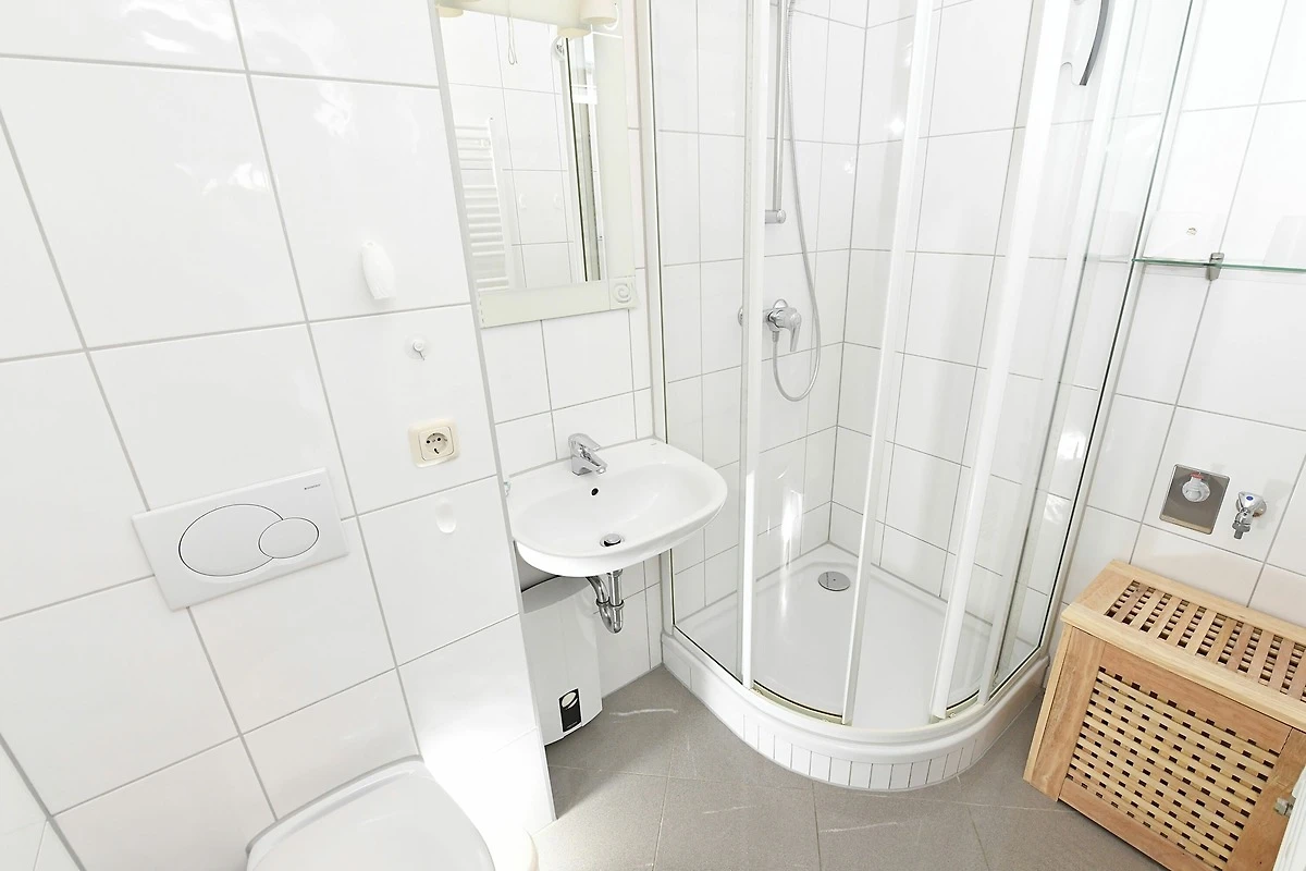Der Schlafbereich bietet mit einem Doppelbett und einem TV die Möglichkeit, erholsame Schlafstunden zu verleben. Im hell erleuchteten Badezimmer findet sich eine Dusche und ein WC.