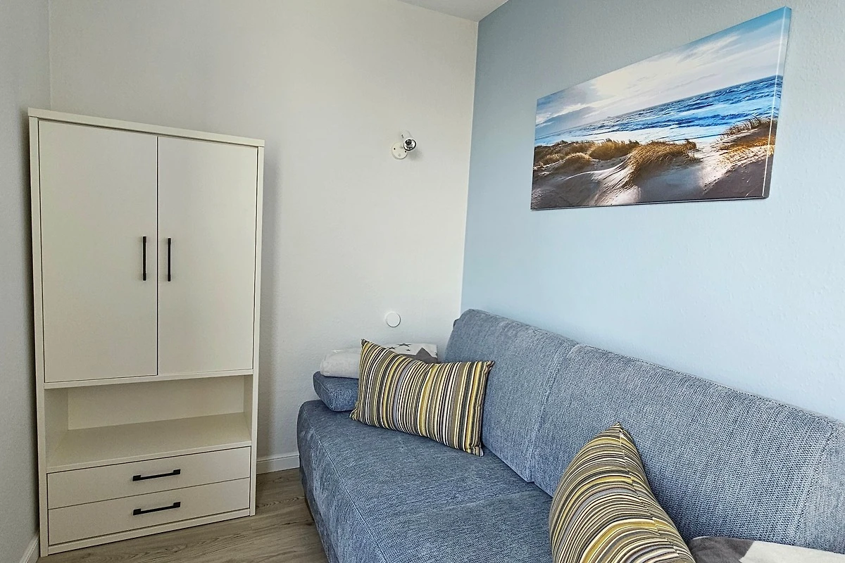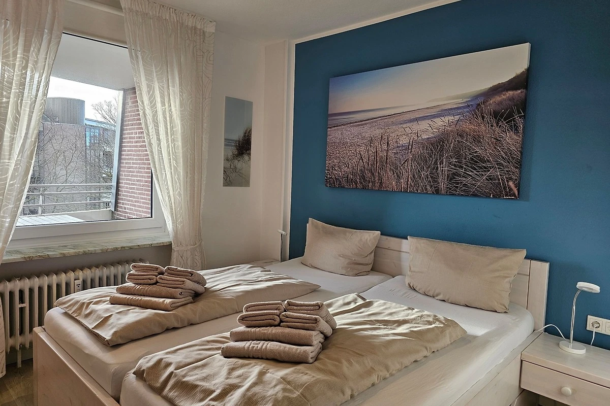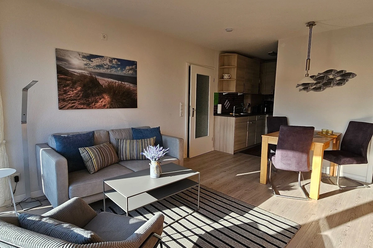 Die sehr gemütlich eingerichtete Ferienwohnung befindet sich am Südstrand im Haus Flora im 2. Stock (Fahrstuhl vorhanden) und ist ca. 60 m² gross. Sie ist sehr gut geeignet für 2 - 3 Personen und verfügt über ein Schlafzimmer mit Doppelbett sowie ein kleines Schlafzimmer mit einer komfortablen Schlafcouch für 1 Person. Ein grosser Balkon lädt zum Entspannen ein - im Sommer mit Blick ins Grüne. In der Winterzeit können Sie durch Bäume das Meer sehen.