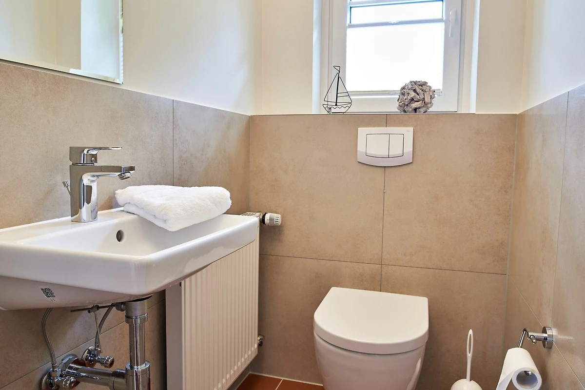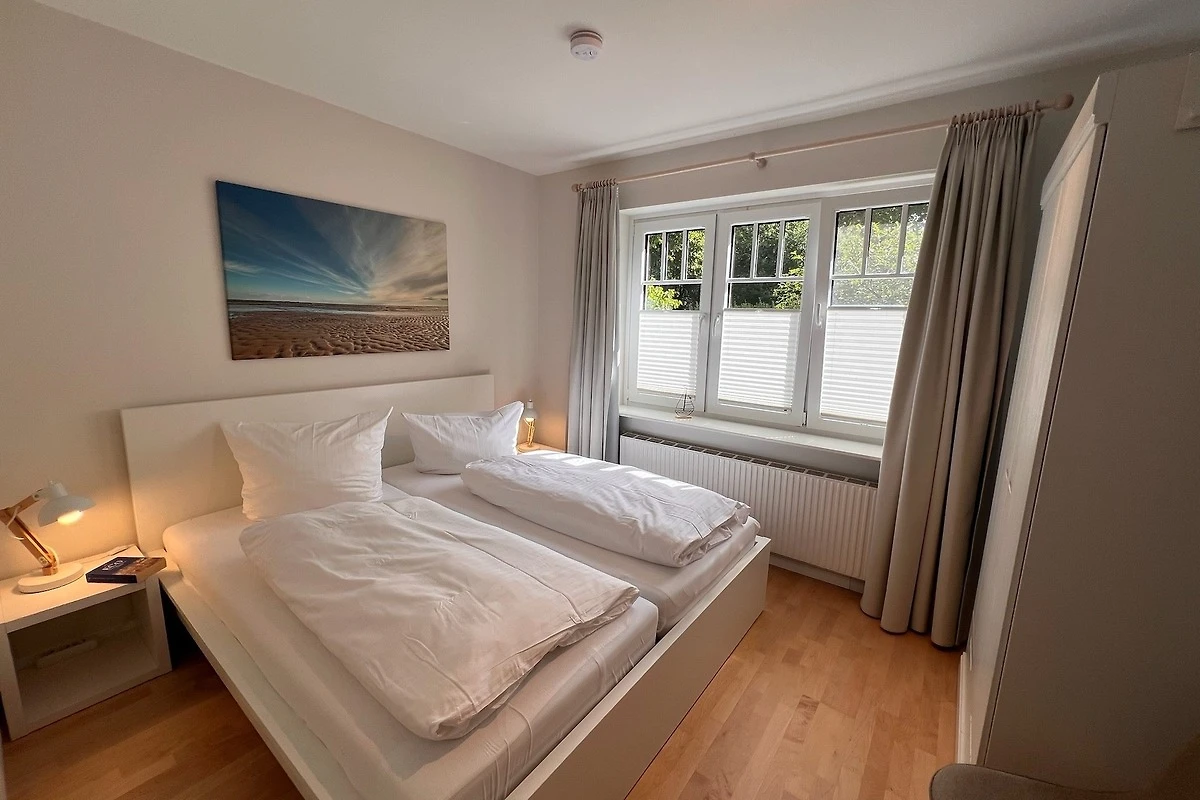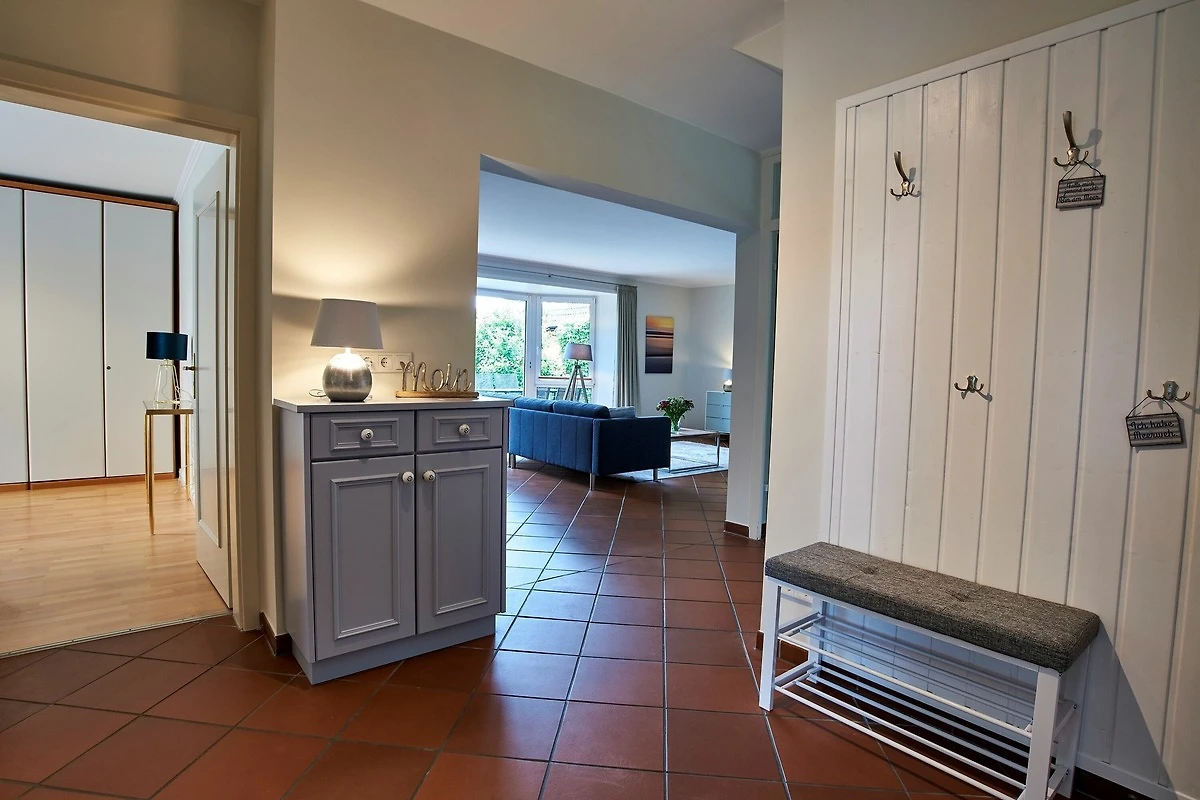 Die grosszügige Erdgeschosswohnung (95 qm) bietet zwei Schlafzimmer, jeweils mit einem Doppelbett. Das Badezimmer wartet mit einer ebenerdigen Regendusche und viel Ablagefläche auf. Im Flur ist eine Garderobe, die Platz für alle Fleece-, Regen- und weitere Jacken hat vorhanden. Weiterhin gibt es noch ein zusätzliches Gäste-WC.