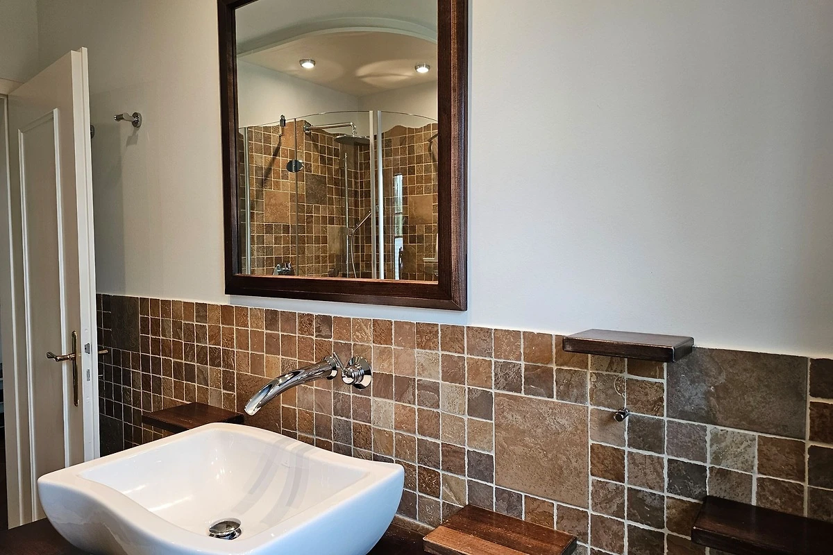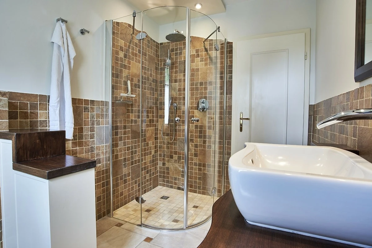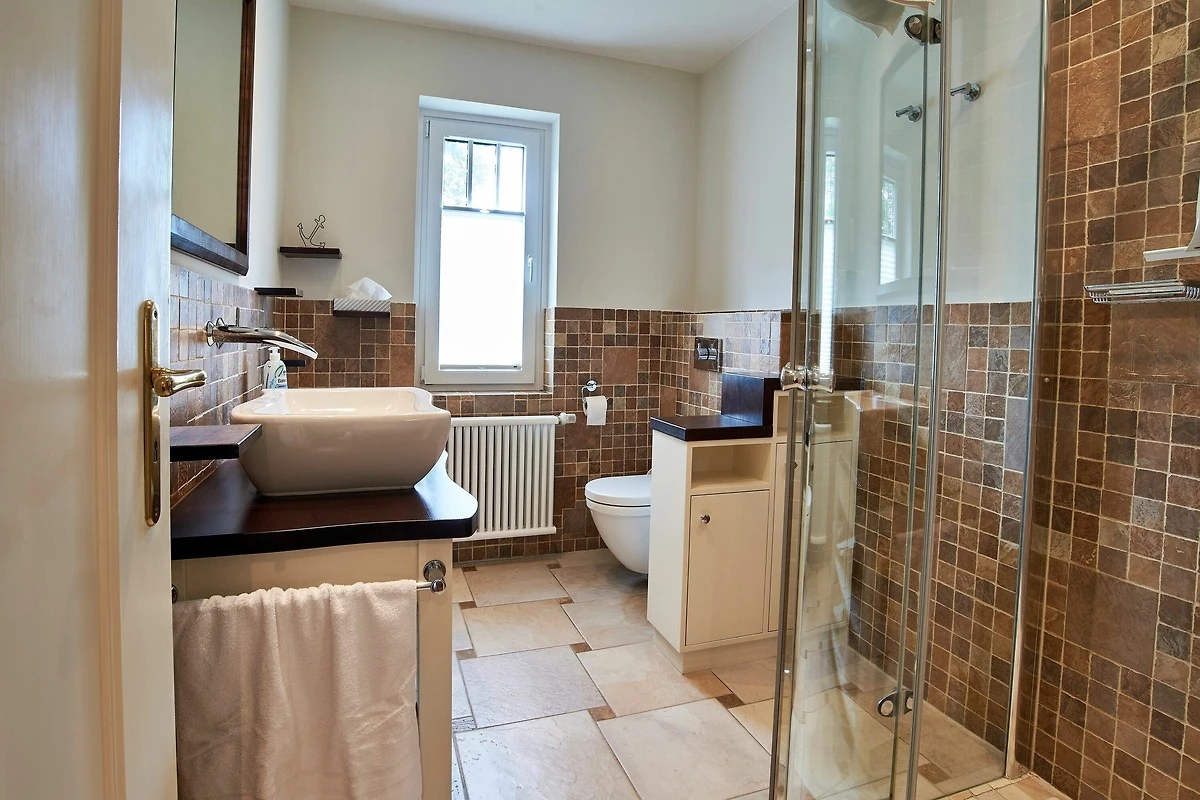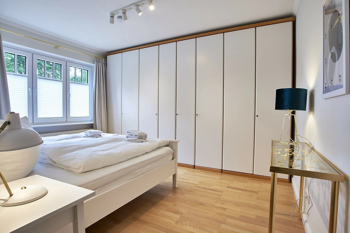 Die grosszügige Erdgeschosswohnung (95 qm) bietet zwei Schlafzimmer, jeweils mit einem Doppelbett. Das Badezimmer wartet mit einer ebenerdigen Regendusche und viel Ablagefläche auf. Im Flur ist eine Garderobe, die Platz für alle Fleece-, Regen- und weitere Jacken hat vorhanden. Weiterhin gibt es noch ein zusätzliches Gäste-WC.