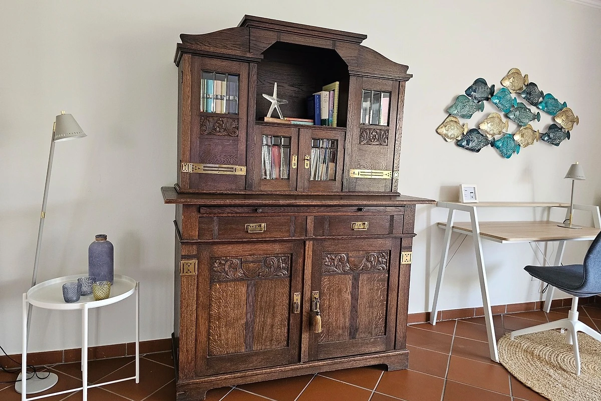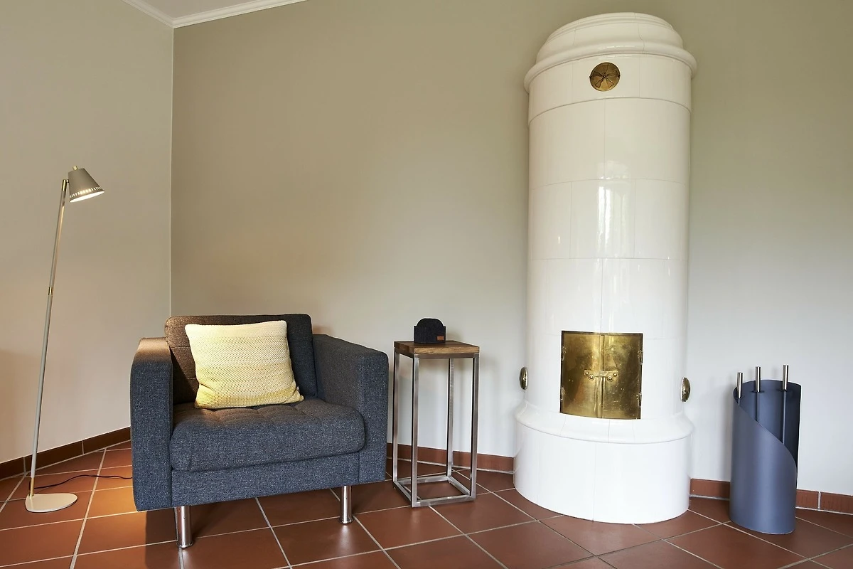 Das Highlight im Wohnzimmer ist der Mylin-Ofen, der so typisch für die Insel ist und in der kalten Jahreszeit für behagliche Wärme sorgt. Der grosse, lichtdurchflutete Raum strahlt eine moderne Gemütlichkeit aus, und lässt Sie garantiert auch einen Regentag entspannt überstehen.