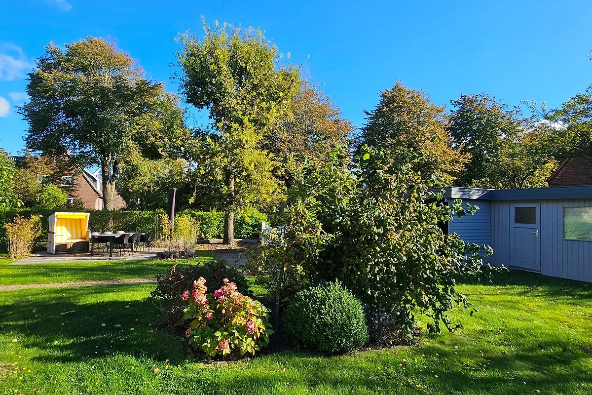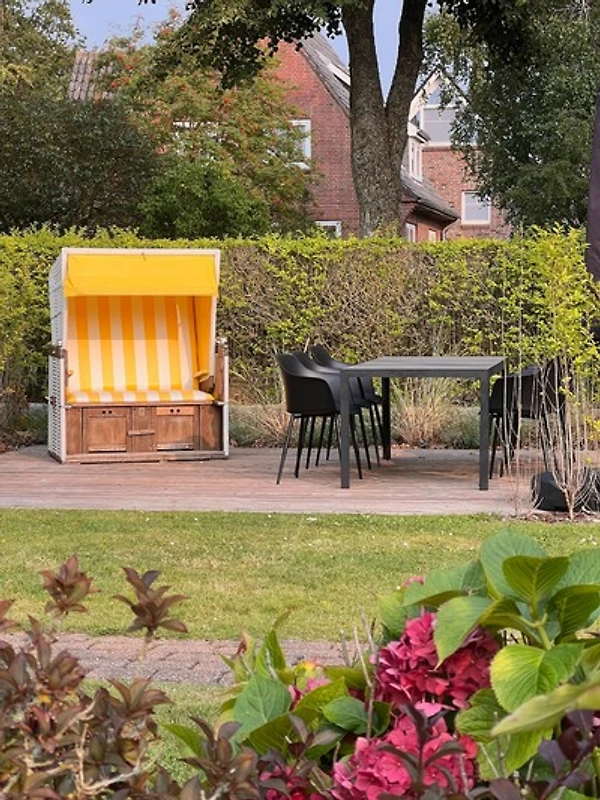 Der grosse Garten wird mit der Wohnung im Obergeschoss geteilt, das Carport jedoch ist für ein Auto der Erdgeschosswohnung reserviert. Auch bietet es sich als Unterstand für Fahrräder mit Anhänger oder E-Bikes für alle Gäste des Hauses an. Ein weiterer geschützter Stellplatz für Fahrräder ist vorhanden.