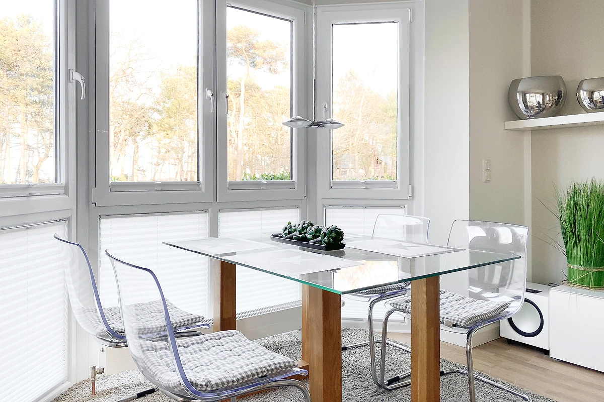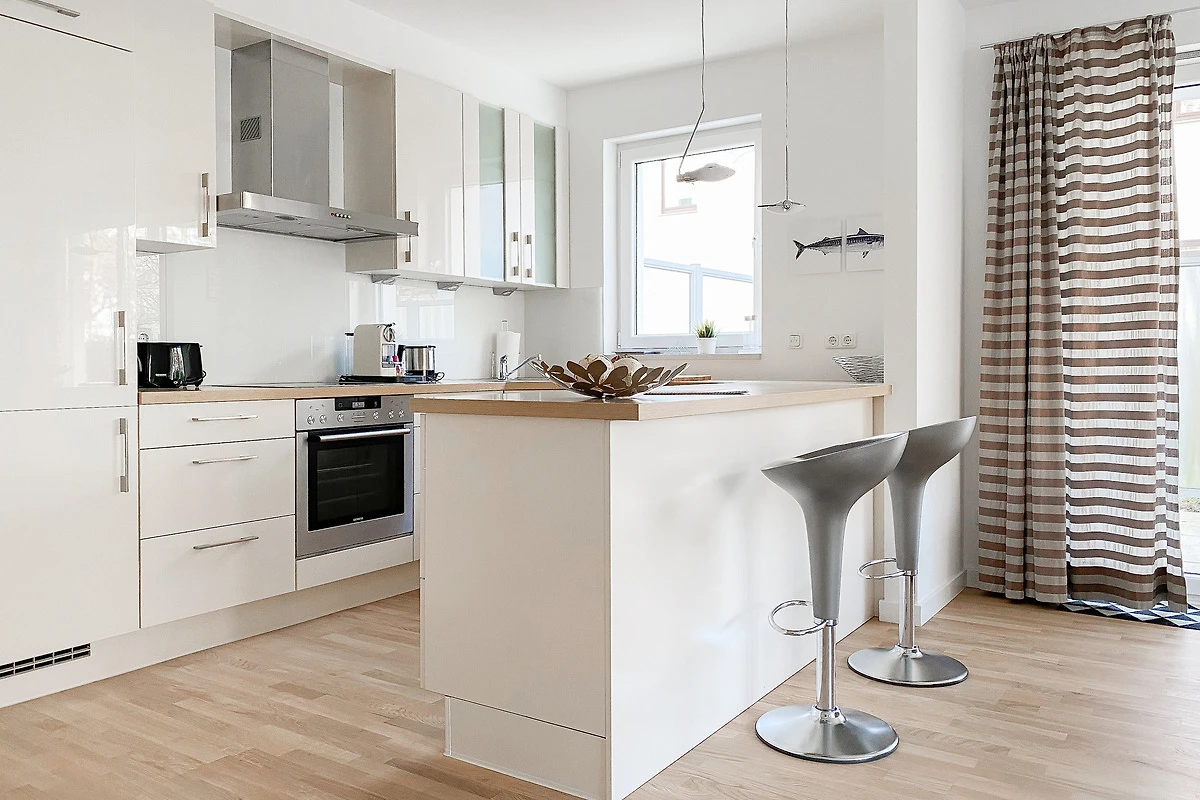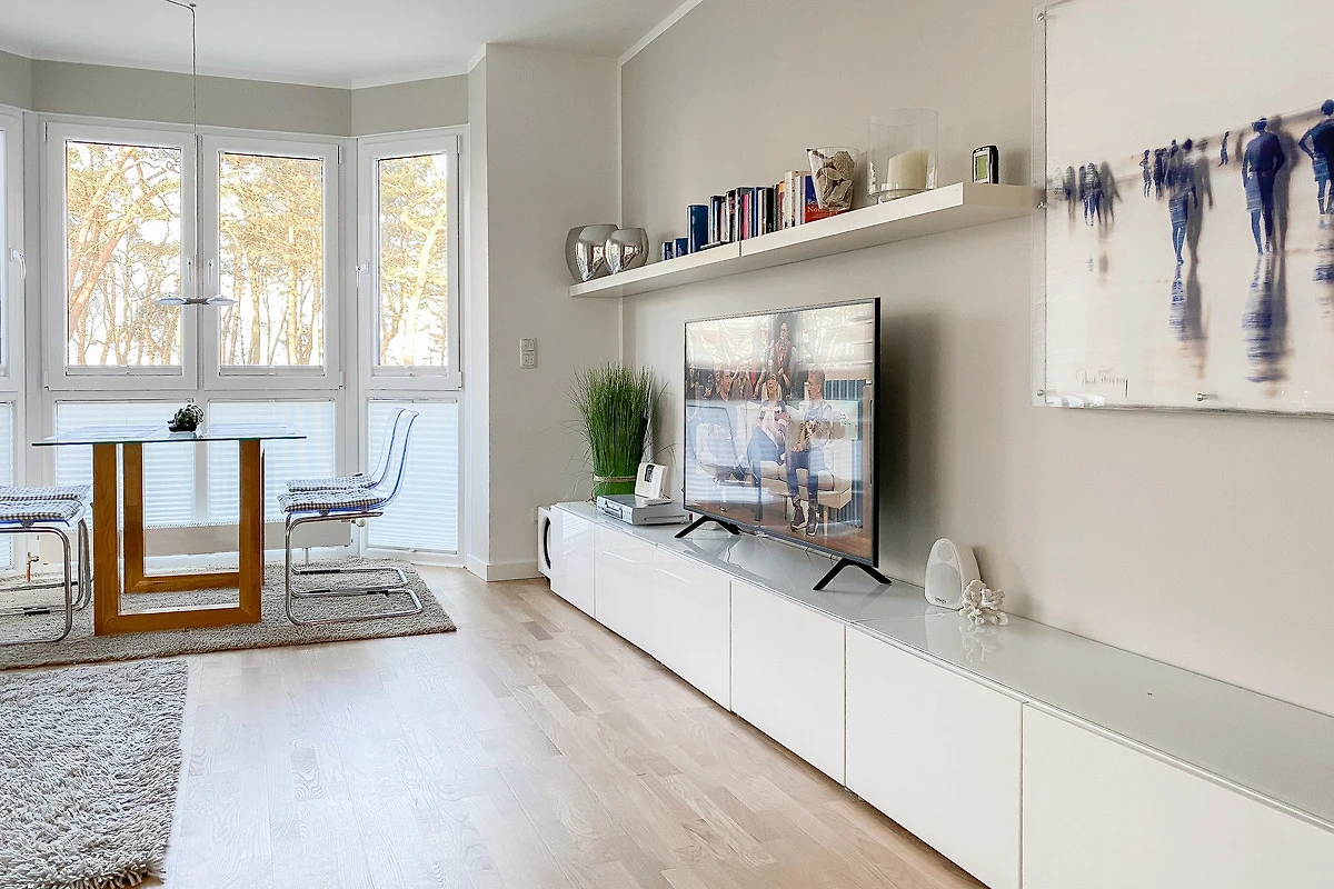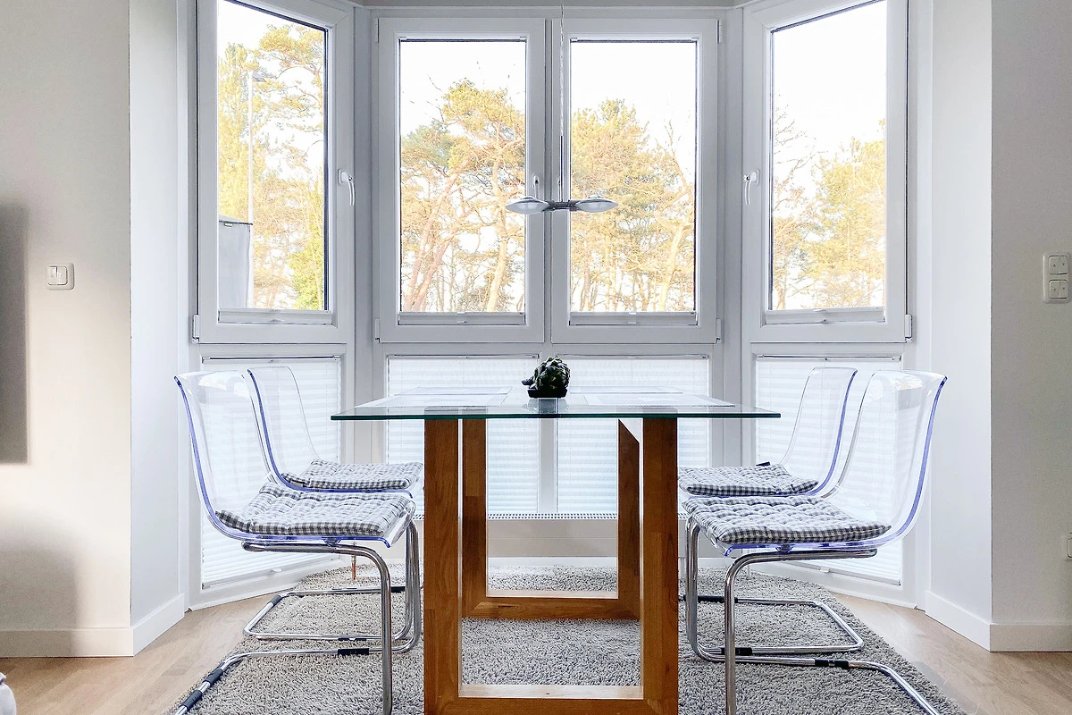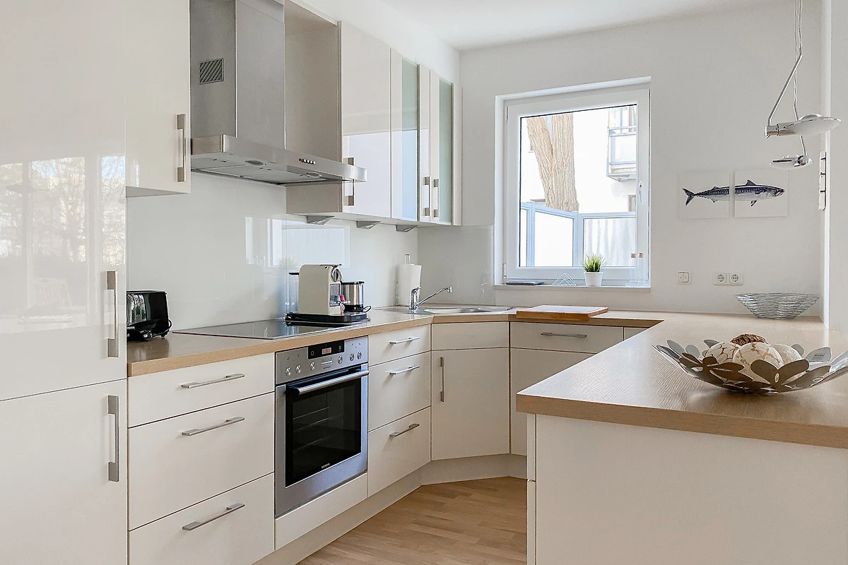Die moderne, geschmackvoll eingerichtete Wohnung verfügt über einen grosszügigen Wohnbereich mit angrenzendem Essbereich und schönem Blick durch den gegenüberliegenden Park bis zur Ostsee. Die Räumlichkeiten sind hell und freundlich dank bodentiefer Fensterelemente, die alle mit elektrischen Aussenjalousien versehen sind. Die offene, hochwertige Einbauküche ist bestens ausgestattet und verfügt über alle technischen Geräte. Es stehen zwei separate Schlafzimmer zur Verfügung. Eines ist mit einem komfortablen Doppelbett (180x200) ausgestattet, das Kinderzimmer verfügt über zwei Einzelbetten. Im modernen Bad mit grosszügigem, ebenerdigen Duschbereich und Fussbodenheizung sind auch Waschmaschine und Trockner untergebracht. Ein separates Gäste WC steht ebenfalls zur Verfügung. Zwei grosse Terrassen, ausgestattet mit Gartenmöbeln und Strandkorb, eignen sich hervorragend zum Entspannen.