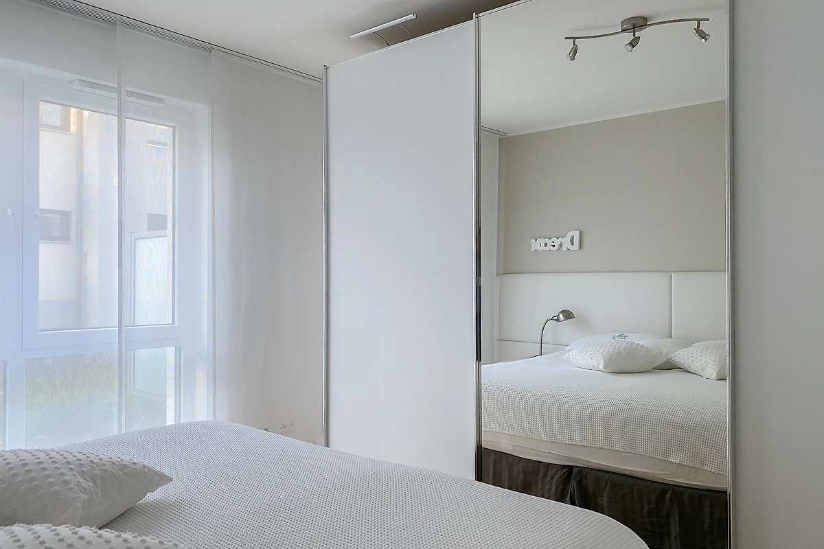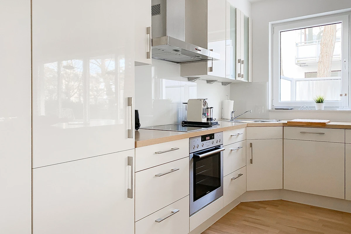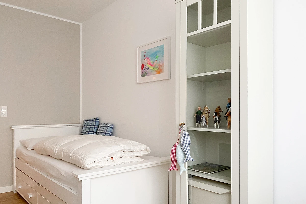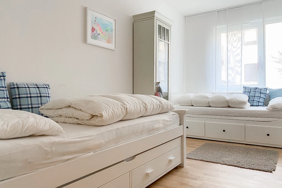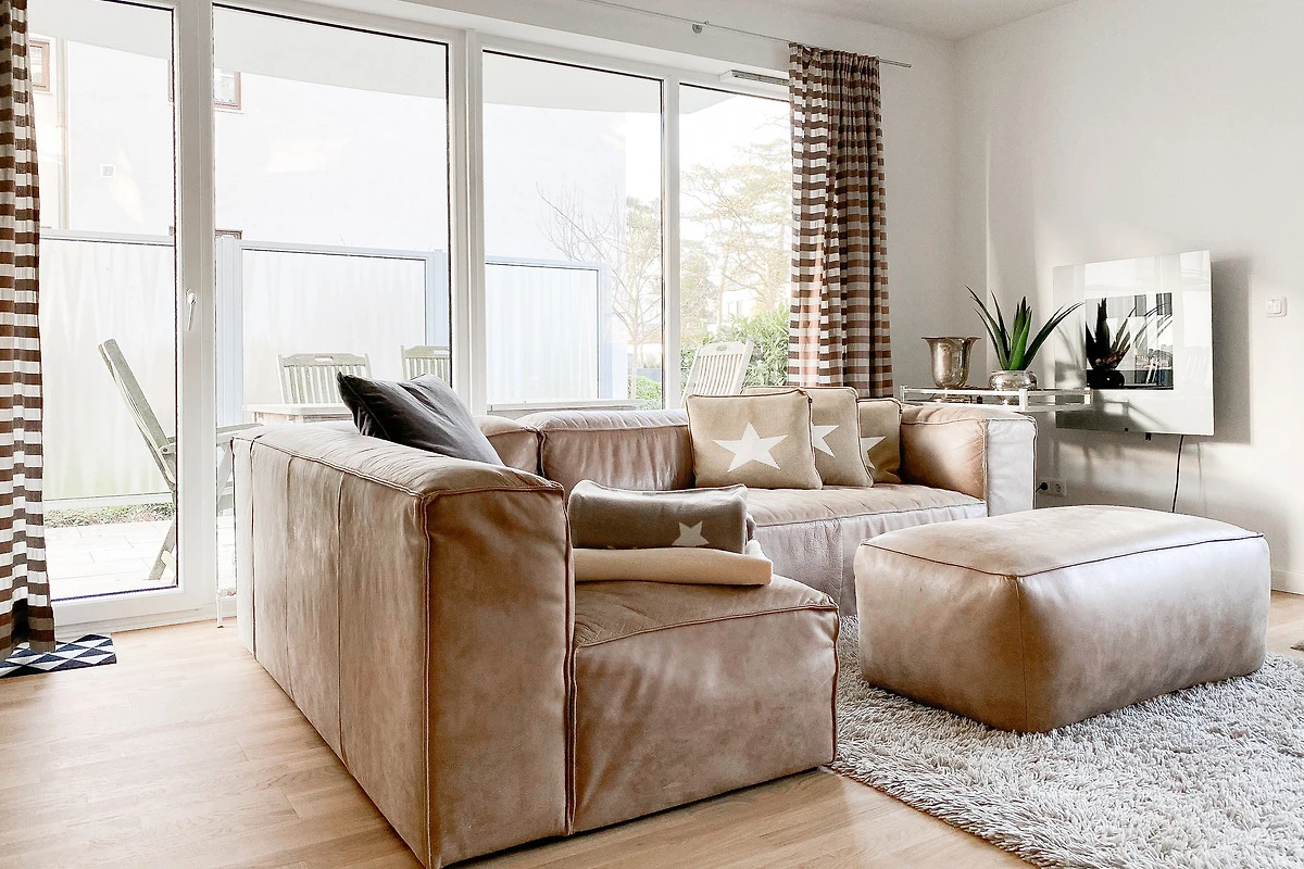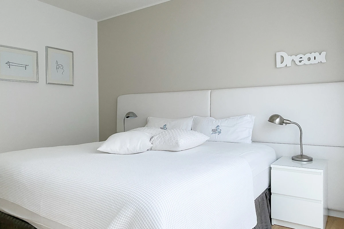 Die moderne, geschmackvoll eingerichtete Wohnung verfügt über einen grosszügigen Wohnbereich mit angrenzendem Essbereich und schönem Blick durch den gegenüberliegenden Park bis zur Ostsee. Die Räumlichkeiten sind hell und freundlich dank bodentiefer Fensterelemente, die alle mit elektrischen Aussenjalousien versehen sind. Die offene, hochwertige Einbauküche ist bestens ausgestattet und verfügt über alle technischen Geräte. Es stehen zwei separate Schlafzimmer zur Verfügung. Eines ist mit einem komfortablen Doppelbett (180x200) ausgestattet, das Kinderzimmer verfügt über zwei Einzelbetten. Im modernen Bad mit grosszügigem, ebenerdigen Duschbereich und Fussbodenheizung sind auch Waschmaschine und Trockner untergebracht. Ein separates Gäste WC steht ebenfalls zur Verfügung. Zwei grosse Terrassen, ausgestattet mit Gartenmöbeln und Strandkorb, eignen sich hervorragend zum Entspannen.