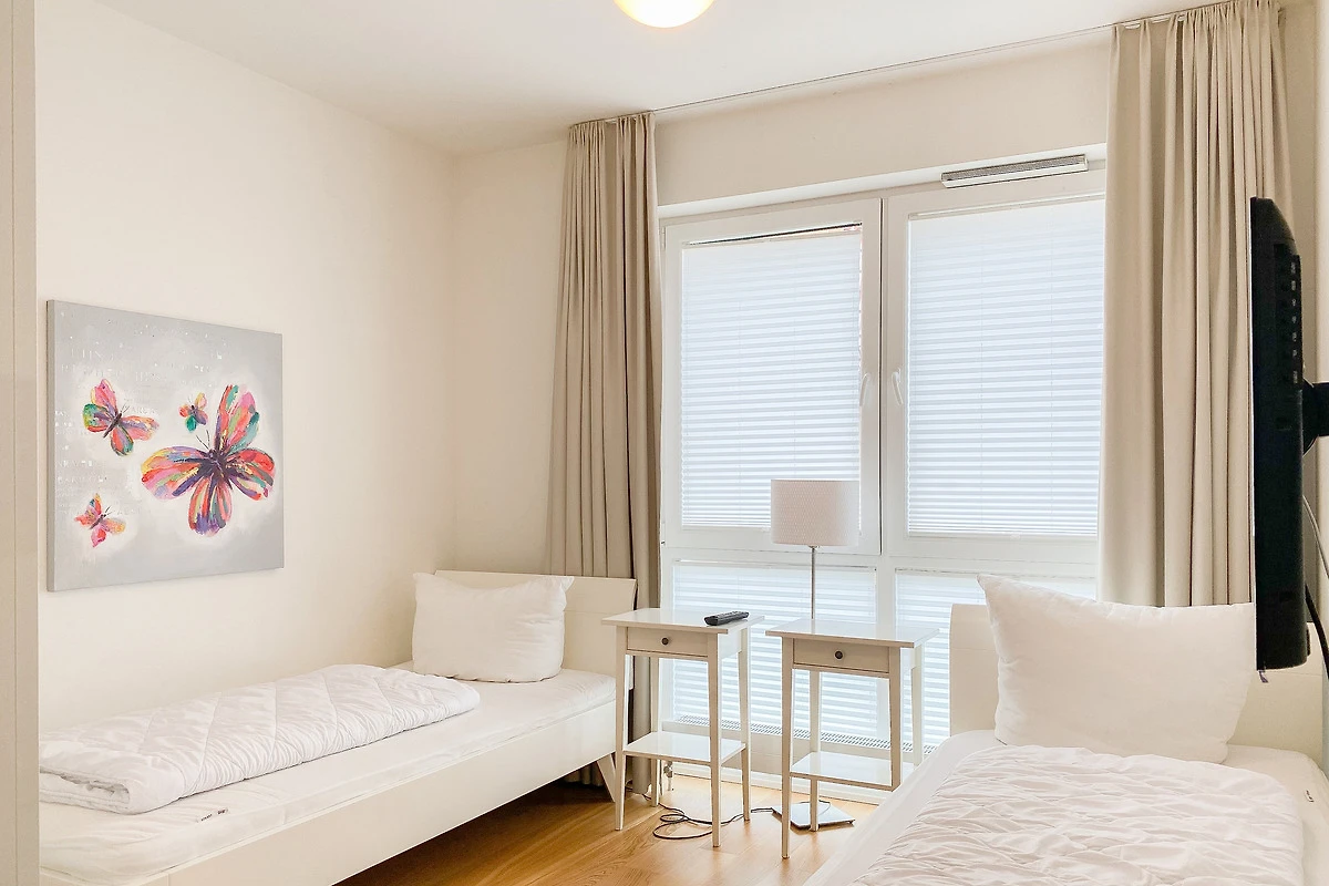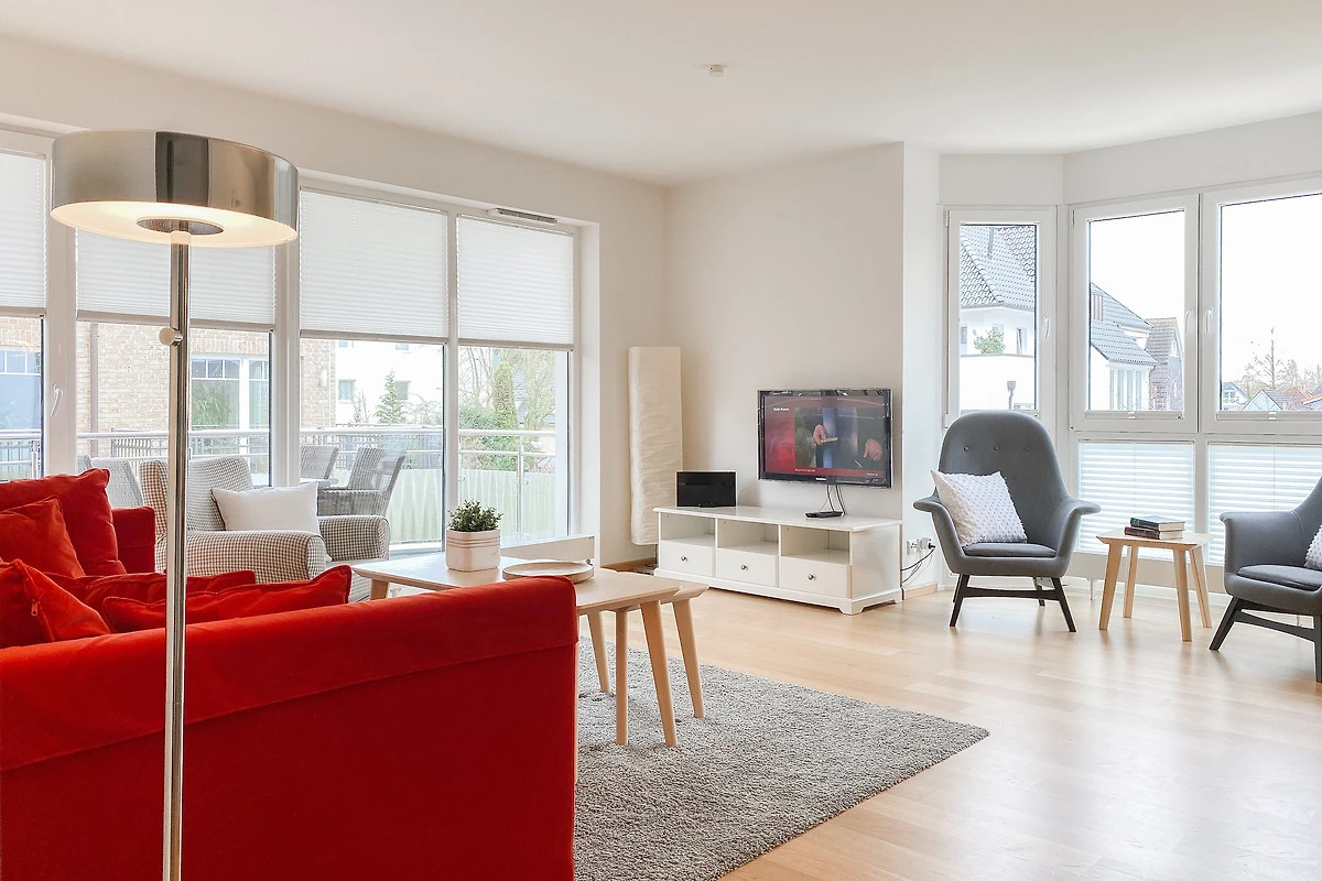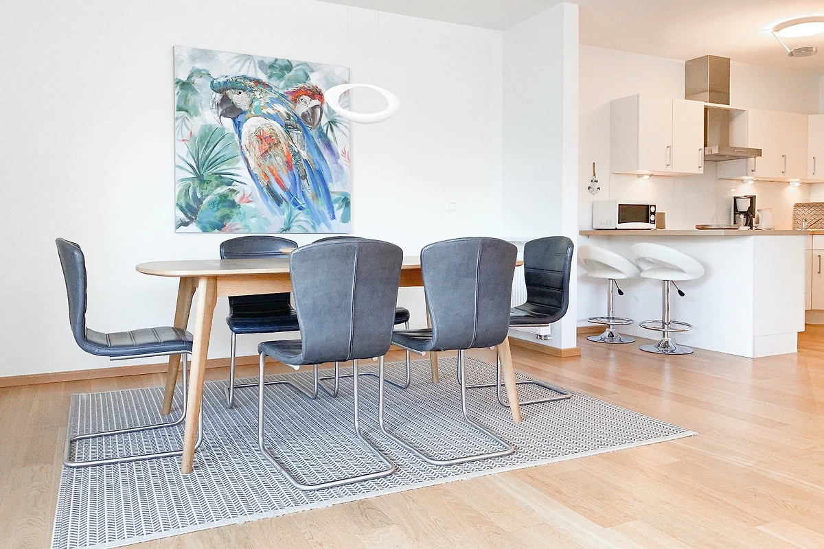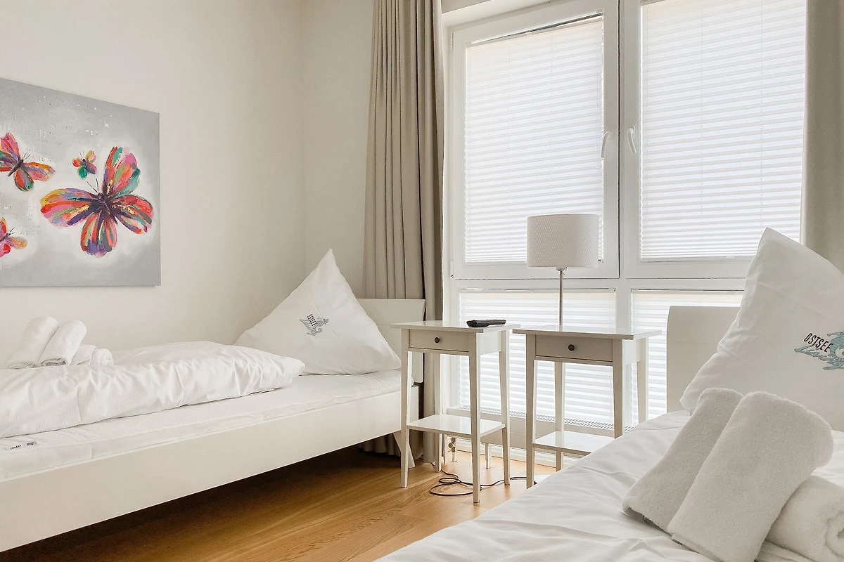 Die 92 qm grosse Wohnung befindet sich im ersten Obergeschoss und verfügt über zwei separate Schlafzimmer - ausgestattet mit Doppelbett (180x200) und zwei Einzelbetten (80x200) mit TV - [nbsp]ein komfortables Duschbad mit Fussbodenheizung sowie ein separates Gäste WC.[nbsp] Es gibt einen geschmackvollen Wohnbereich mit TV, Radio und WLAN, einen grosszügigen Essbereich und eine offene Einbauküche, bestens ausgestattet mit Mikrowelle, Backofen und Spülmaschine.[nbsp] Der grosszügige, überdachte Südbalkon bietet in östlicher Richtung einen schönen Blick auf den gegenüberliegenden Park und die Ostsee. Die grossen Fensterelemente und das verwendete Echtholzparkett in diesem Objekt sorgen für eine helle, freundliche Wohnatmosphäre. Ankommen und Wohlfühlen!