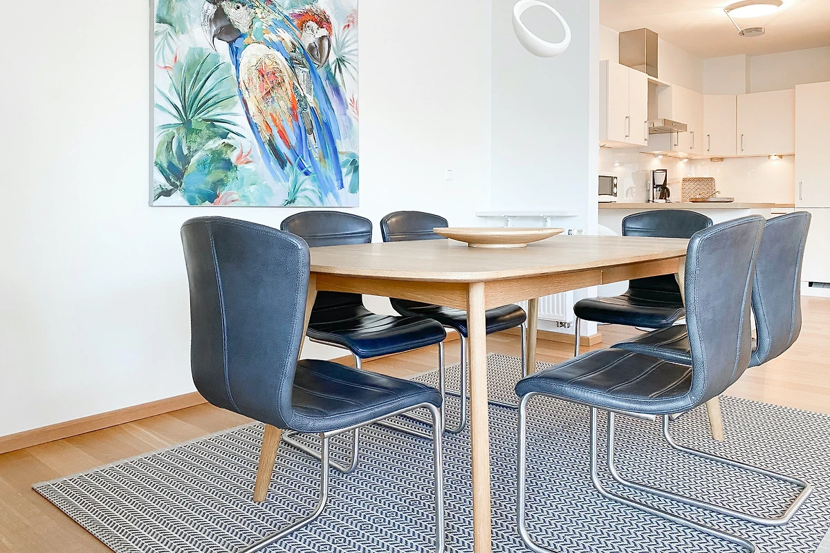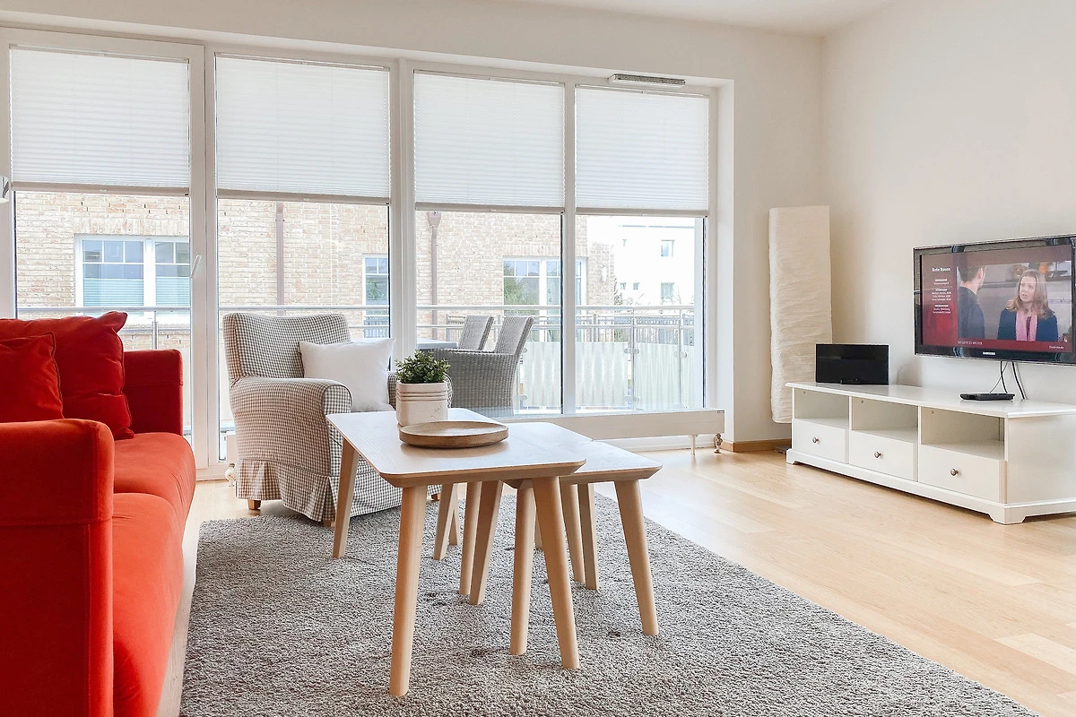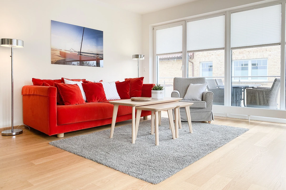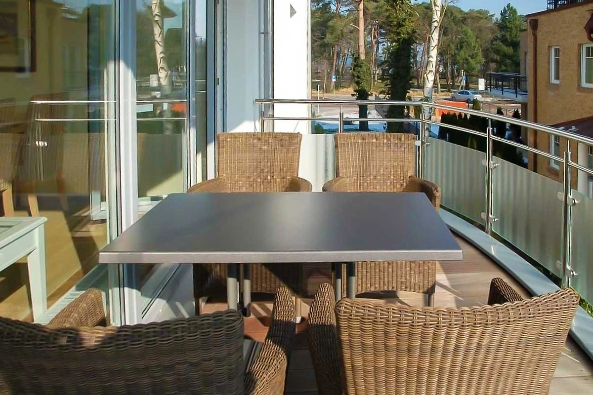 Die 92 qm grosse Wohnung befindet sich im ersten Obergeschoss und verfügt über zwei separate Schlafzimmer - ausgestattet mit Doppelbett (180x200) und zwei Einzelbetten (80x200) mit TV - [nbsp]ein komfortables Duschbad mit Fussbodenheizung sowie ein separates Gäste WC.[nbsp] Es gibt einen geschmackvollen Wohnbereich mit TV, Radio und WLAN, einen grosszügigen Essbereich und eine offene Einbauküche, bestens ausgestattet mit Mikrowelle, Backofen und Spülmaschine.[nbsp] Der grosszügige, überdachte Südbalkon bietet in östlicher Richtung einen schönen Blick auf den gegenüberliegenden Park und die Ostsee. Die grossen Fensterelemente und das verwendete Echtholzparkett in diesem Objekt sorgen für eine helle, freundliche Wohnatmosphäre. Ankommen und Wohlfühlen!