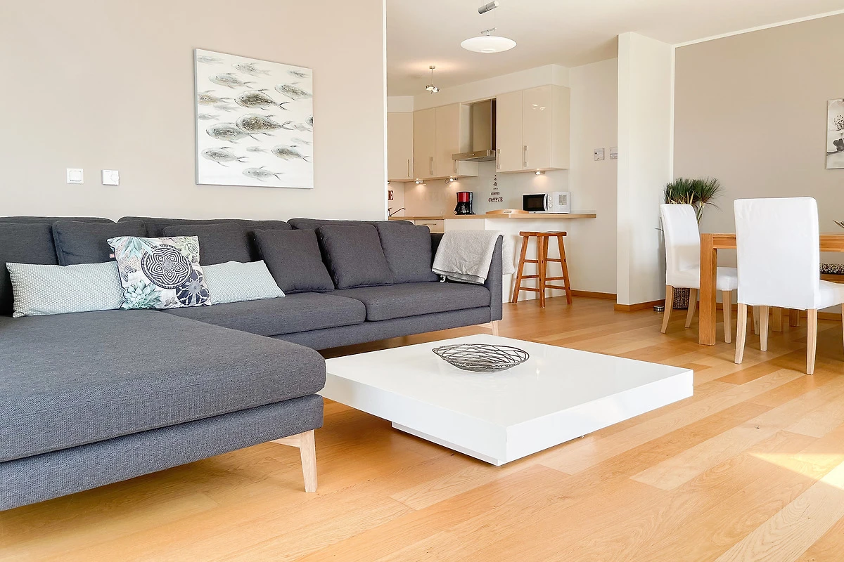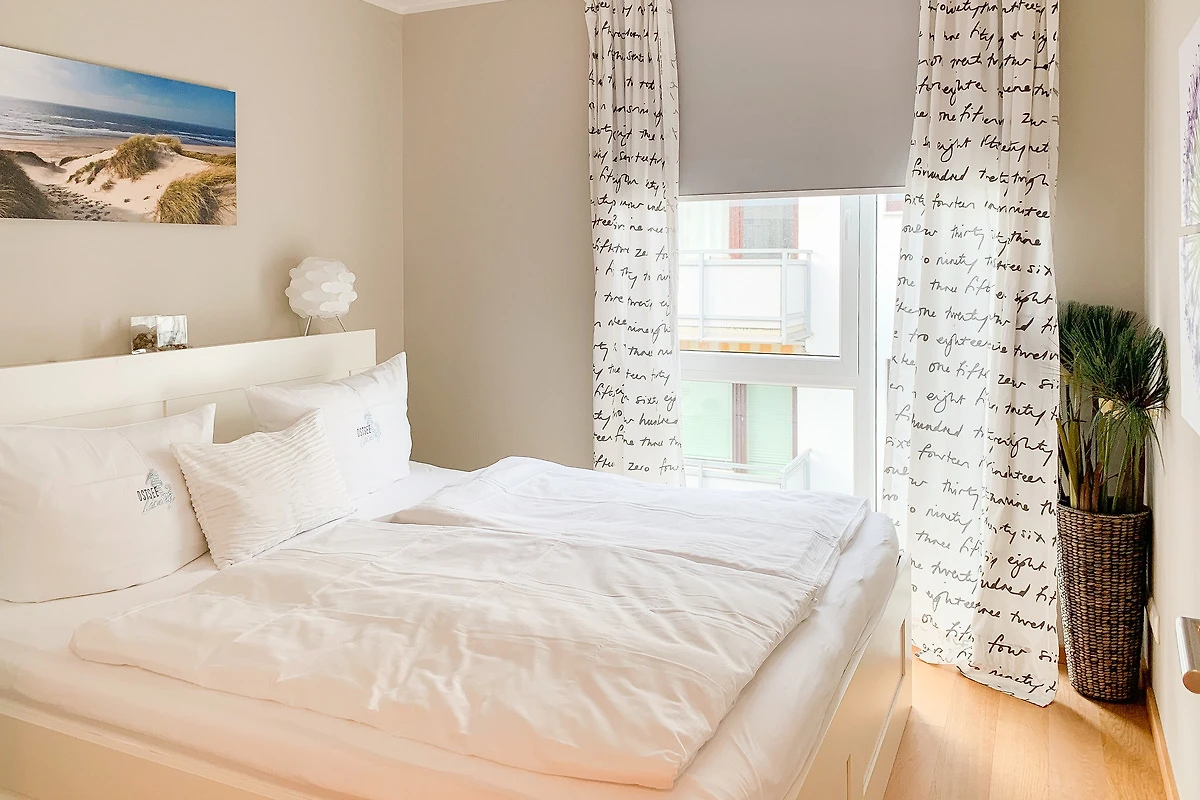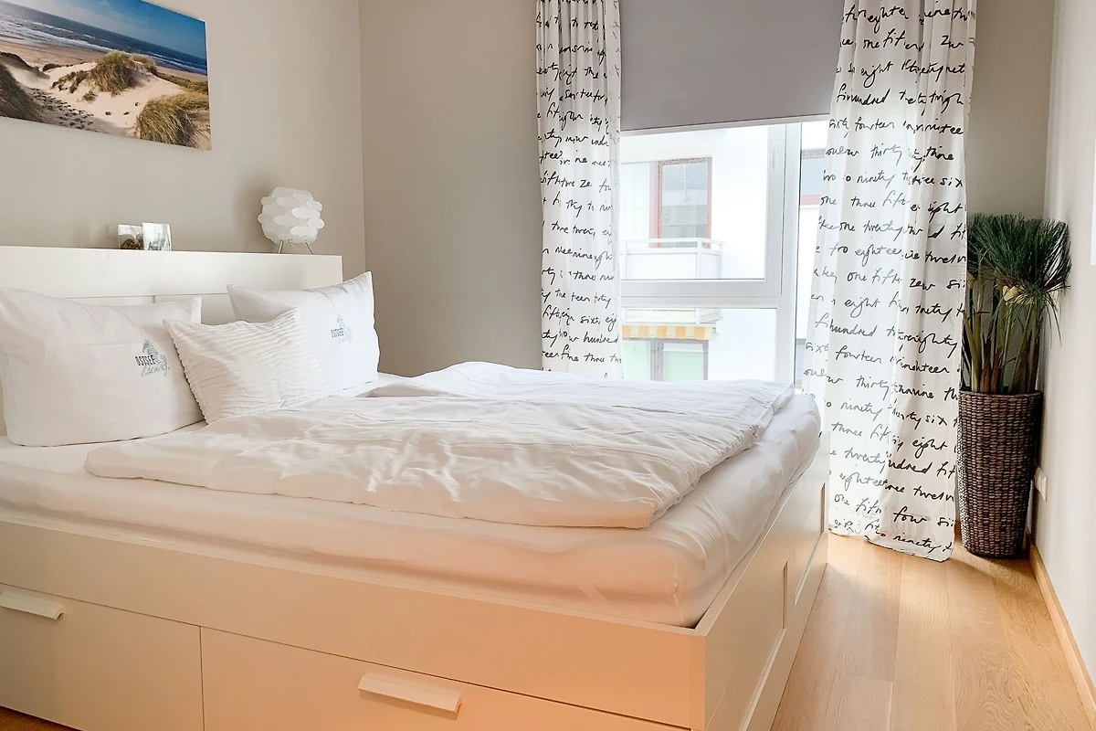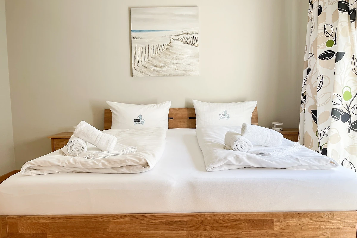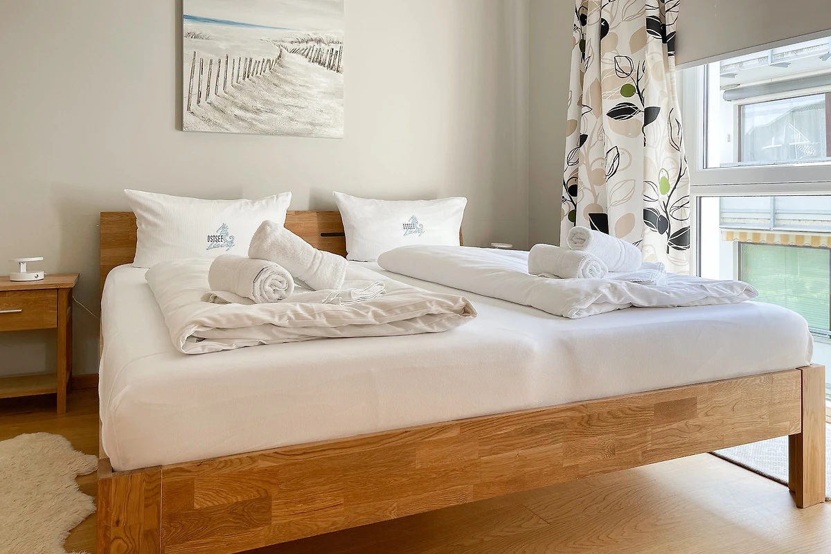 Die Ferienwohnung befindet sich im 1. OG und bietet mit 2 Schlafzimmern, einem grosszügigen Duschbad und separatem Gäste WC ausreichend Platz für 4 Personen auf über 90 qm Wohnfläche.[nbsp][nbsp]Grosse, bodentiefe Fenster sorgen für helle, sonnige Wohnräume, die mit hochwertigem Echtholzparkett und Fussbodenheizung ausgestattet sind. Die offene Einbauküche ist komplett ausgestattet und verfügt über Kühlschrank mit Gefrierfach, Kochfeld, Backofen und Spülmaschine. Der grosszügige [nbsp]Essbereich mit ausreichend Platz für 6 Personen und der geschmackvoll gestaltete Wohnbereich[nbsp] mit TV, Radio und WLAN bilden das Zentrum der Wohnung. Vom[nbsp] Nachmittag bis zu den Abendstunden lässt sich die Sonne auf dem teilweise überdachtem Westbalkon sehen.[nbsp][nbsp][nbsp]