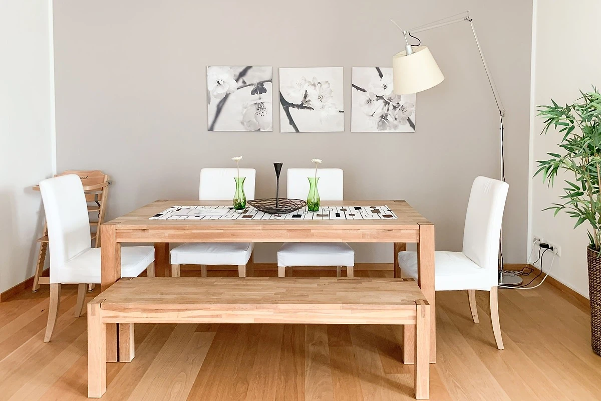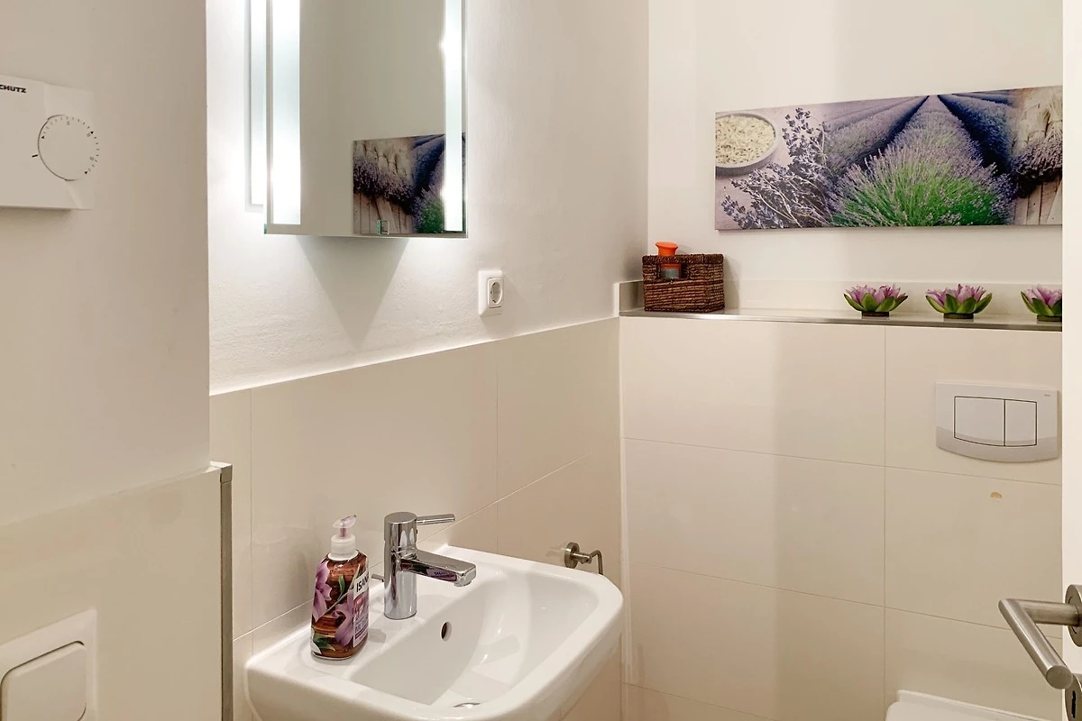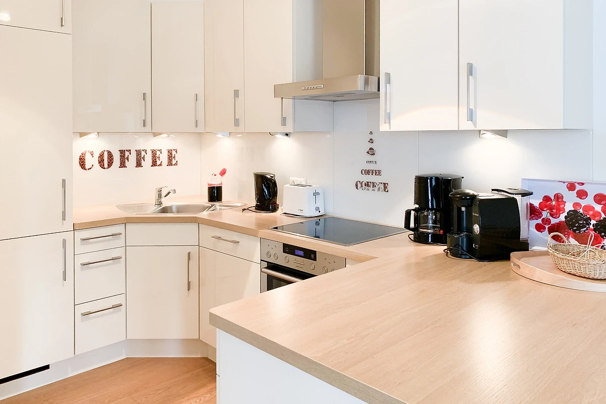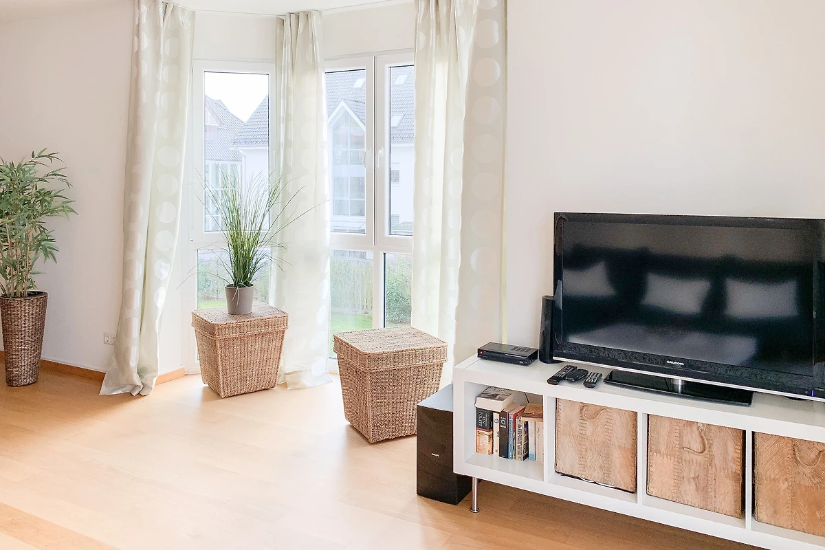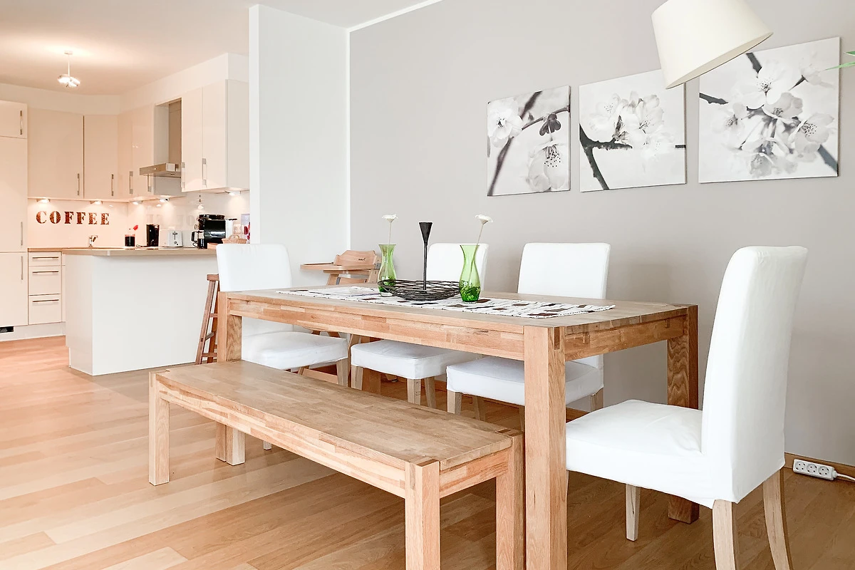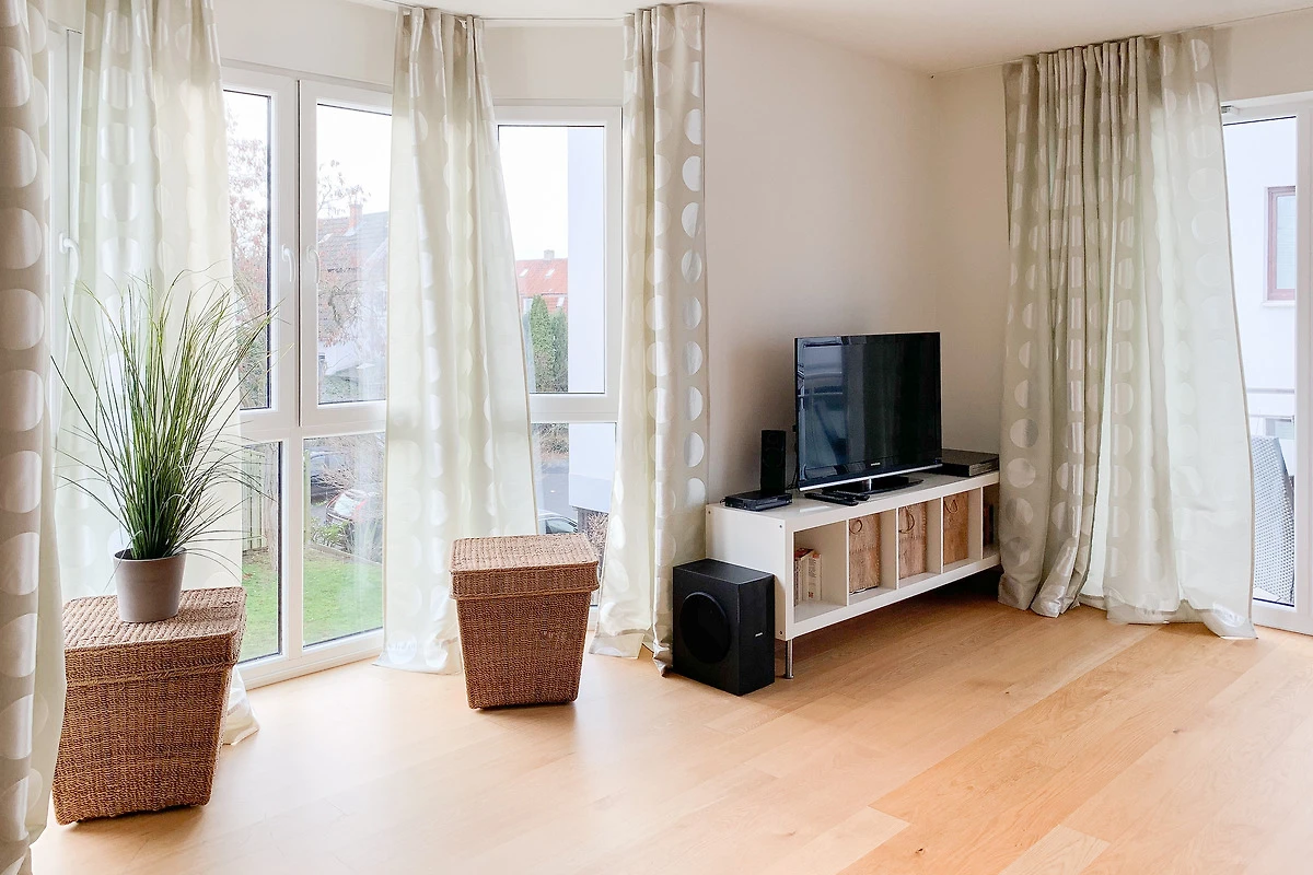 Die Ferienwohnung befindet sich im 1. OG und bietet mit 2 Schlafzimmern, einem grosszügigen Duschbad und separatem Gäste WC ausreichend Platz für 4 Personen auf über 90 qm Wohnfläche.[nbsp][nbsp]Grosse, bodentiefe Fenster sorgen für helle, sonnige Wohnräume, die mit hochwertigem Echtholzparkett und Fussbodenheizung ausgestattet sind. Die offene Einbauküche ist komplett ausgestattet und verfügt über Kühlschrank mit Gefrierfach, Kochfeld, Backofen und Spülmaschine. Der grosszügige [nbsp]Essbereich mit ausreichend Platz für 6 Personen und der geschmackvoll gestaltete Wohnbereich[nbsp] mit TV, Radio und WLAN bilden das Zentrum der Wohnung. Vom[nbsp] Nachmittag bis zu den Abendstunden lässt sich die Sonne auf dem teilweise überdachtem Westbalkon sehen.[nbsp][nbsp][nbsp]