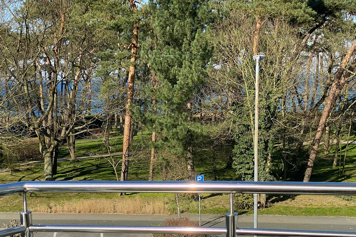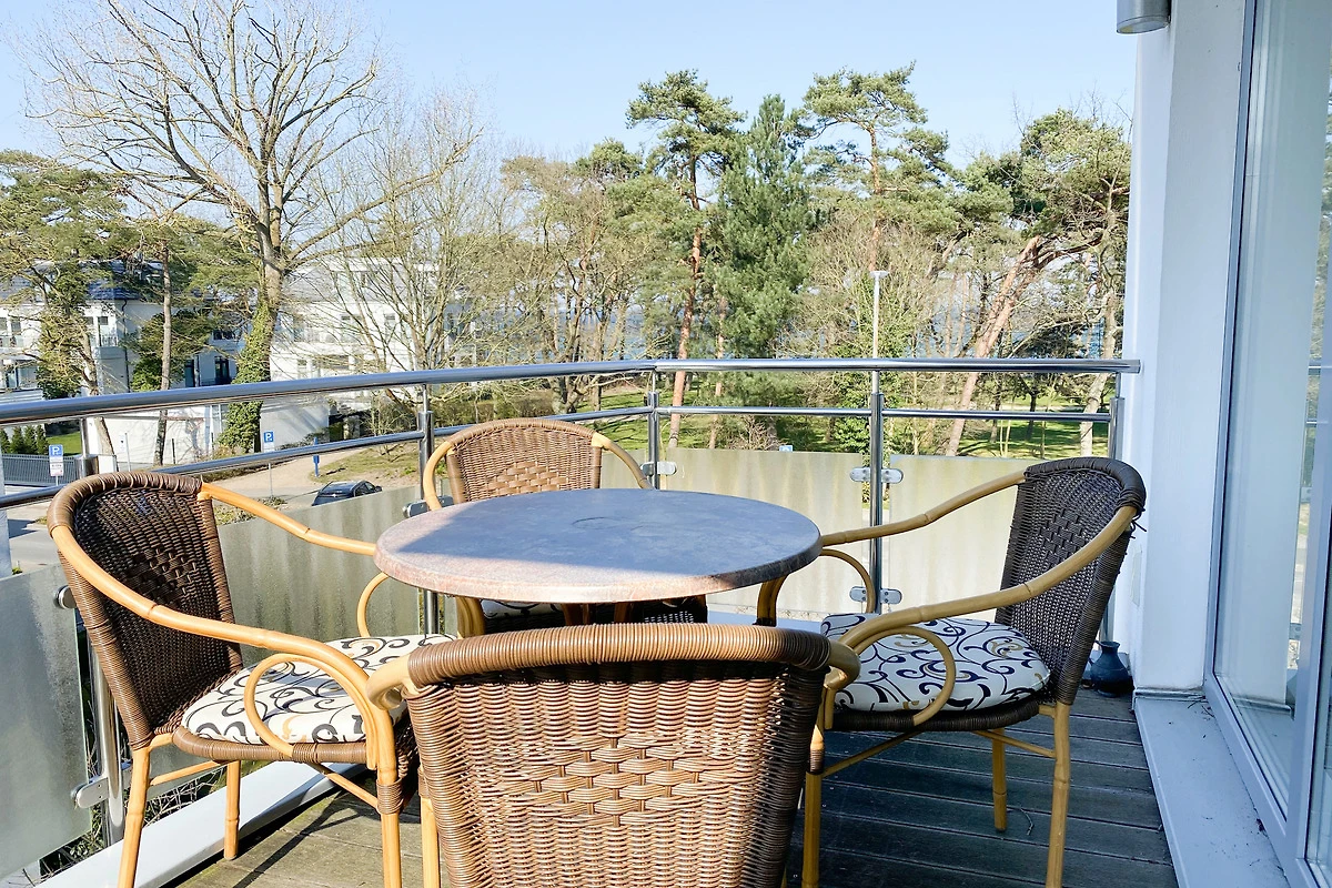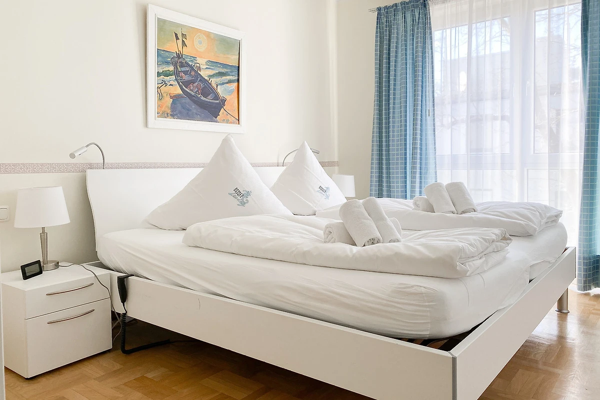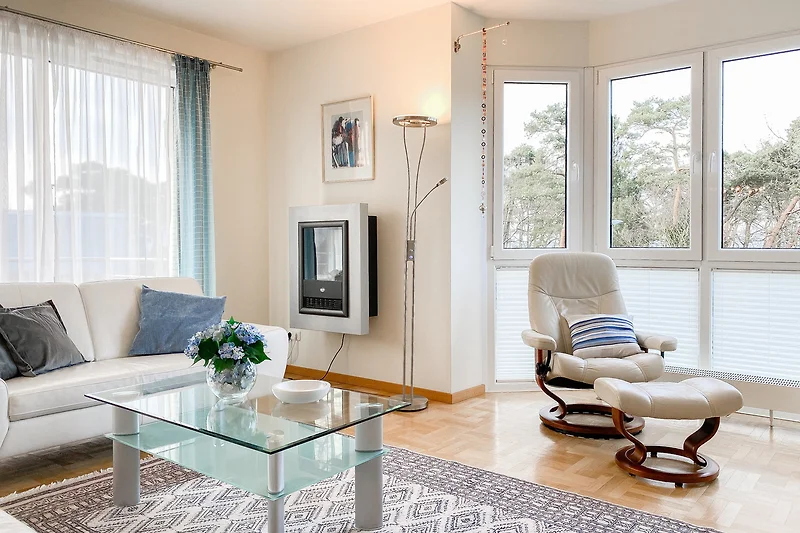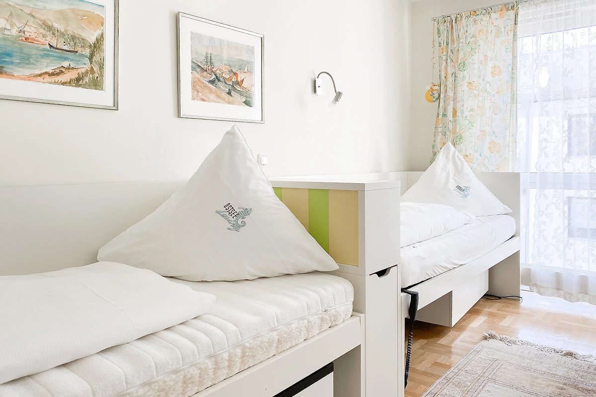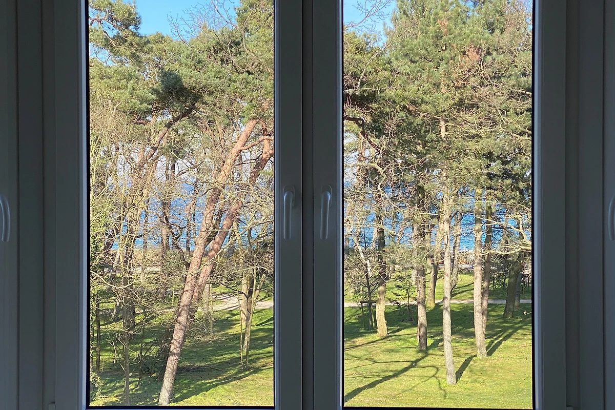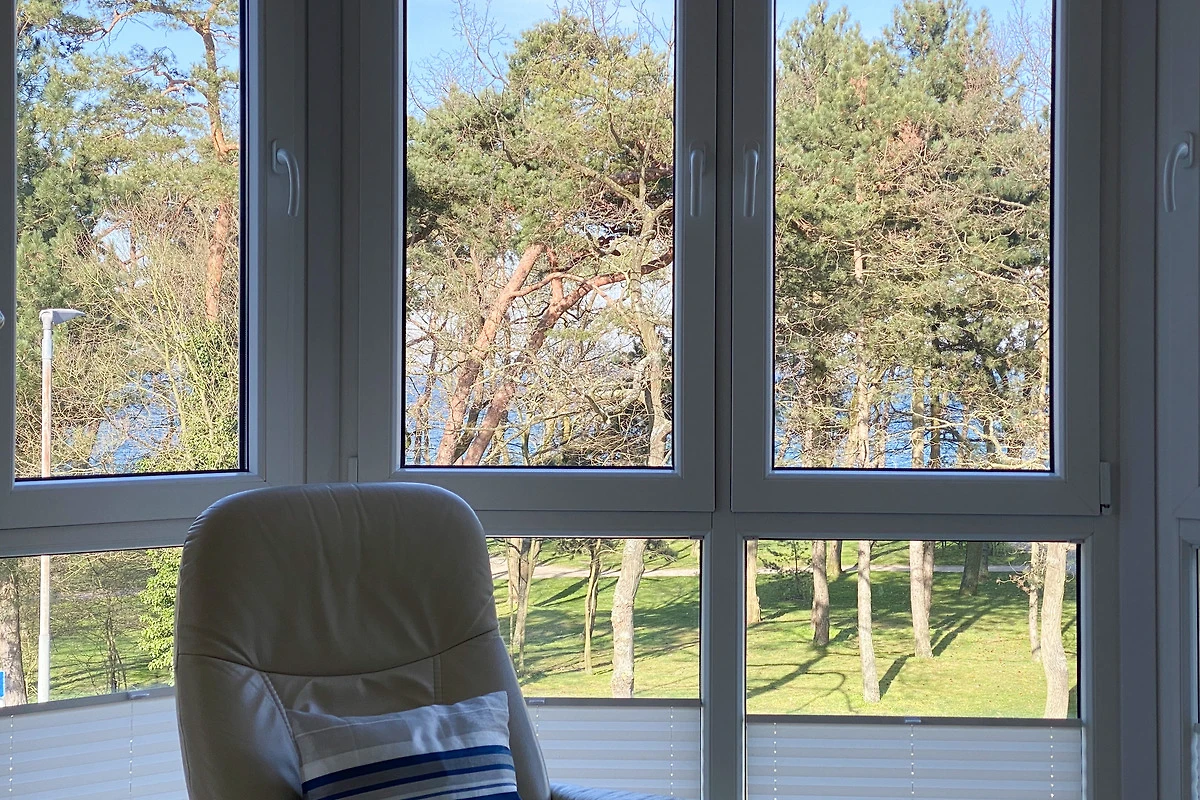 Die komfortable Wohnung im 2. Obergeschoss bietet mit 2 separaten Schlafzimmern, ausgestattet mit Doppelbett (180x200) mit elektrisch verstellbaren Rahmen und zwei Einzelbetten (90x200)[nbsp][nbsp]sowie 2 separaten Duschbädern ausreichend Platz für 4 Personen. In einem der Bäder ist zusätzlich eine Waschmaschine untergebracht. Es gibt eine offene, moderne Einbauküche mit Induktionsherd, Backofen, Mikrowelle, Geschirrspüler und einen grosszügigen Essbereich für 6 Personen. Der anschliessende Wohnbereich ist mit einer Ledergarnitur und einem Elektrokamin ausgestattet und eröffnet einen wunderschönen Ausblick über den gegenüberliegenden Park, teilweise durch das Grün bis zur Ostsee. Im Erker befindet sich ein gemütlicher Lesesessel. Auf dem vorgelagerten Balkon lässt sich wunderbar die Abendsonne bei einem Sundowner geniessen. Ein kostenloser Internetzugang über WLAN steht zur Verfügung.