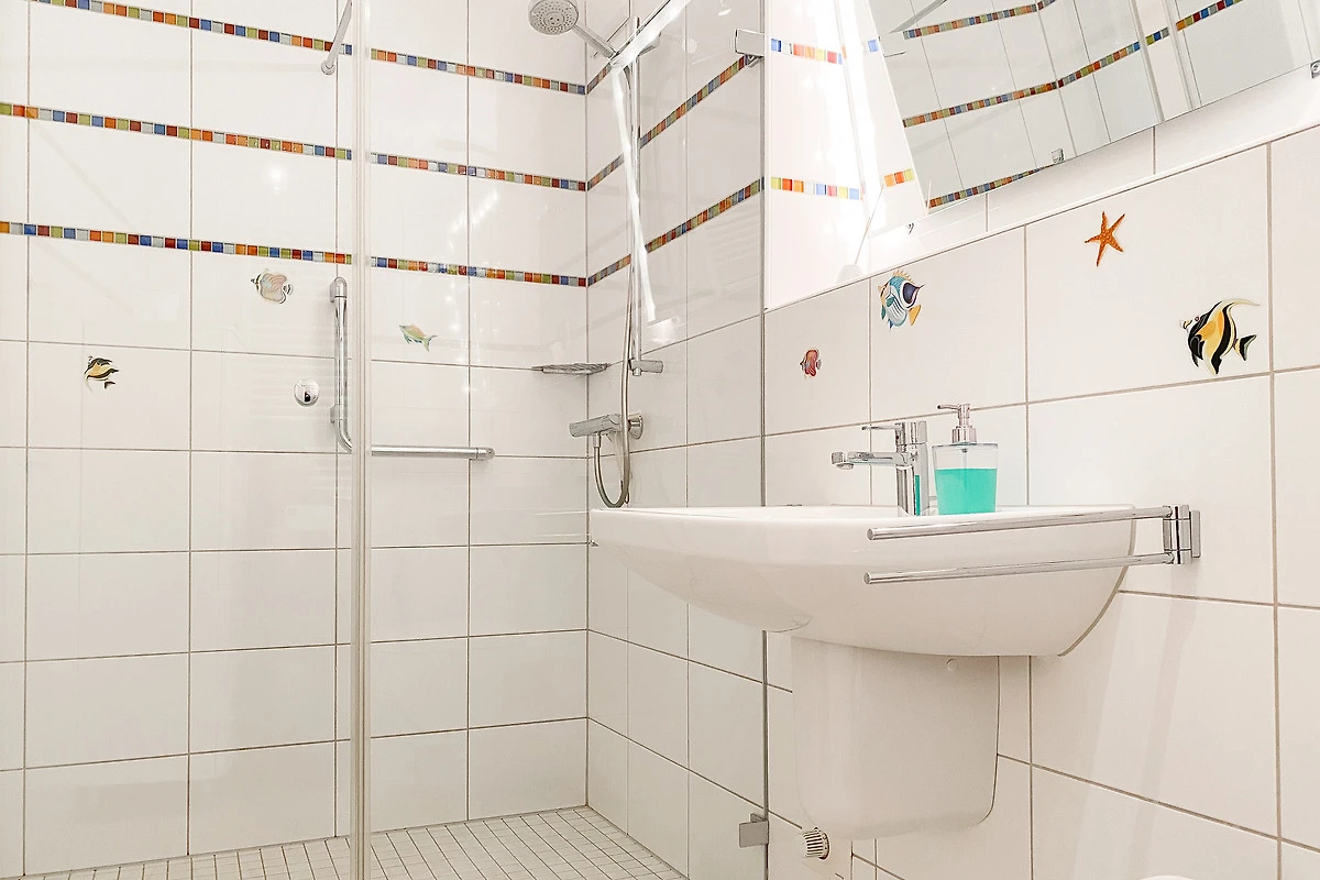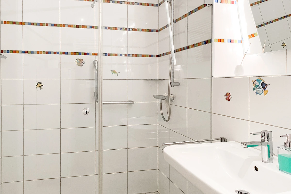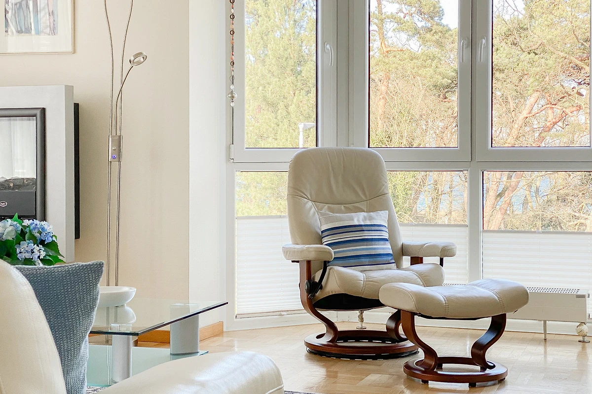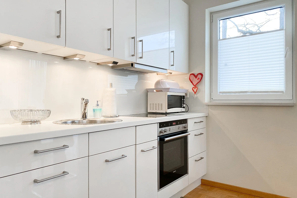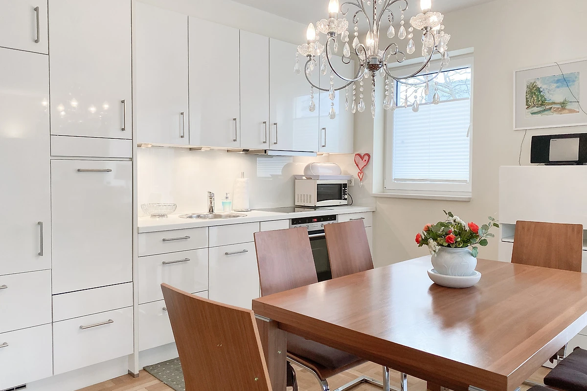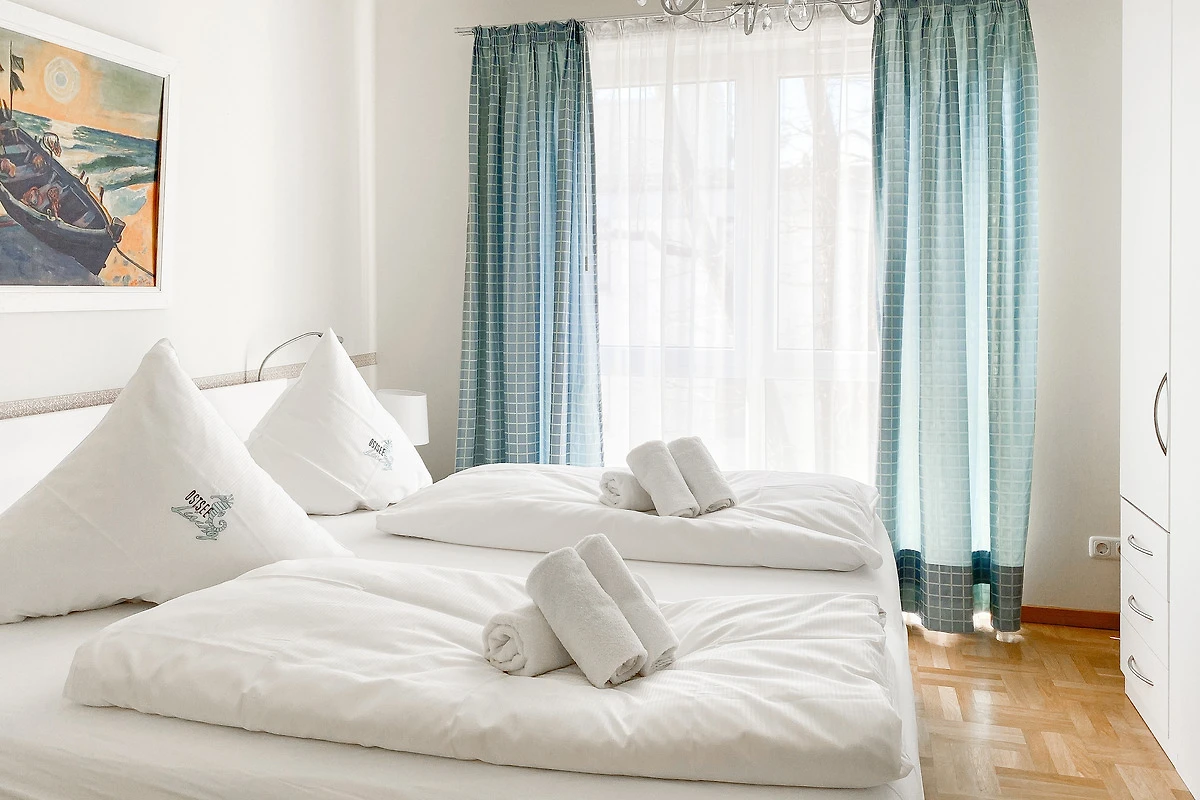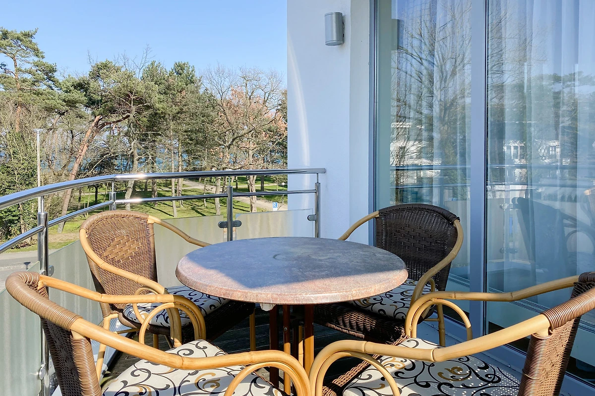Die komfortable Wohnung im 2. Obergeschoss bietet mit 2 separaten Schlafzimmern, ausgestattet mit Doppelbett (180x200) mit elektrisch verstellbaren Rahmen und zwei Einzelbetten (90x200)[nbsp][nbsp]sowie 2 separaten Duschbädern ausreichend Platz für 4 Personen. In einem der Bäder ist zusätzlich eine Waschmaschine untergebracht. Es gibt eine offene, moderne Einbauküche mit Induktionsherd, Backofen, Mikrowelle, Geschirrspüler und einen grosszügigen Essbereich für 6 Personen. Der anschliessende Wohnbereich ist mit einer Ledergarnitur und einem Elektrokamin ausgestattet und eröffnet einen wunderschönen Ausblick über den gegenüberliegenden Park, teilweise durch das Grün bis zur Ostsee. Im Erker befindet sich ein gemütlicher Lesesessel. Auf dem vorgelagerten Balkon lässt sich wunderbar die Abendsonne bei einem Sundowner geniessen. Ein kostenloser Internetzugang über WLAN steht zur Verfügung.