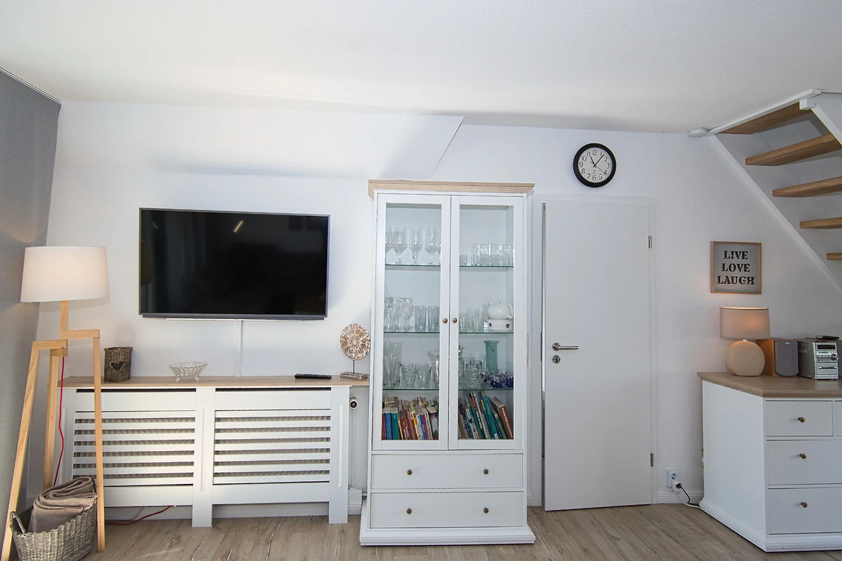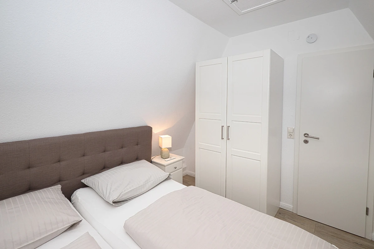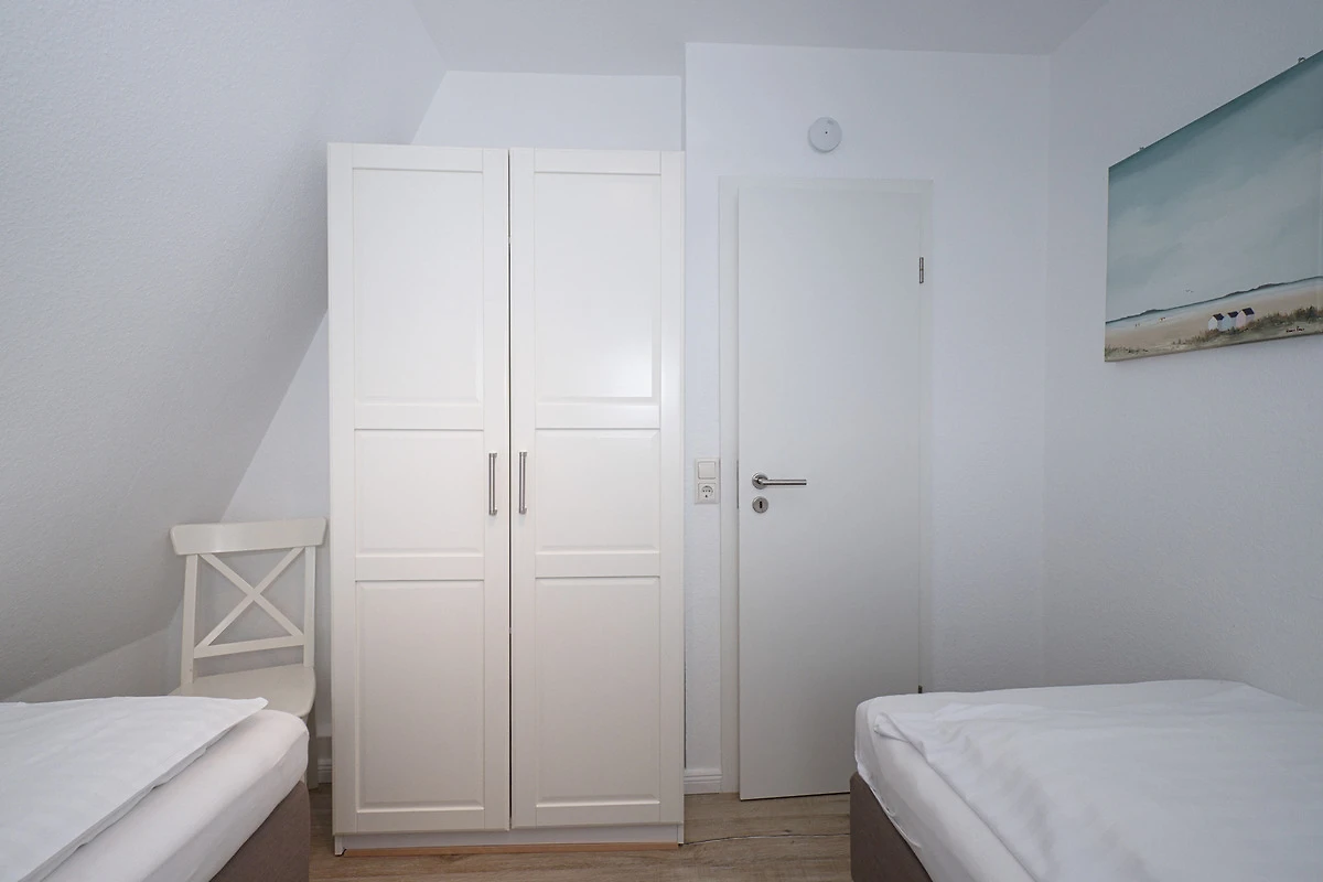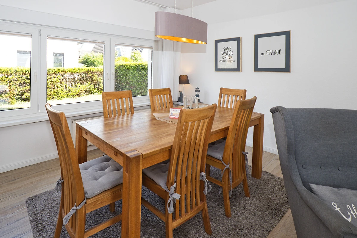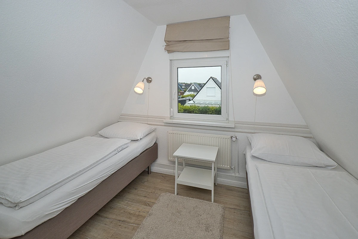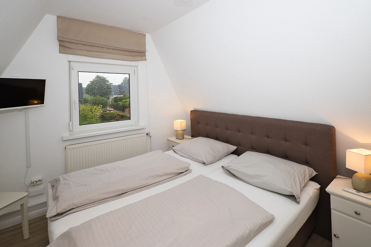 Ringwall 47, 4-Raum, ca. 74m², bis zu 6 Personen, Urlaub ganz individuell und Strandnah. Das moderne Ferienhaus direkt hinter dem Deich mit einer grosszügiger Aufteilung, viel Komfort und eigenem Garten in ruhiger Lage. Sie werden im Eingangsbereich (verglaster Windfang) über den Flur mit Zugang zum Duschbad (Dusche/WC), zur separaten und interessant aufgeteilten Küche (mit Waschmaschine), im hellen und sehr gemütlichen Wohn- und Essbereich empfangen. Von hier geht es auch in den sehr schönen sonnigen Garten und über ein Holztreppe ins 1.OG (mit Treppenschutzgitter am oberen Ende). Hier erwarten Sie 3 gut ausgestattete Schlafzimmer (eins mit einem zusätzlichen TV) mit passgenauen Einbaumöbeln und Schlafgelegenheiten für bis zu 6 Personen. In einem Schlafbereich befindet sich sogar eine Waschmöglichkeit. 1 weiteres Gäste-WC befindet sich ebenfalls auf der Etage. Familien sind Herzlich willkommen.