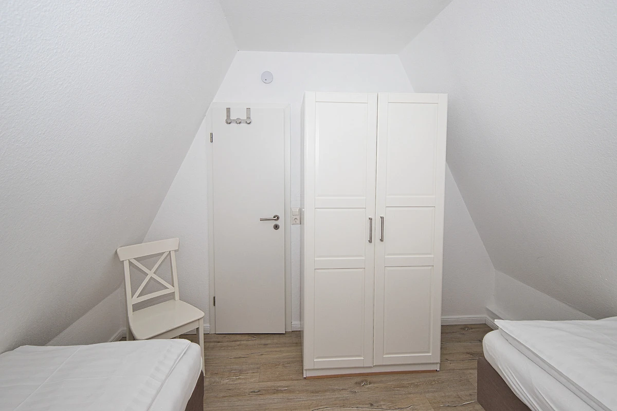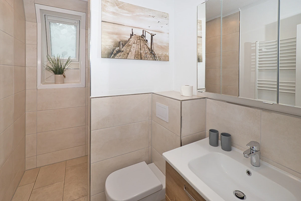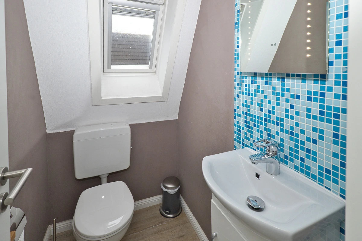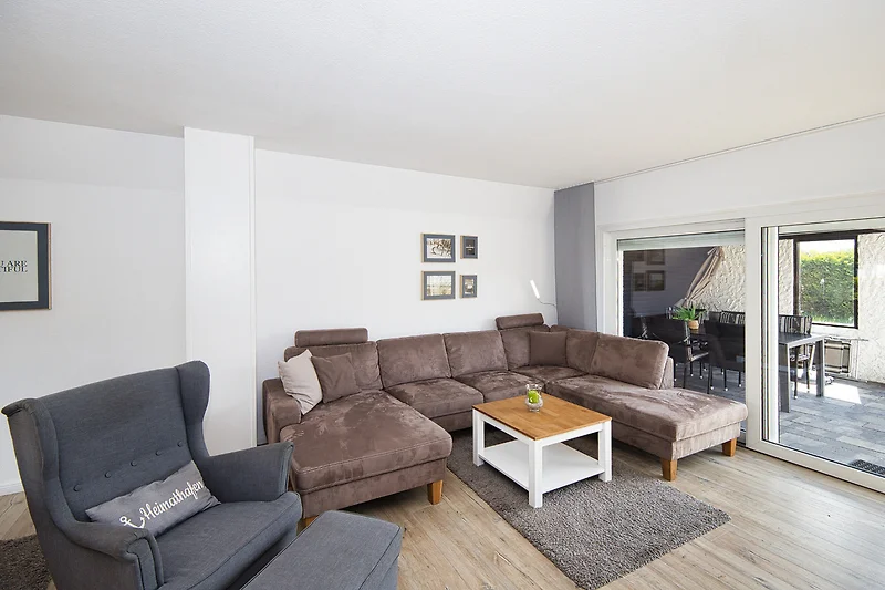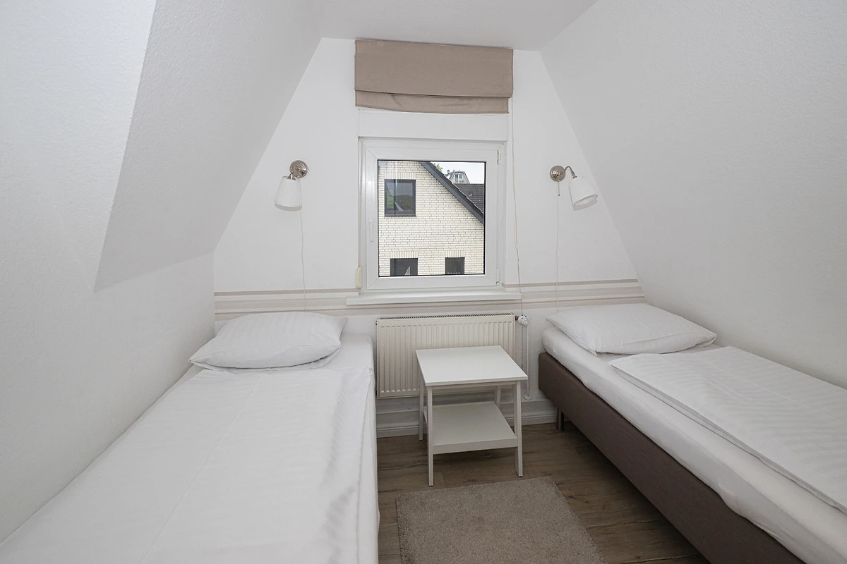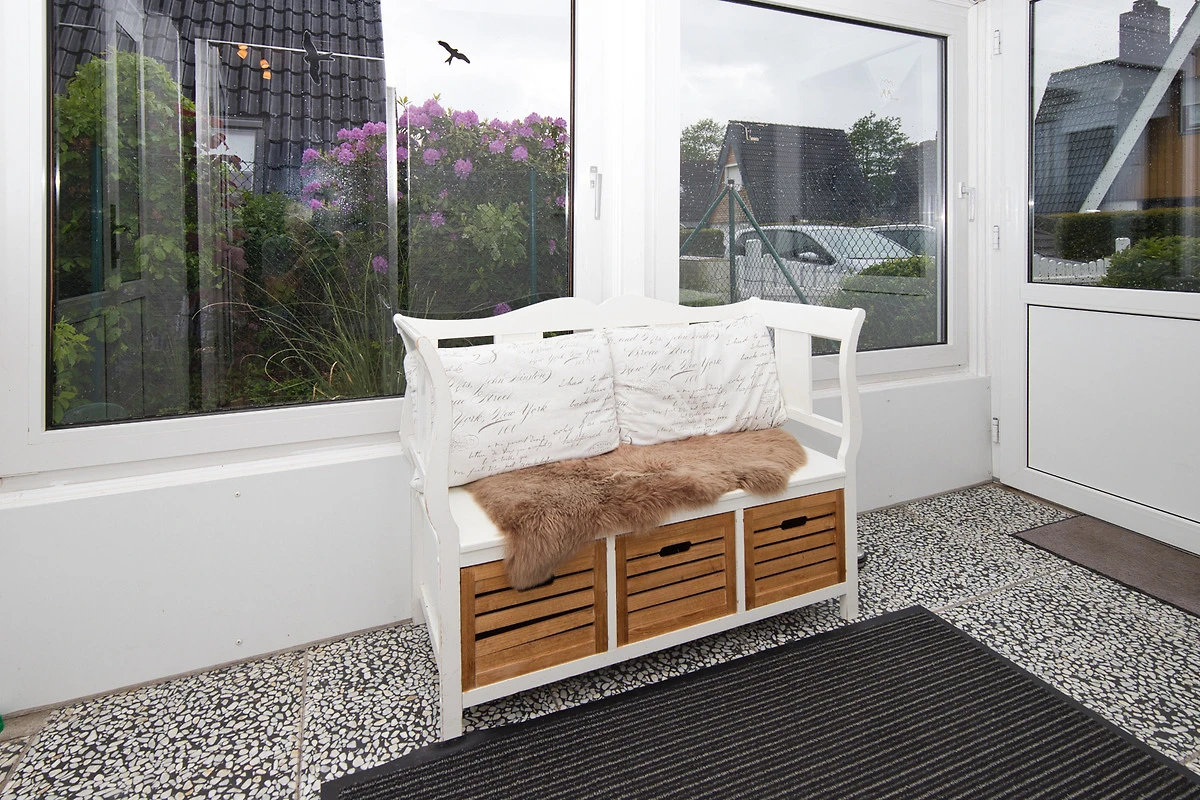 Ringwall 47, 4-Raum, ca. 74m², bis zu 6 Personen, Urlaub ganz individuell und Strandnah. Das moderne Ferienhaus direkt hinter dem Deich mit einer grosszügiger Aufteilung, viel Komfort und eigenem Garten in ruhiger Lage. Sie werden im Eingangsbereich (verglaster Windfang) über den Flur mit Zugang zum Duschbad (Dusche/WC), zur separaten und interessant aufgeteilten Küche (mit Waschmaschine), im hellen und sehr gemütlichen Wohn- und Essbereich empfangen. Von hier geht es auch in den sehr schönen sonnigen Garten und über ein Holztreppe ins 1.OG (mit Treppenschutzgitter am oberen Ende). Hier erwarten Sie 3 gut ausgestattete Schlafzimmer (eins mit einem zusätzlichen TV) mit passgenauen Einbaumöbeln und Schlafgelegenheiten für bis zu 6 Personen. In einem Schlafbereich befindet sich sogar eine Waschmöglichkeit. 1 weiteres Gäste-WC befindet sich ebenfalls auf der Etage. Familien sind Herzlich willkommen.