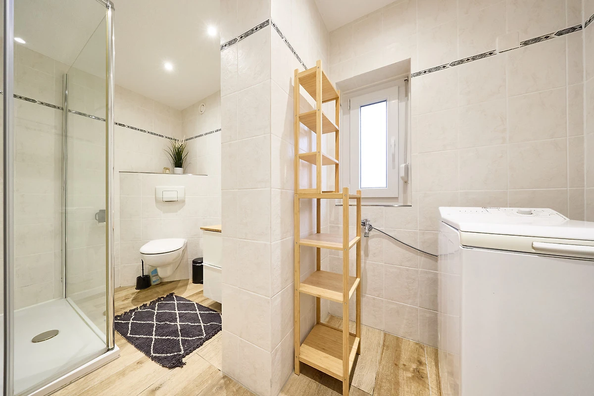 Duschbad mit ebenerdiger Dusche, WC, Waschtisch und Waschmaschine und Tageslichtfenster