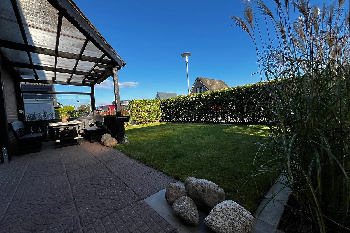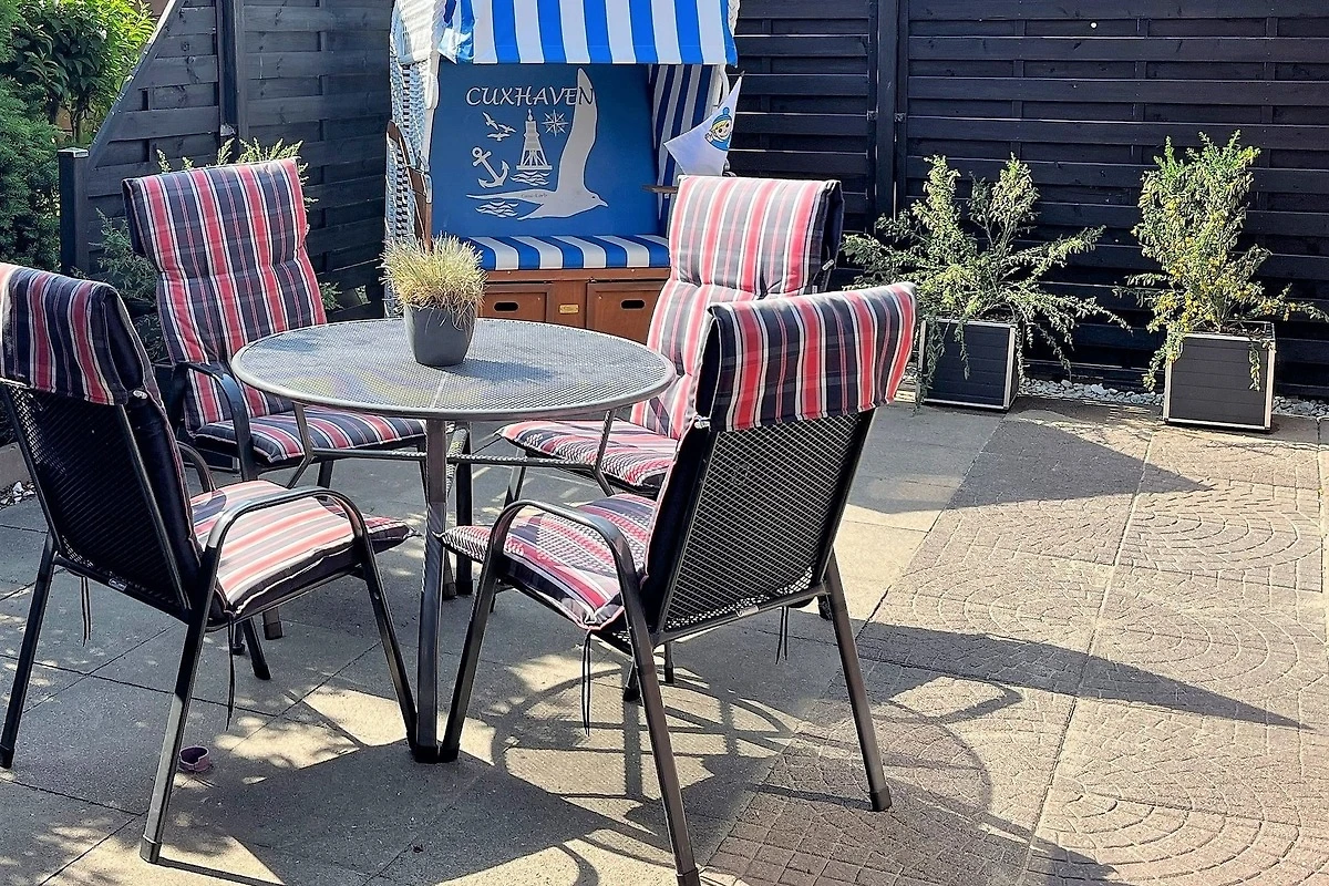 Terrasse mit Gartenmöbeln, Strandkorb zur Westseite