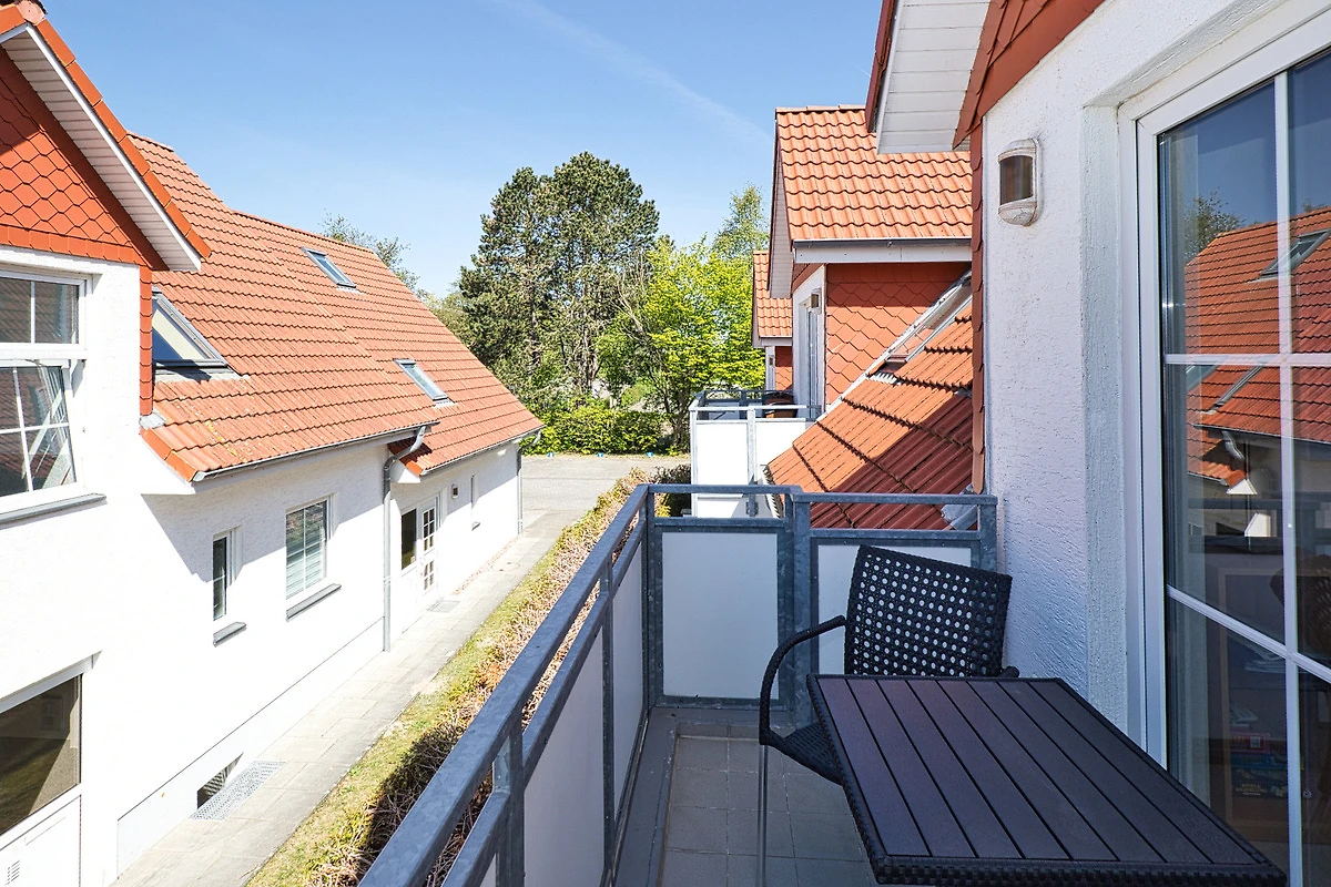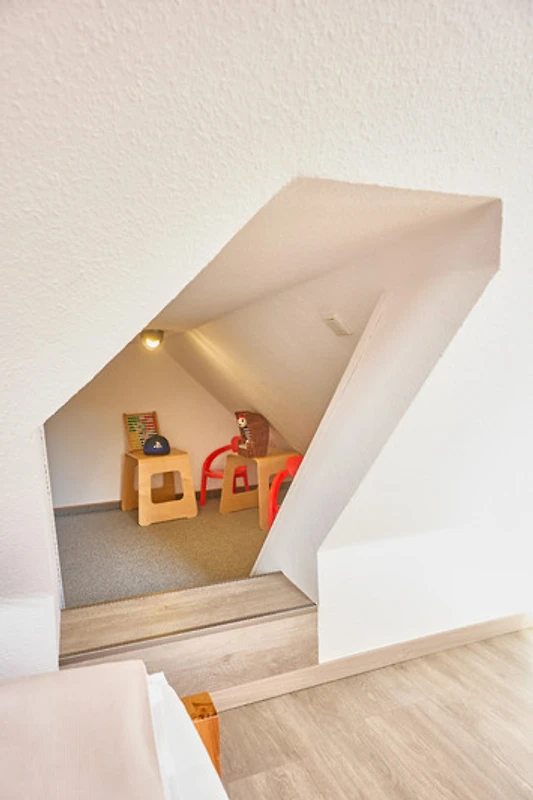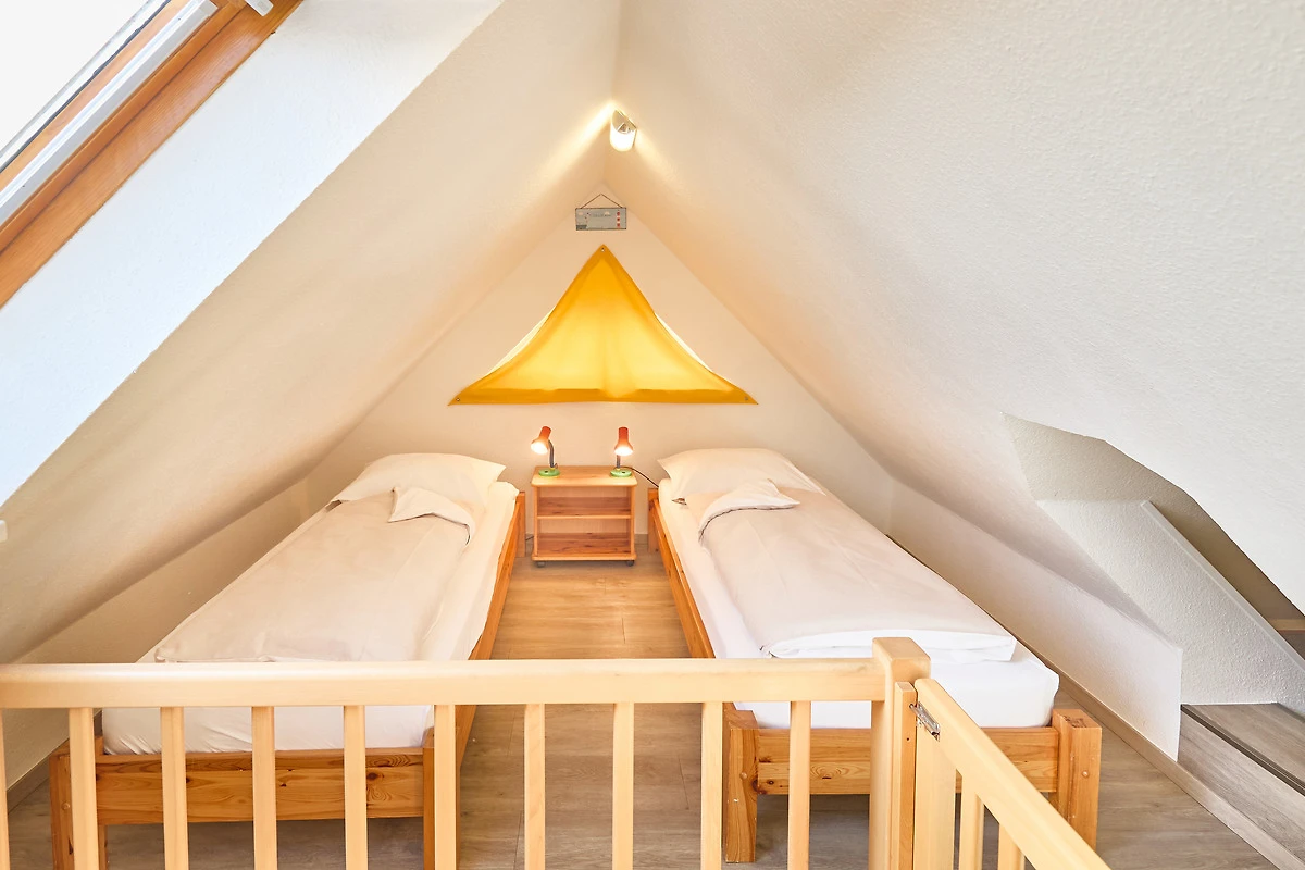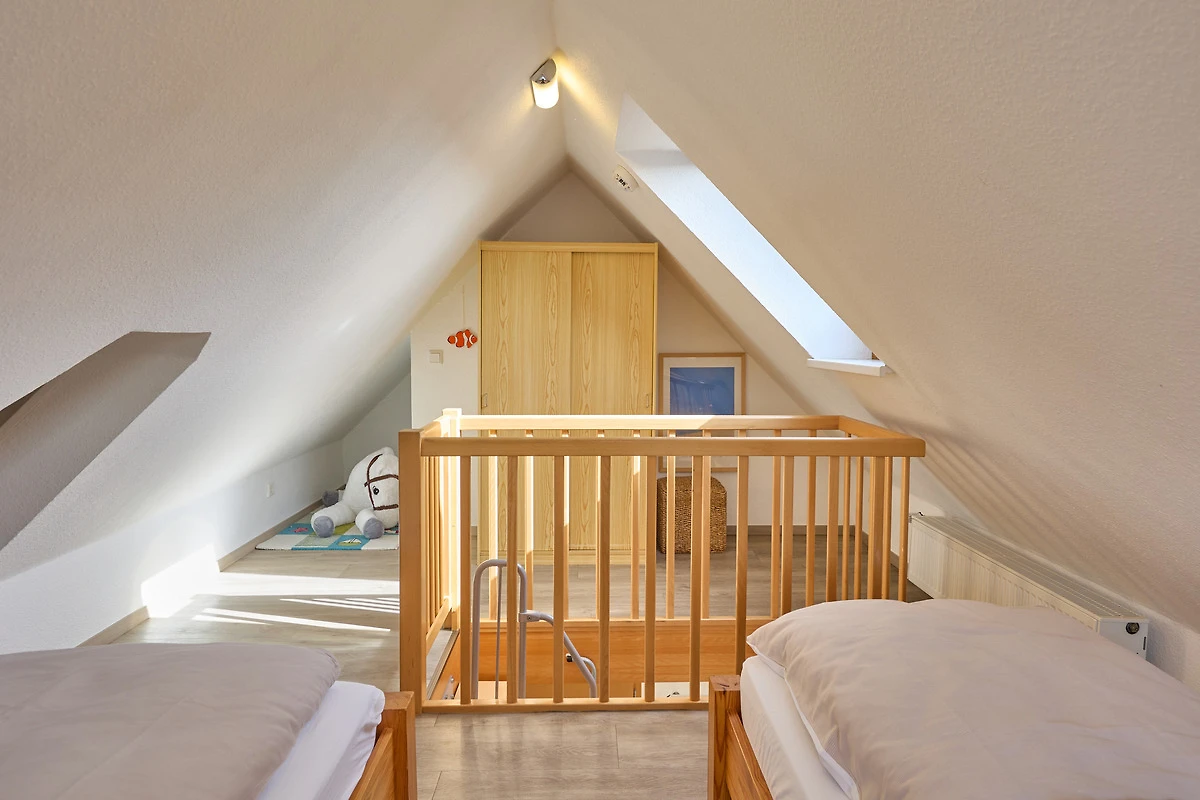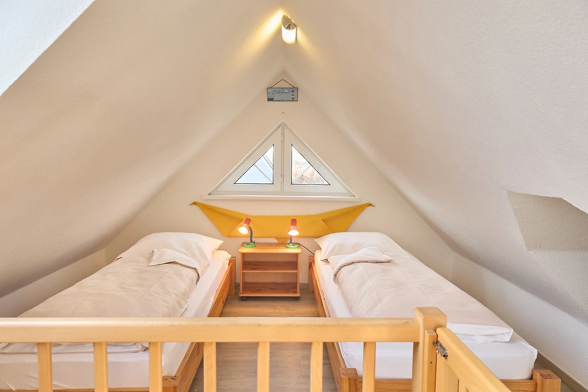 Neptun 12, Whg. 4, 3-Raum, 1.OG + DG, ca. 64m², bis zu 4 Personen, Kleiner Spielbereich für die "Kleinen" im Dachgeschoss. Die Ferienwohnung ist für bis zu 4 Personen geeignet und ist aufgeteilt mit einem separaten Schlafzimmer, mit einem Doppelbett (im 1.OG), einem "Kinderzimmer" (auch für Grosse) mit 2 Einzelbetten und einem Spielbereich für die "Kleinen" (im ausgebauten Dachgeschoss, ein fest eingebautes Treppenschutzgitter ist oberhalb der Treppe vorhanden), einem hellen Duschbad/WC, dem Wohnbereich mit Zugang zum Balkon und dem Essbereich mit der komfortablen Einbauküche. Der gemütliche und sonnige Balkon, mit Balkonmöbeln lädt zum urlauben ein.
