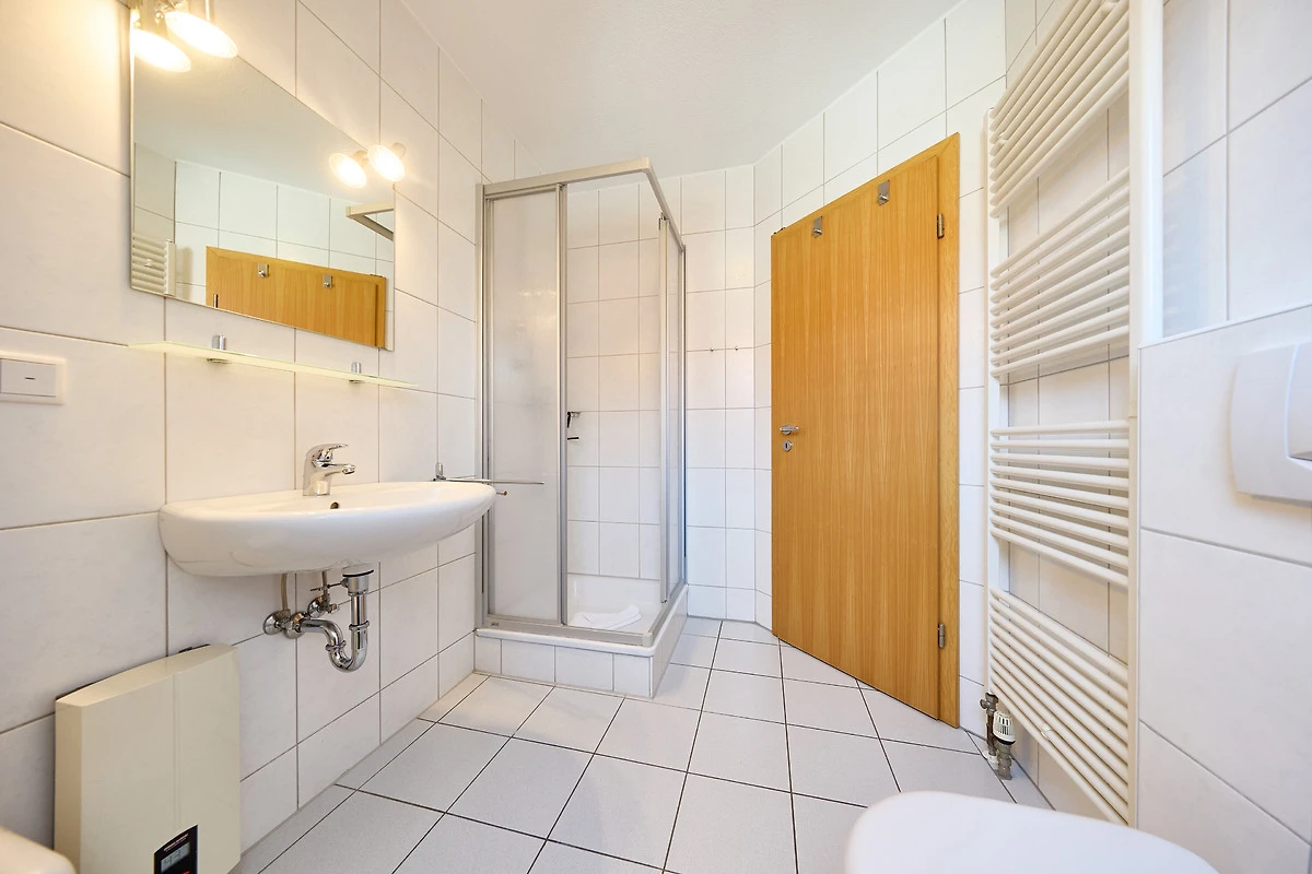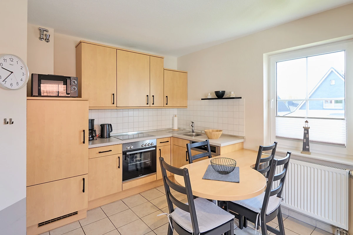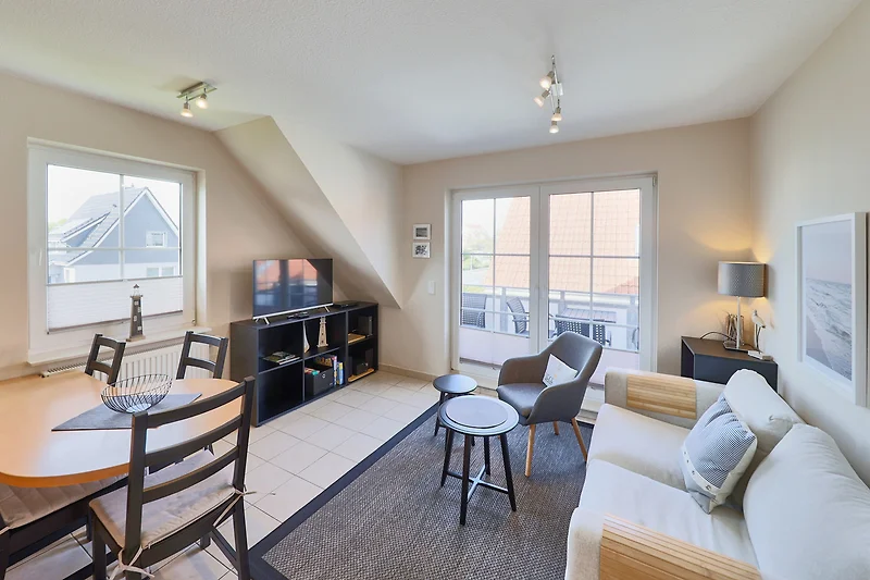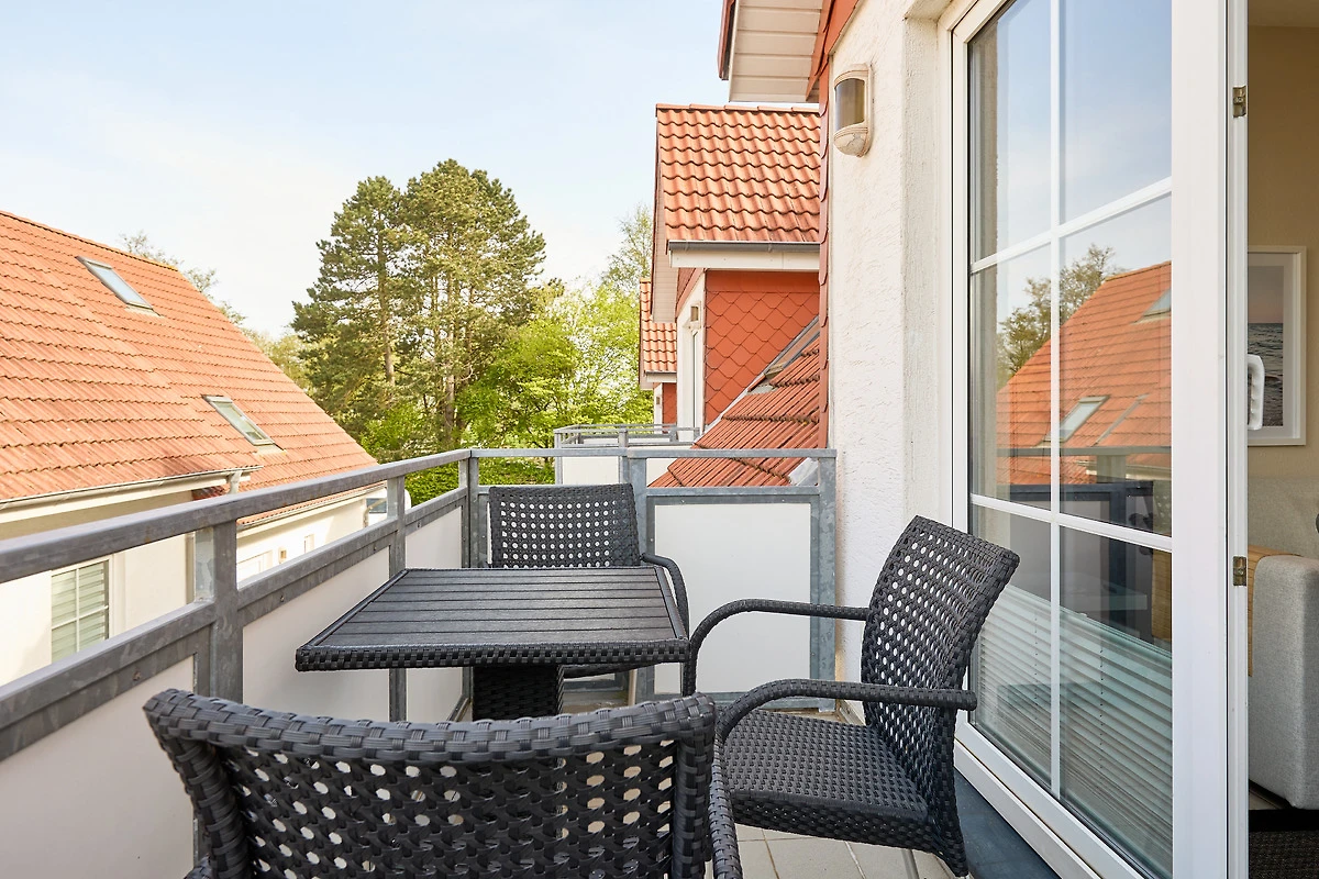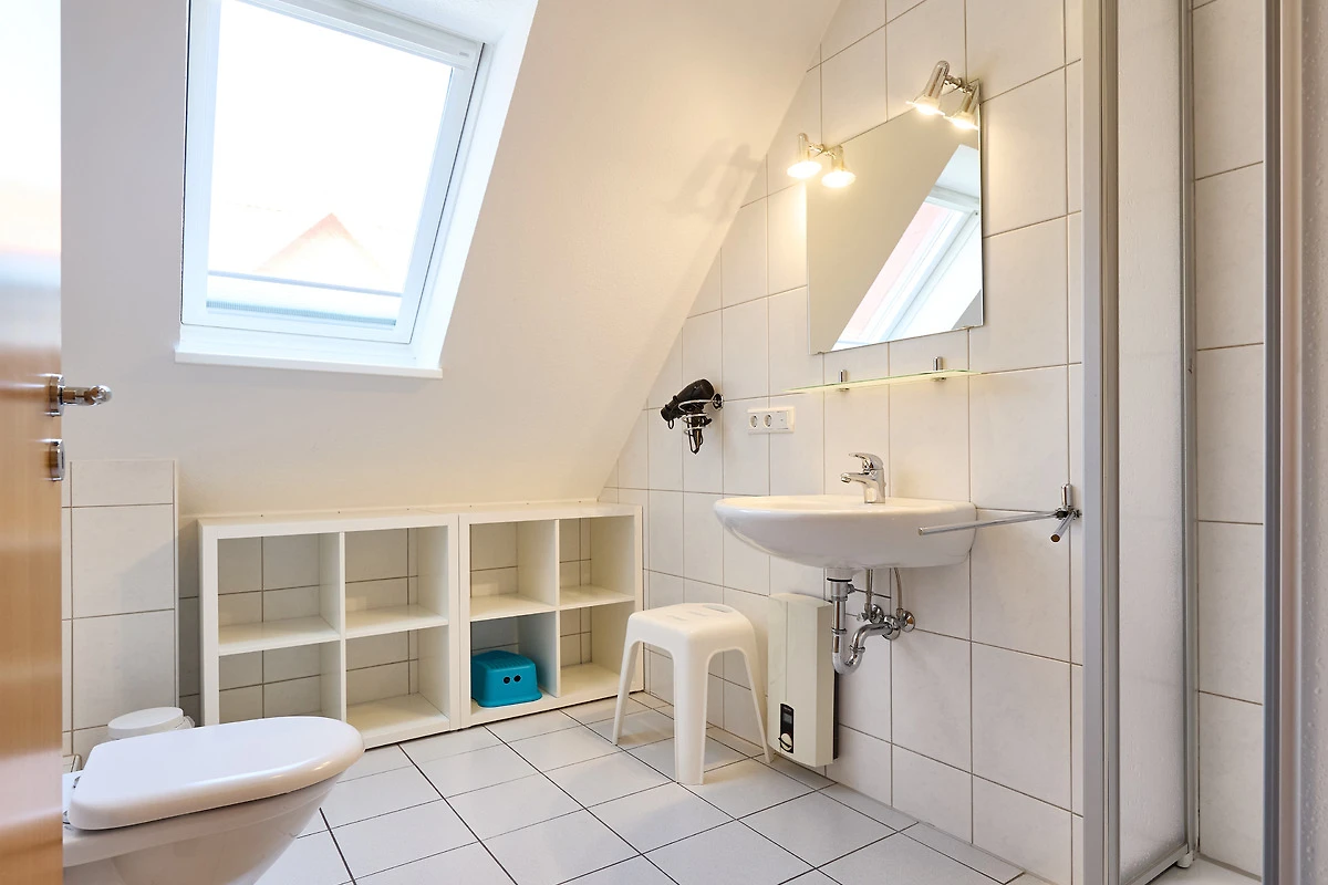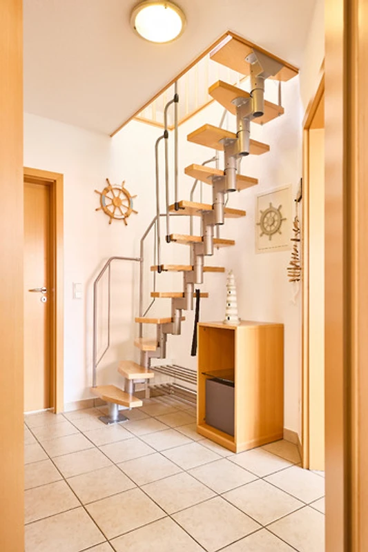 Neptun 12, Whg. 4, 3-Raum, 1.OG + DG, ca. 64m², bis zu 4 Personen, Kleiner Spielbereich für die "Kleinen" im Dachgeschoss. Die Ferienwohnung ist für bis zu 4 Personen geeignet und ist aufgeteilt mit einem separaten Schlafzimmer, mit einem Doppelbett (im 1.OG), einem "Kinderzimmer" (auch für Grosse) mit 2 Einzelbetten und einem Spielbereich für die "Kleinen" (im ausgebauten Dachgeschoss, ein fest eingebautes Treppenschutzgitter ist oberhalb der Treppe vorhanden), einem hellen Duschbad/WC, dem Wohnbereich mit Zugang zum Balkon und dem Essbereich mit der komfortablen Einbauküche. Der gemütliche und sonnige Balkon, mit Balkonmöbeln lädt zum urlauben ein.