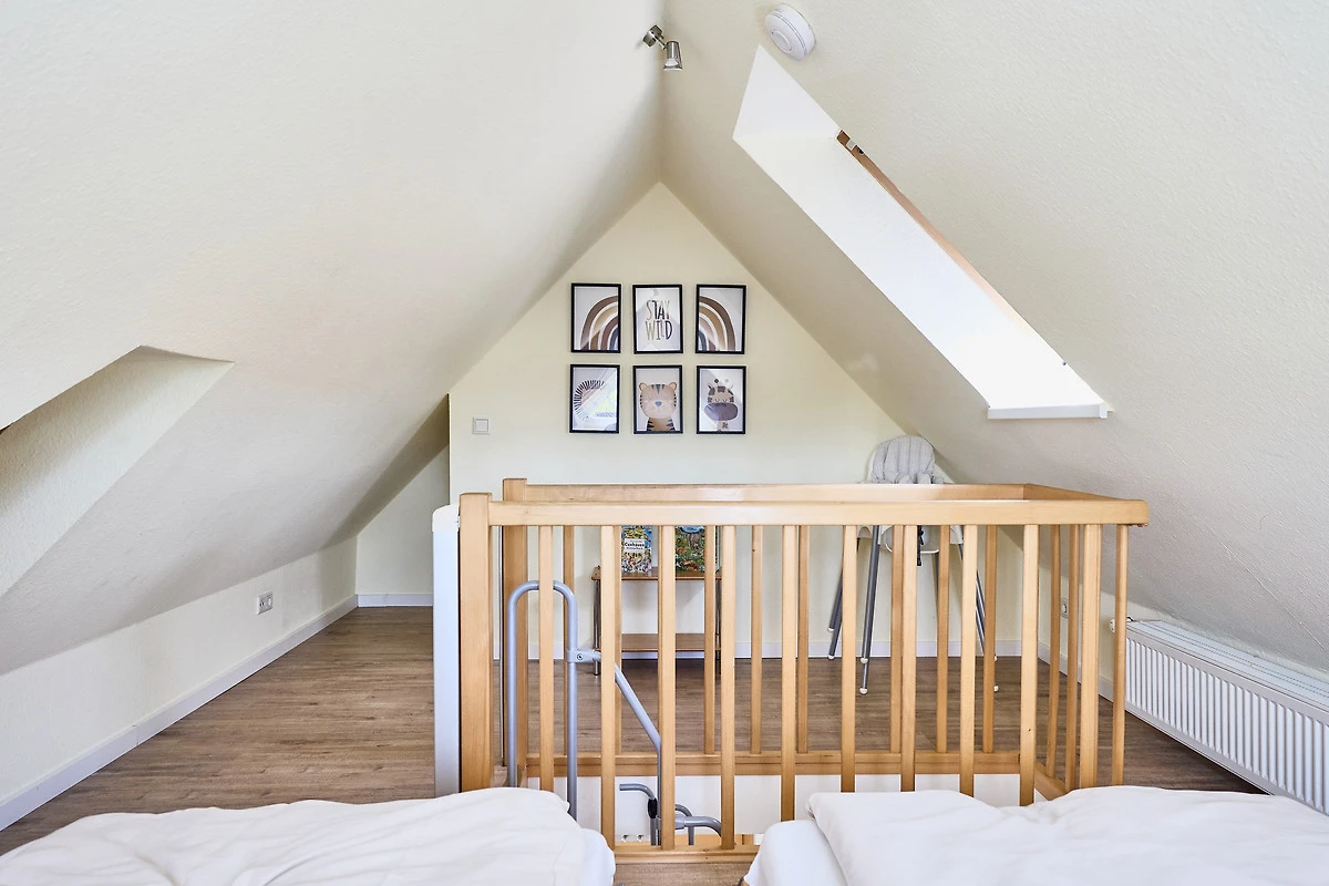Die geräumige 3-Raum-Ferienwohnung erstreckt sich über ca. 64m² und bietet Platz für bis zu 4 Personen. Sie verfügt über ein separates Schlafzimmer mit einem gemütlichen Doppelbett sowie ein "Kinderzimmer" mit zwei Einzelbetten im Dachgeschoss. Für die kleinen Gäste gibt es einen speziellen Spielbereich im ausgebauten Dachgeschoss, wo sie sich austoben können.