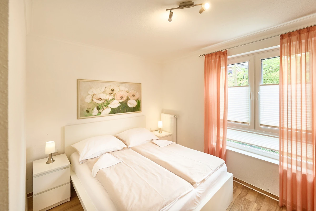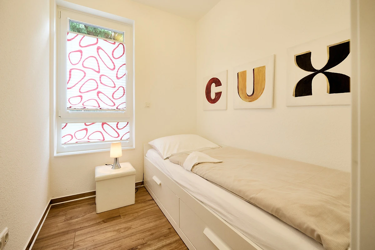 Die Ferienwohnung verfügt über zwei separate Schlafzimmer für insgesamt 3 Personen, die einen ruhigen Rückzugsort nach einem Tag am Strand bieten. Die Aufteilung eignet sich gut für Paare mit Kind oder Gäste, die getrennte Schlafbereiche schätzen.
