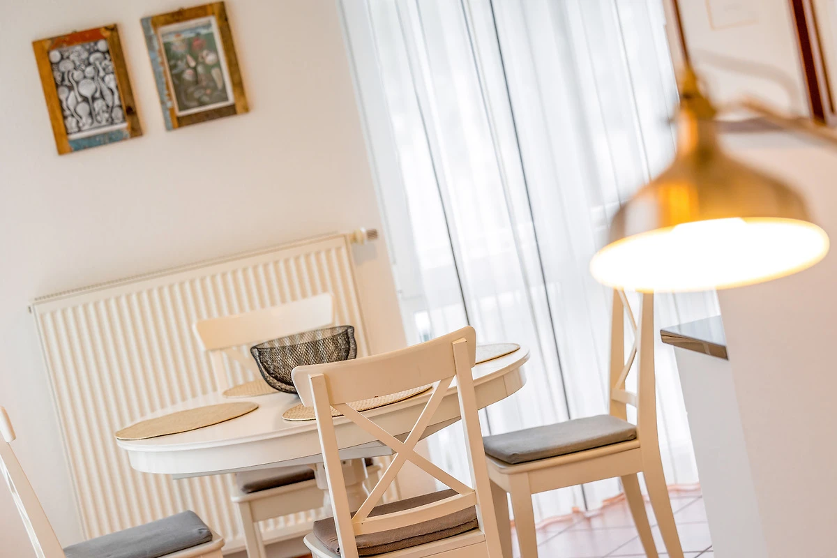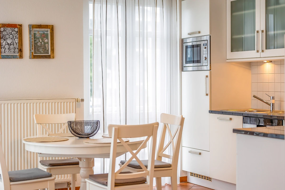 Der moderne und helle Küchenbereich ist zum Wohnzimmer hin komplett offen und bietet am runden Esszimmertisch Platz für 4 Personen.