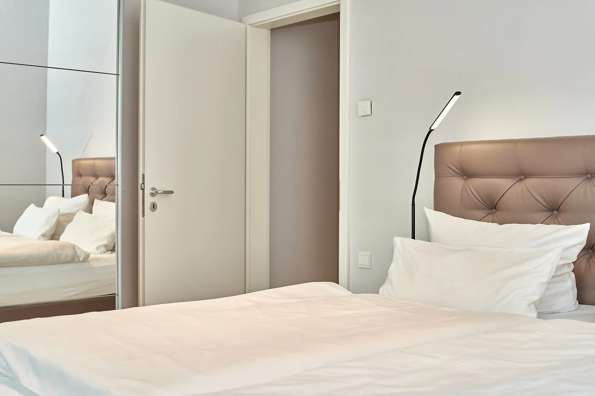 Das sehr grosse Schlafzimmer ist mit einem überlangen (2,10 m), komfortablen Boxspringbett versehen. Im Schlafraum befindet sich ein grosser Schwebetürenschrank. Eine der Türen ist mit einem Ganzkörperspiegel versehen.