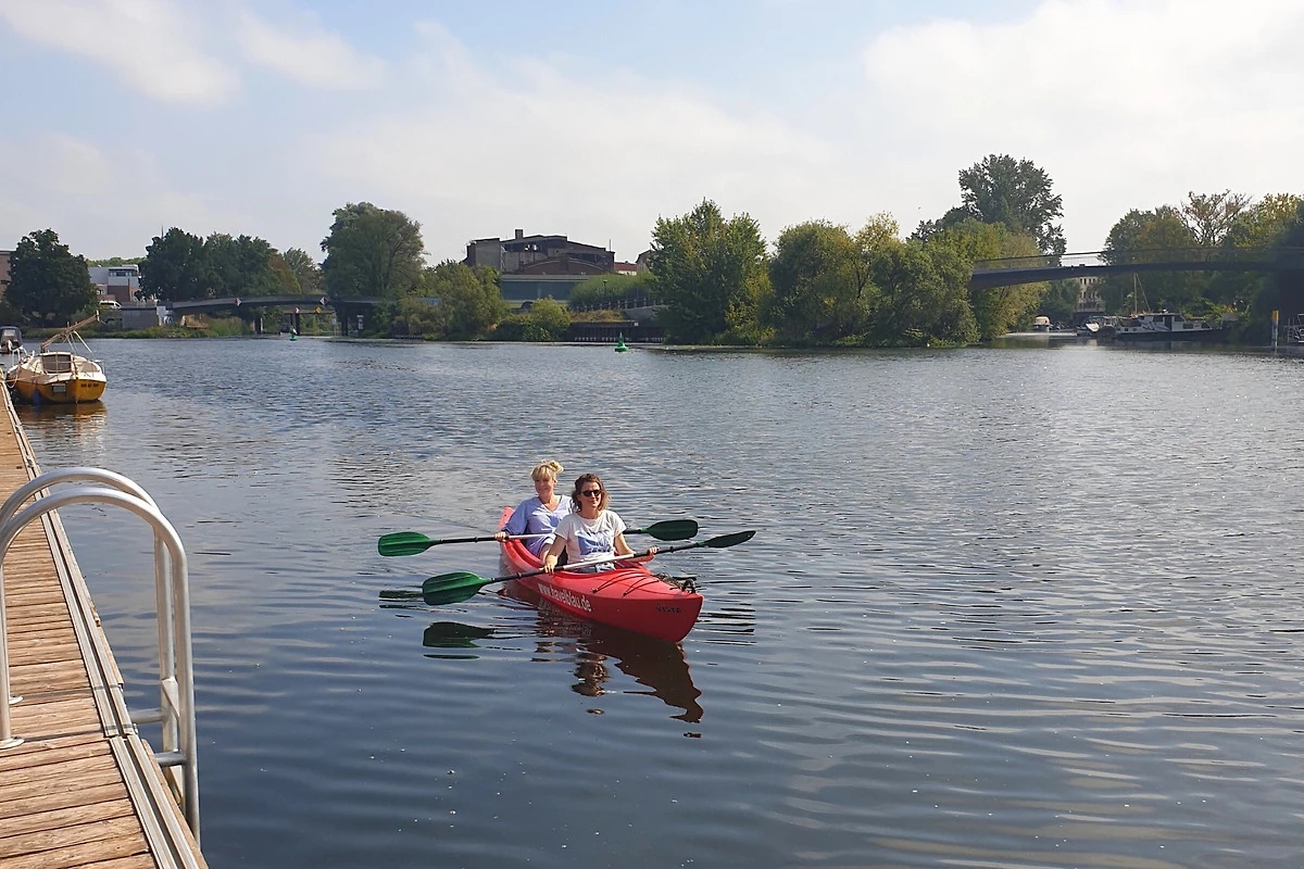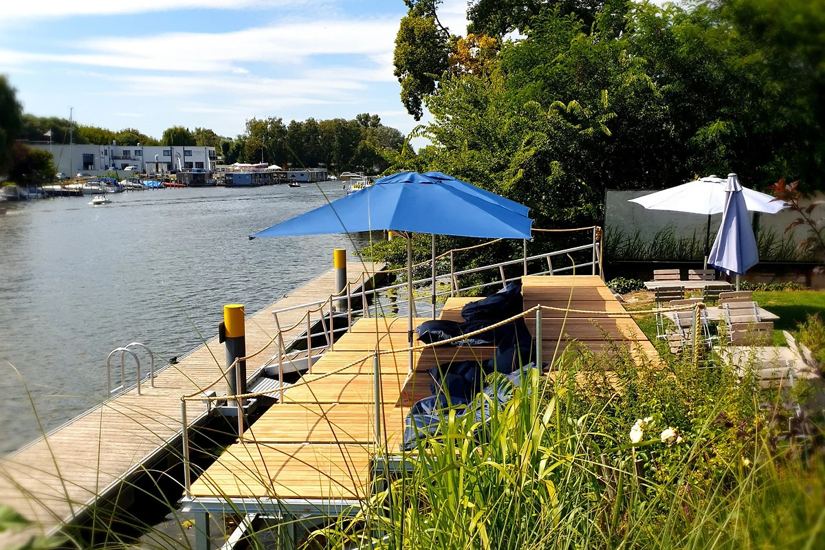 Ergänzt wird dieser Individualbereich durch die grosse Liege-/Spielwiese am Havelufer mit direktem Zugang zur hauseigenen Schwimm-/Badesteganlage, welche mit Badeleiter und einer Freibordhöhe von 20 cm errichtet wurde. Das ermöglicht Ihnen ein bequemes Ein- und Aussteigen aus ihrem Kanu bzw. Ruderboot. Weiterhin ist dort direkt neben dem übergrossen Natursteintisch (ca. 5 x 1,20m) der Grillplatz.