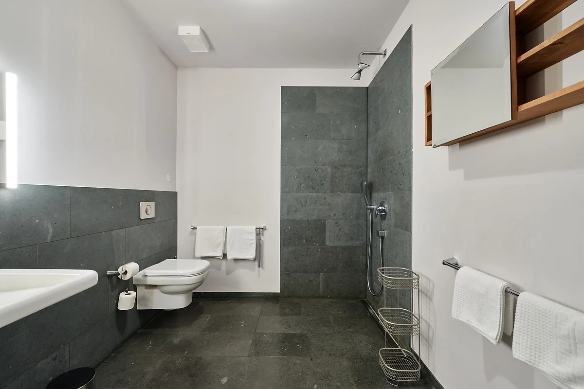 Die bodengleiche Dusche verfügt neben der Schlauchbrause auch über eine „Regenkopfdusche“. Das Waschbecken ist mit einem gut ausgeleuchteten, grossformatigen Spiegel versehen. Das es für Rollstuhlfahrer unterfahrbar ist, ist für uns selbstverständlich. Zur Ausstattung des Bades gehört auch ein Fön. Hand- und Duschtücher liegen für Sie bereit.