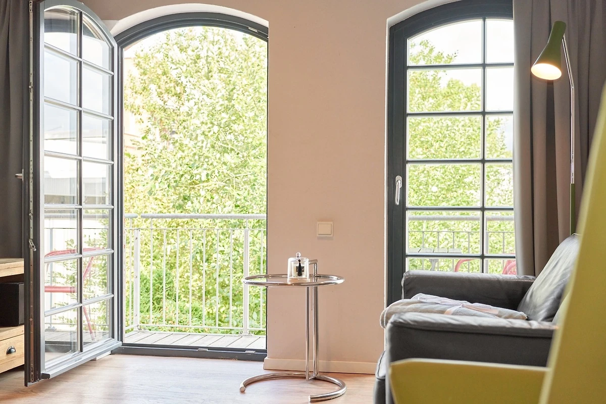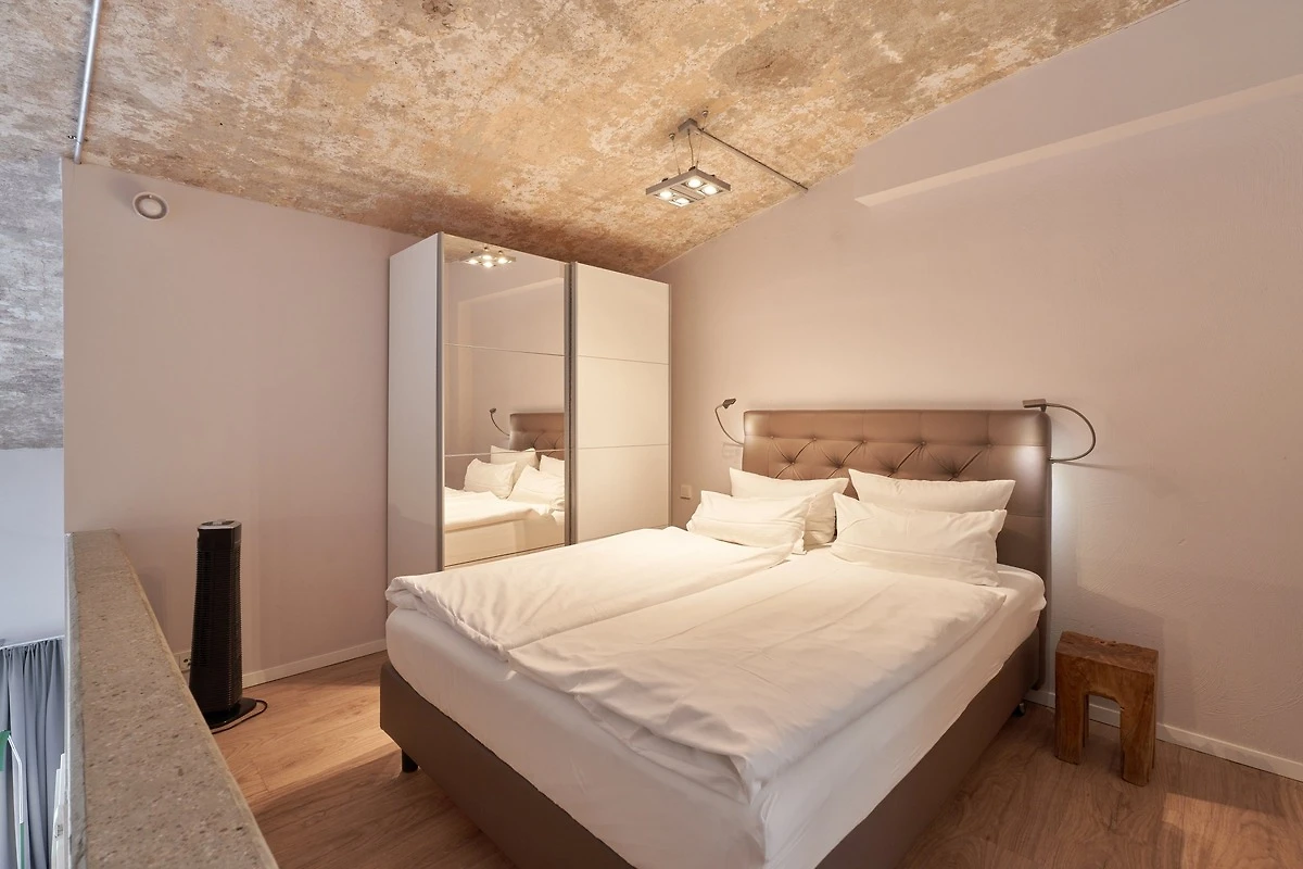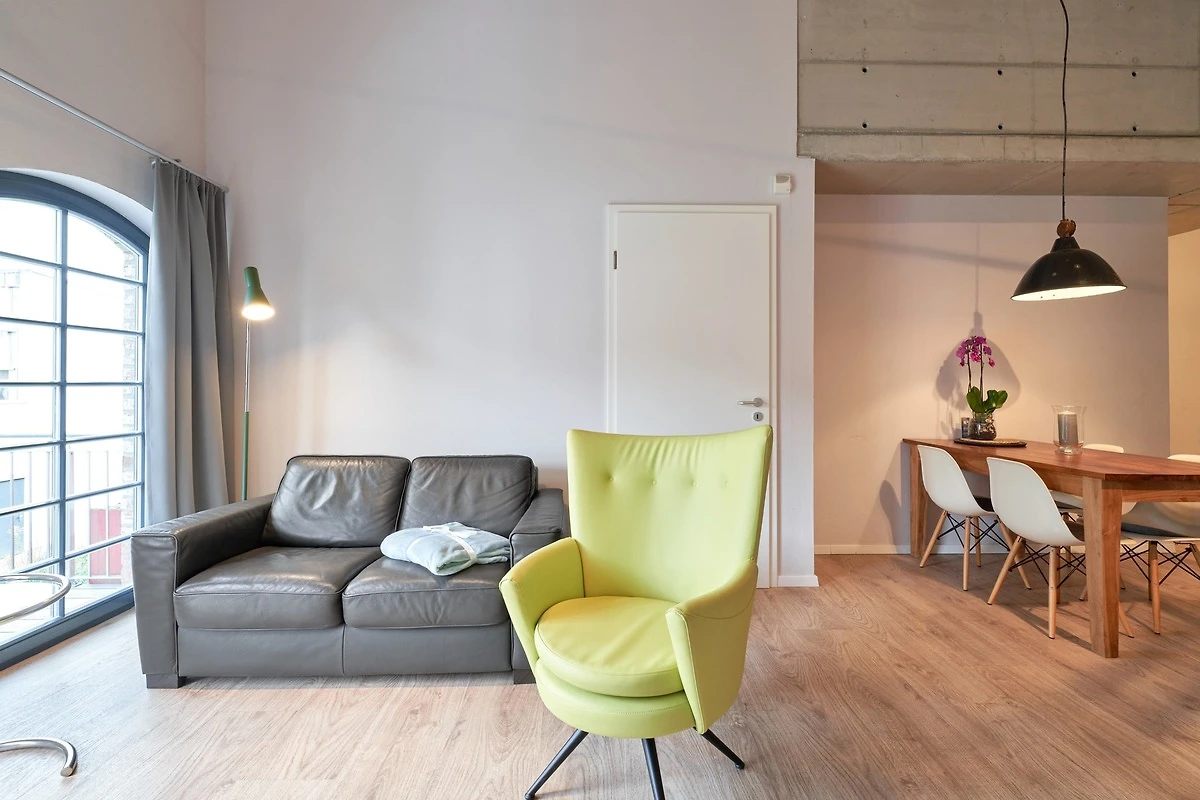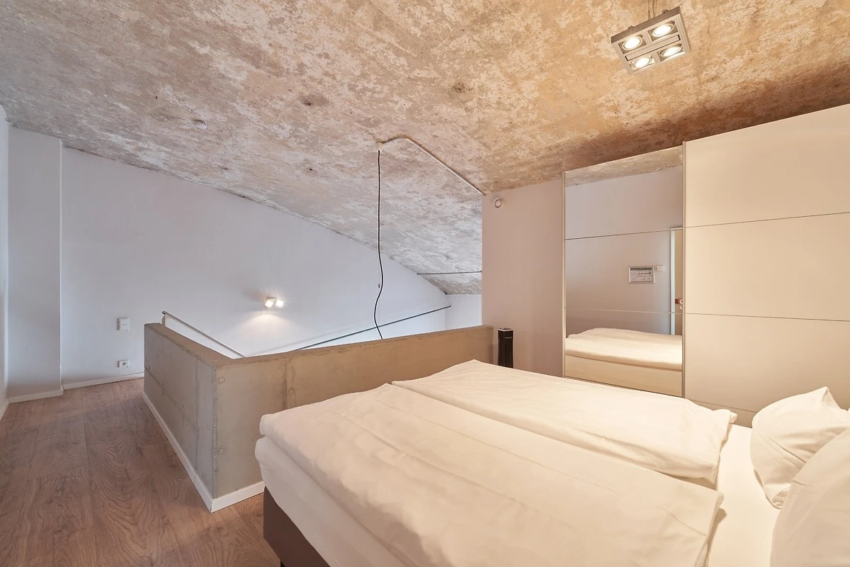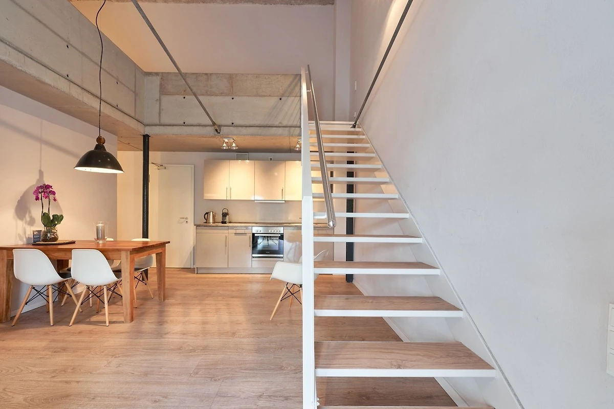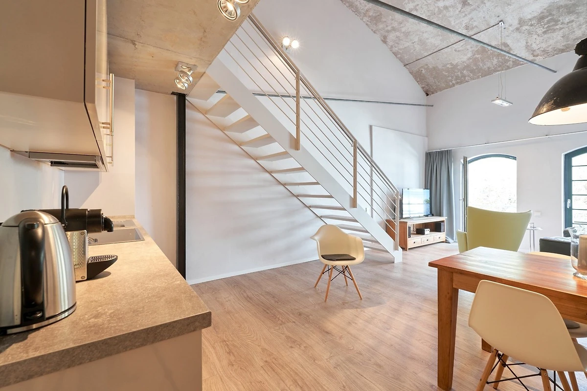 Die Maisonette-Ferienwohnung liegt im Obergeschoss der ehemaligen Färberei der Kammgarnspinnerei und zeichnet sich durch ihre geräumige Raumaufteilung (60m²) aus. Die gut geschnittene, viel Platz bietende und komfortabel ausgestattete Loft-Ferienwohnung ist für 4 Personen geeignet. Die Bereitstellung von Kinderreisebetten und Hochstühlen ist nach Vorbestellung jederzeit möglich.