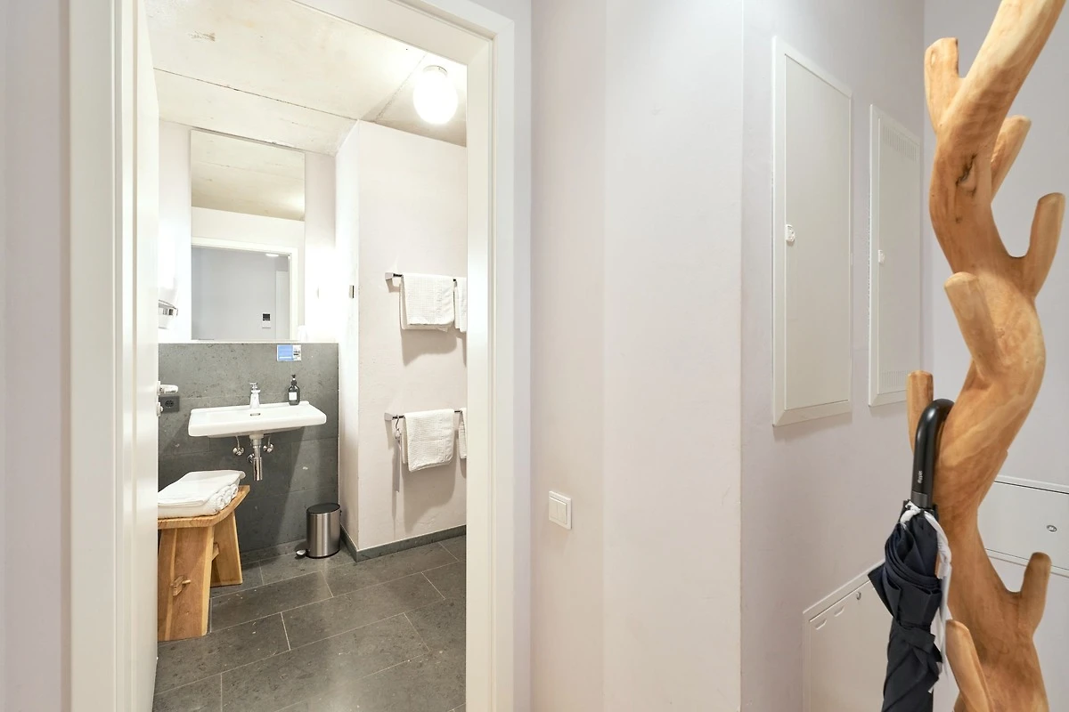 Die bodengleiche Dusche verfügt neben der Schlauchbrause auch über eine „Regenkopfdusche“. Das Waschbecken ist mit einem gut ausgeleuchteten, grossformatigen Spiegel versehen. Zur Ausstattung des Bades gehört auch ein Fön. Hand- und Duschtücher liegen für Sie bereit.