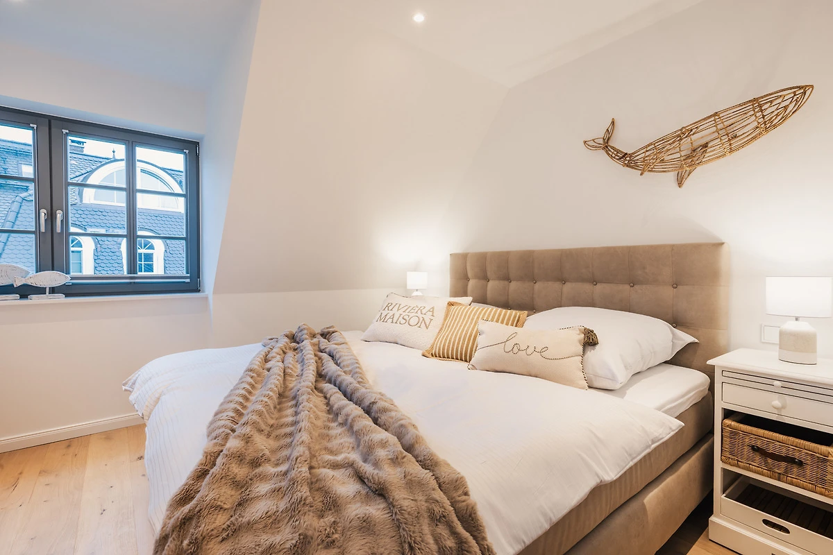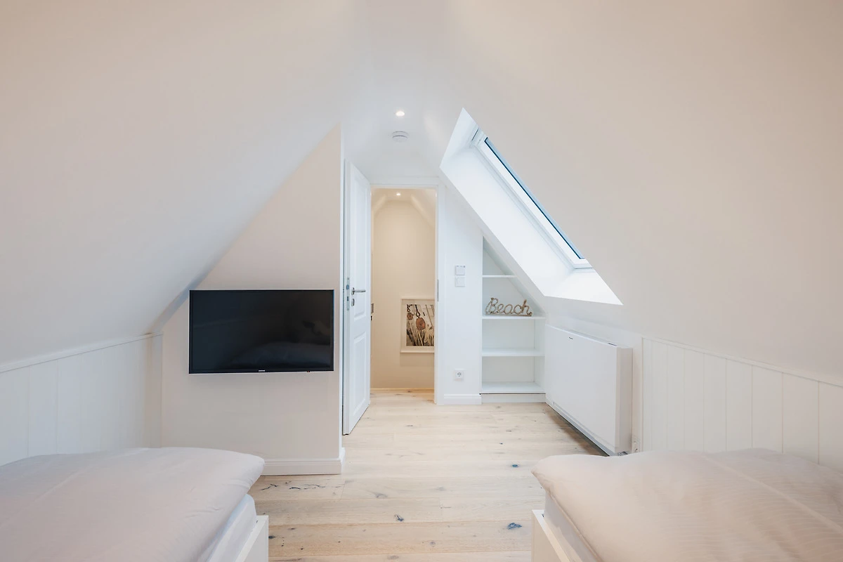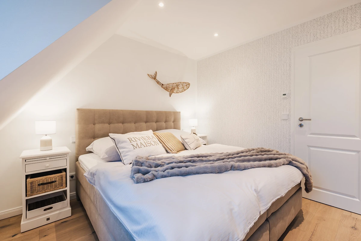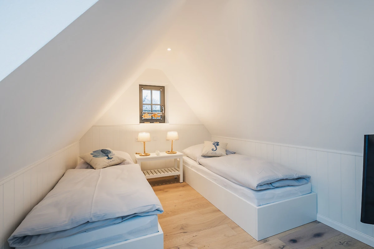 Die drei Schlafzimmer sind mit zwei bequemen Boxspringbetten und zwei Einzelbetten eingerichtet. Verdunkelnde Plissees sorgen für erholsame Nächte, und alle Schlafzimmer bieten ausreichend Stauraum für Ihr Gepäck.Hinweis: Die Betten sind bei Ihrer Anreise stets frisch bezogen. Bitte beachten Sie, dass grundsätzlich immer nur so viele Betten bezogen werden, wie Personen anreisen. Da das Haus über zwei Doppelbetten und zwei Einzelbetten verfügt, werden bei einer Buchung von vier Personen standardmässig die beiden Doppelbetten vorbereitet, gleiches gilt auch bei zwei Personen, da wird nur ein Doppelbett bezogen. Wir gehen davon aus, dass gemeinsam reisende Personen ein Doppelbett teilen. Sollten Sie eine andere Schlafaufteilung wünschen, teilen Sie uns dies bitte vor Ihrer Anreise mit, damit wir die Betten entsprechend vorbereiten können. Eine Einsicht in das persönliche Verhältnis der Reisenden besteht selbstverständlich nicht.