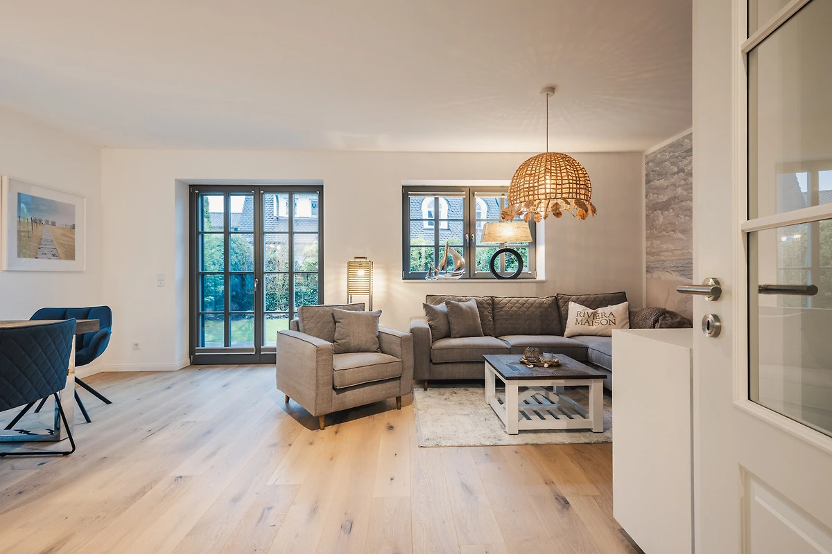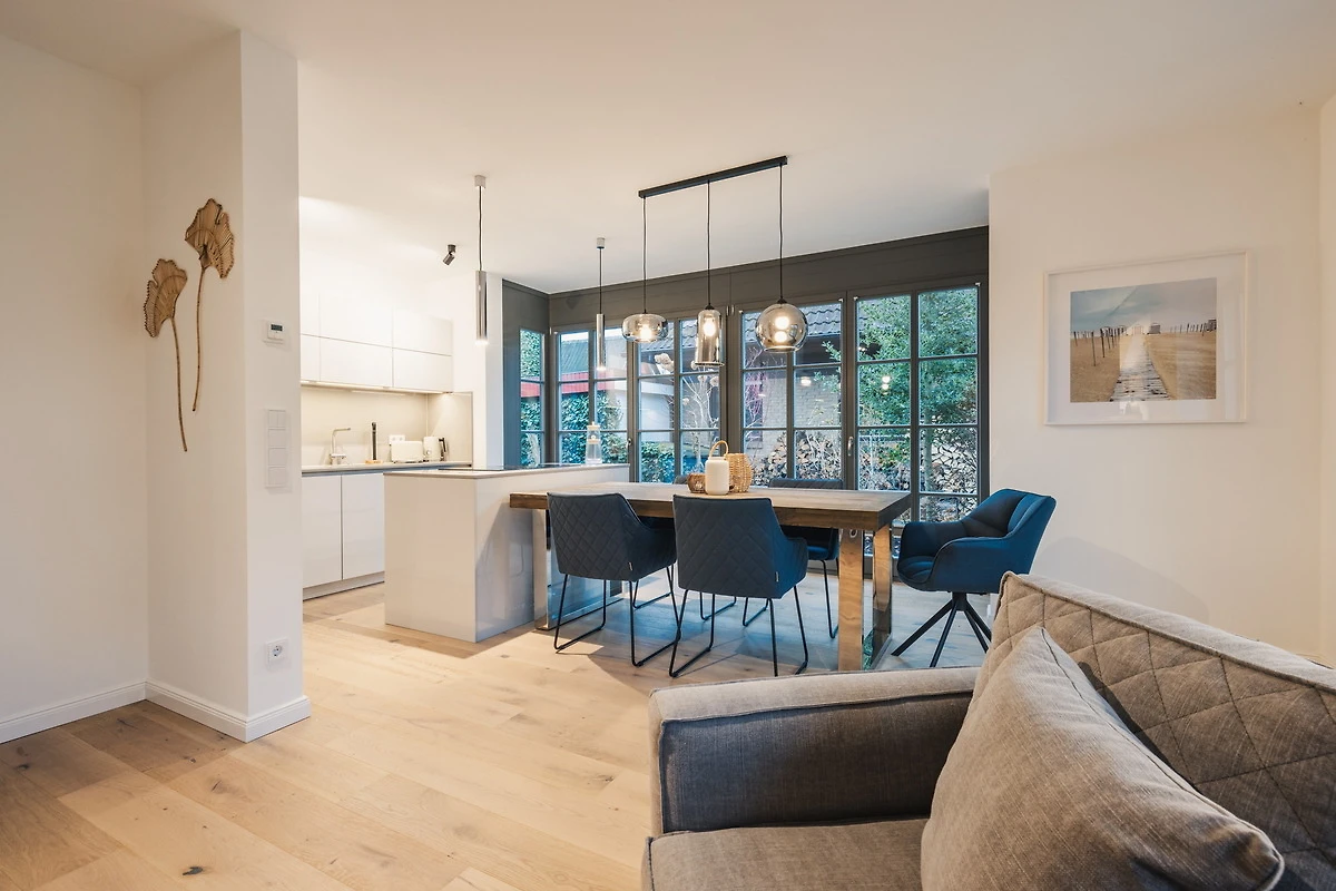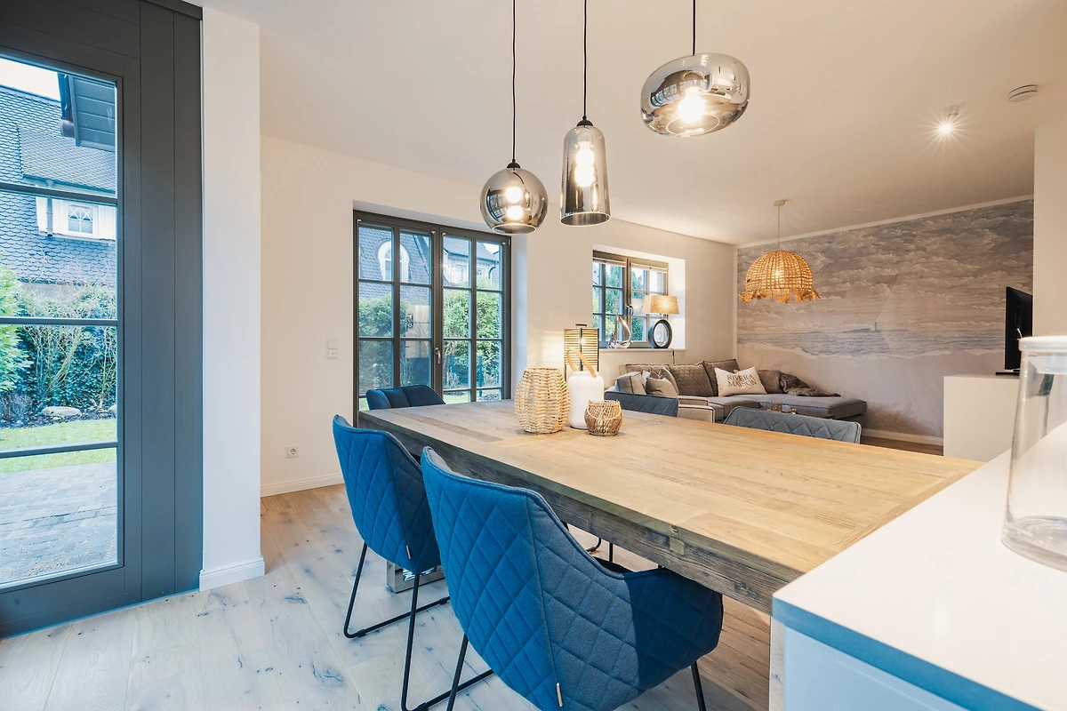 Das Ferienhaus ist gemütlich und komfortabel eingerichtet, um Ihren Aufenthalt so angenehm wie möglich zu gestalten. Der offene Wohnbereich verfügt über eine einladende Sofalandschaft, einen Esstisch und grosse Fenster, die viel Tageslicht hereinlassen. Die moderne Küche mit Kochinsel ist ausgestattet mit hochwertigen Markengeräten – darunter Geschirrspüler, Backofen und Kapsel-Kaffeemaschine.