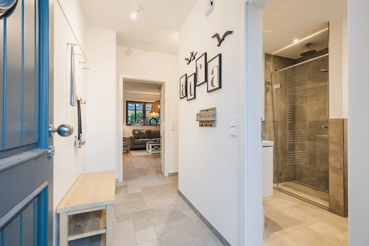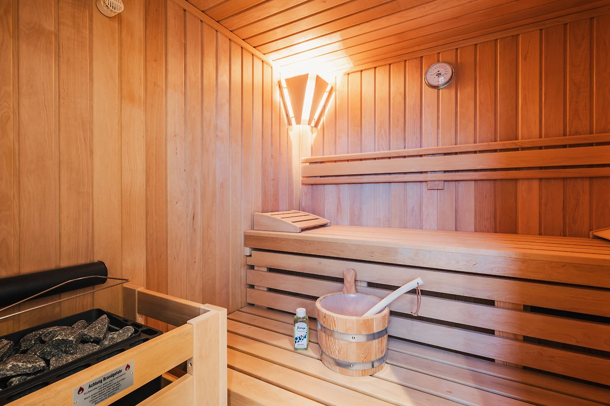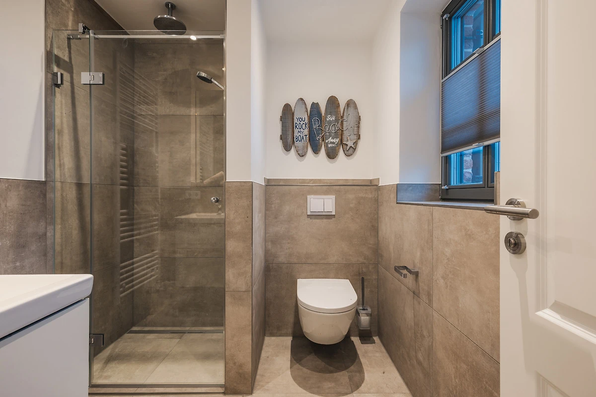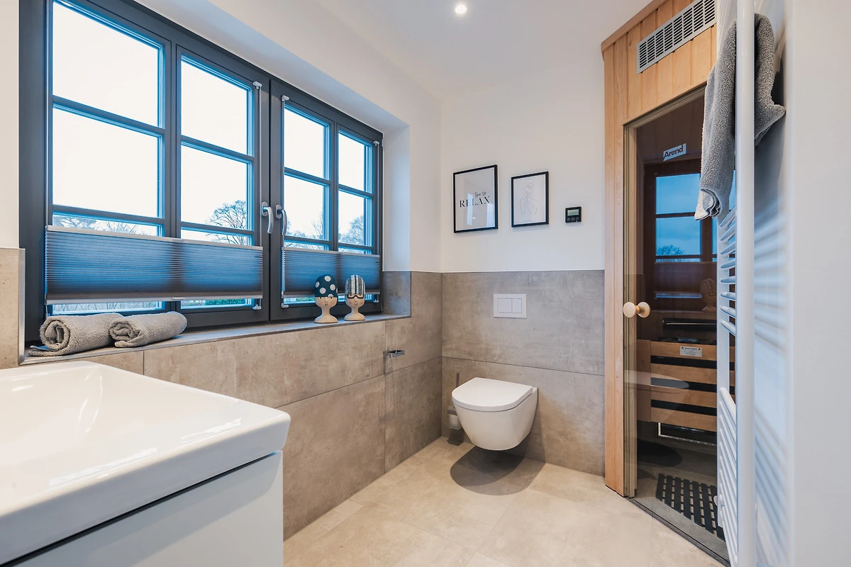 Das Ferienhaus verfügt über zwei moderne Badezimmer, beide mit geräumigen Duschen und hochwertigen Armaturen. Das Hauptbadezimmer bietet zusätzlich eine entspannende Sauna, in der Sie die Wärme geniessen und neue Energie tanken können.