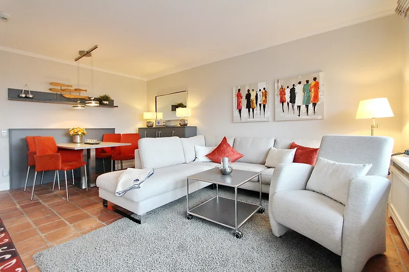 Wohn-/Essbereich: grosszügiger Wohnraum mit gemütlicher Eck-Couchgarnitur und Sessel, Esstischgruppe mit 4 Stühlen, TV