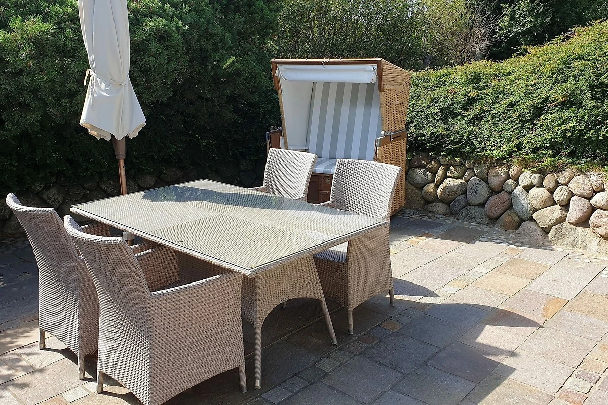 Terrasse mit Gartenmöbel und Strandkorb