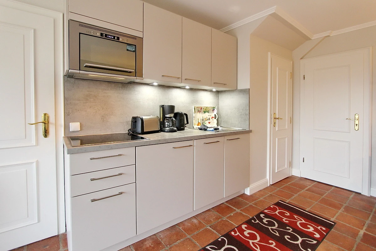 integrierte Küchenzeile im Wohnraum mit Cerankochfeld, Geschirrspüler und Mikrowelle