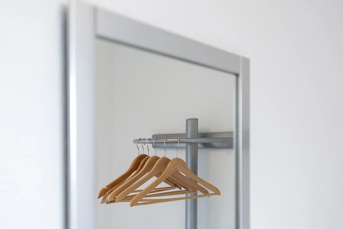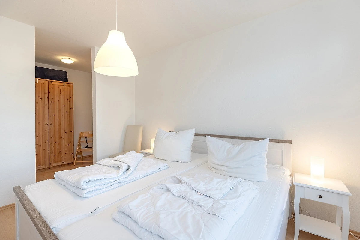 Das separate Schlafzimmer ist mit einem Doppelbett (2x 90x200cm) und einem 2-türigen Kleiderschrank ausgestattet. Das Schlafzimmer ist mit Laminatboden ausgelegt. Das Fenster lässt sich durch einen Vorhang und einem Aussenrollo vollständig verdunkeln.