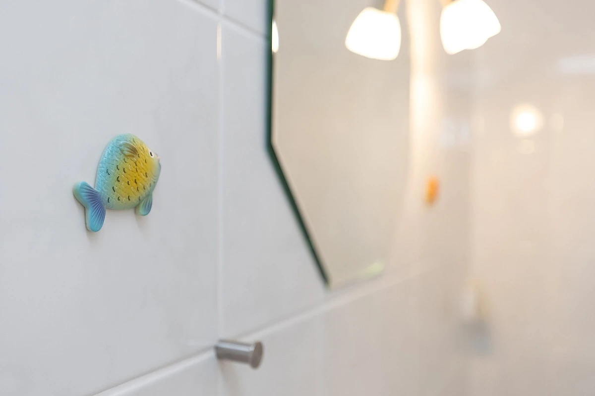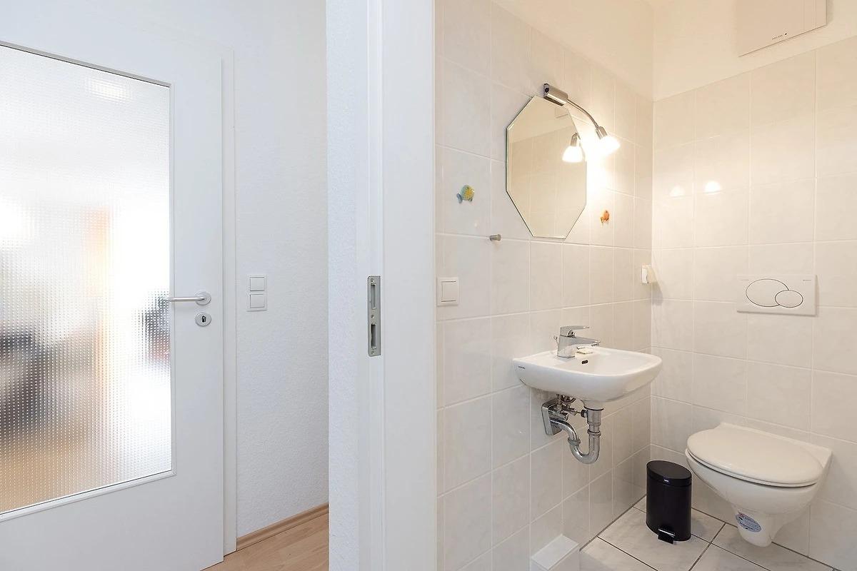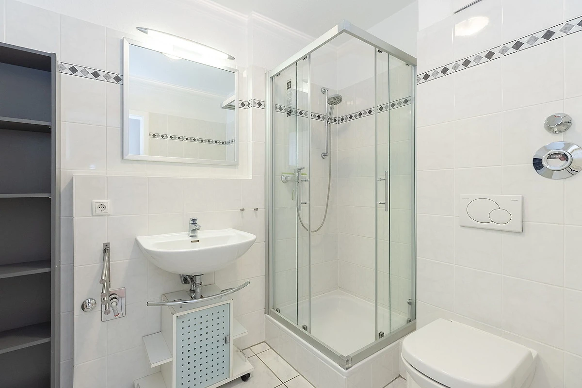 Modernes, hell gefliestes Bad mit Dusche, WC und Waschbecken. Zusätzliches separates, modernes und hell gefliestes WC.
