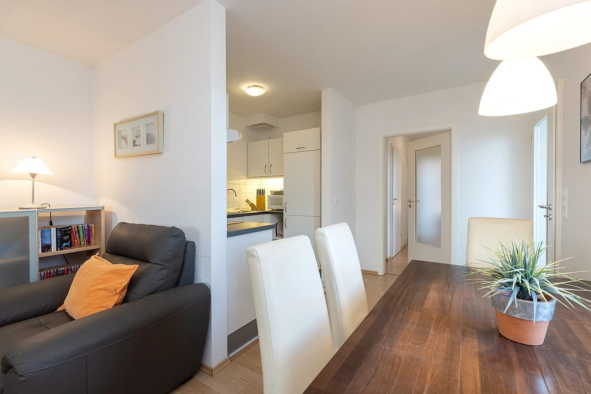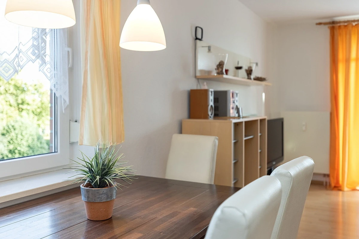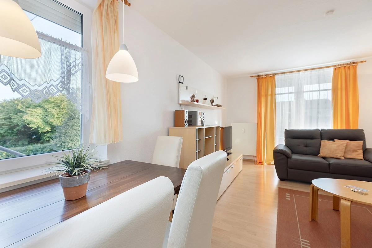 Modernes, freundliches Wohn- und Esszimmer mit direktem Zugang zum Balkon in südliche Richtung. Das Wohn- und Esszimmer ist mit einem Essplatz für 4 Personen, einer 2-Sitzer und einer 3-Sitzer Couch, einem Couchtisch, einer Kommode und einem Wohnzimmerschrank ausgestattet. Zur Unterhaltung stehen ein Flachbildfernseher und eine Mini-Stereoanlage mit CD-Player zur Verfügung.