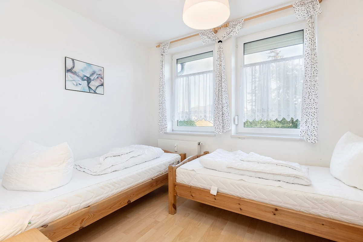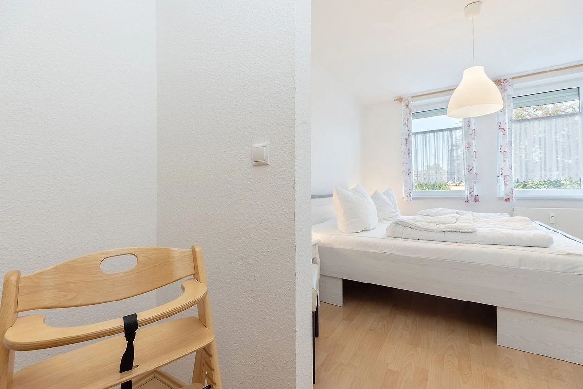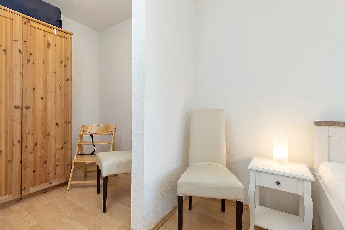 Das Schlaf- bzw. Kinderzimmer ist mit 2 Einzelbetten (90x200cm) und einem kleinen Kleiderschrank ausgestattet. Das Zimmer ist mit Laminatboden ausgelegt. Das Fenster lässt sich durch ein Aussenrollo vollständig verdunkeln.