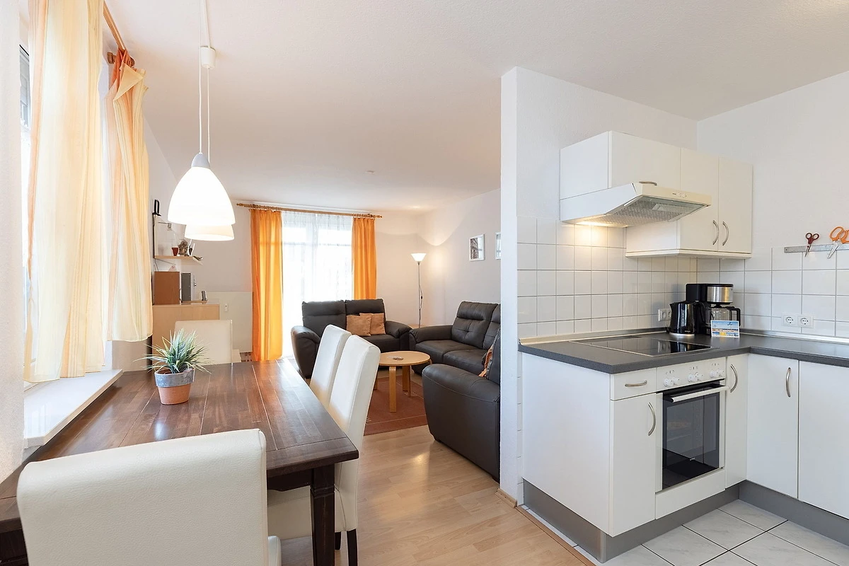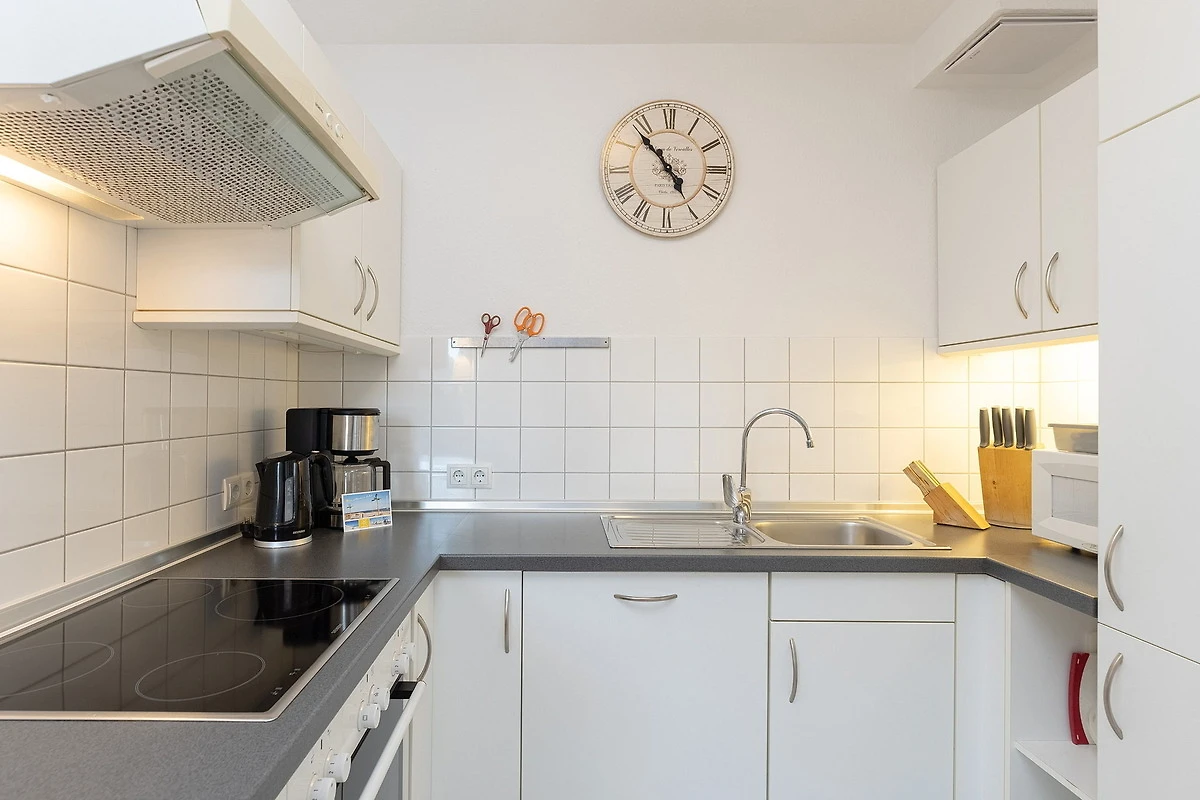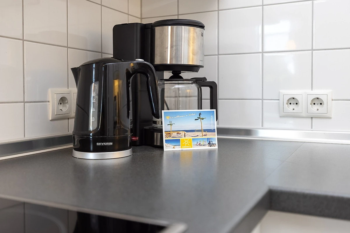 Komplett ausgestattete, moderne, zum Essbereich offene Küche. Die Küche ist mit einem 4 Platten E-Herd mit Backofen, einem Kühlschrank mit kleinem 3-Sterne Gefrierfach, einer Spülmaschine, einer Mikrowelle, einem Toaster, einem Wasserkocher und einer Kaffeemaschine ausgestattet.