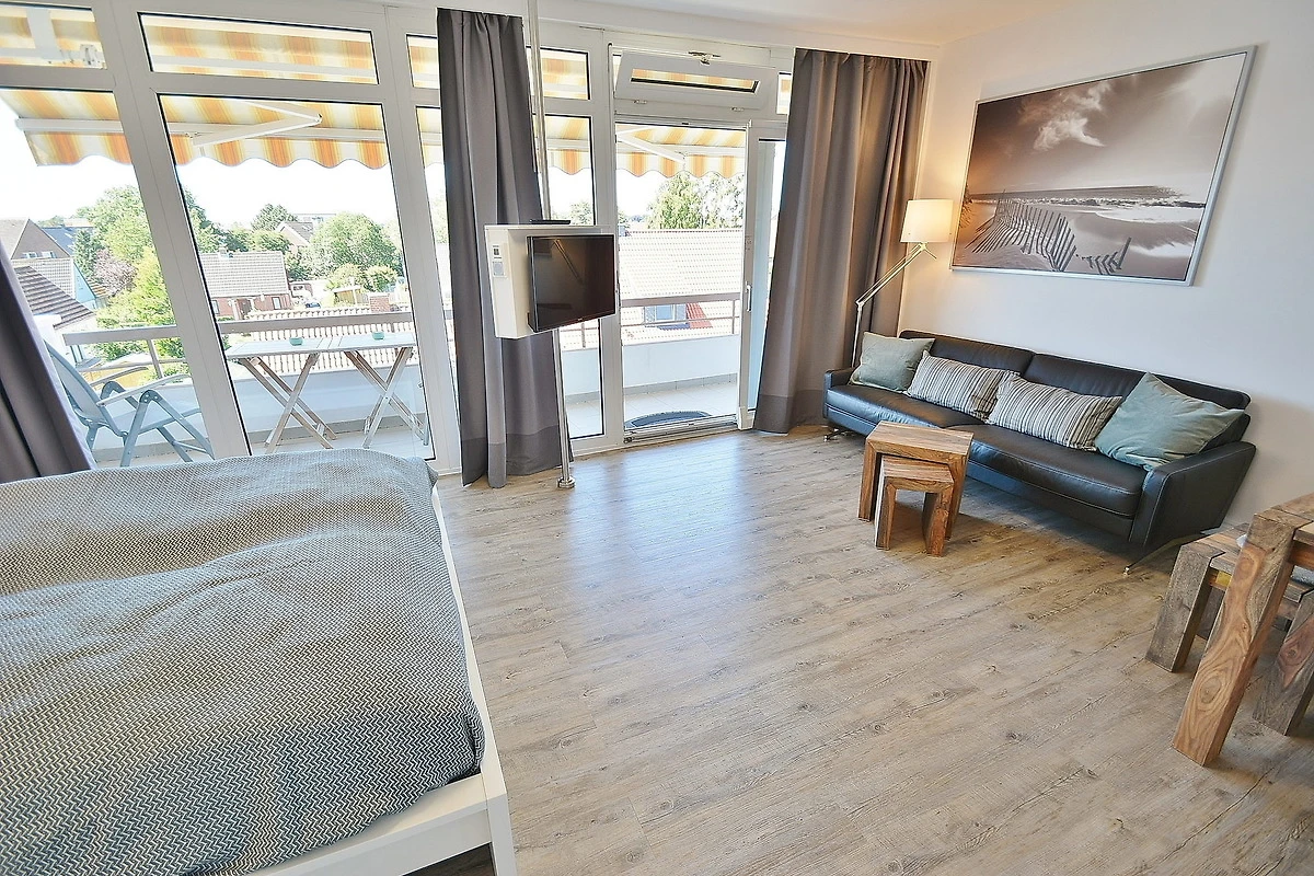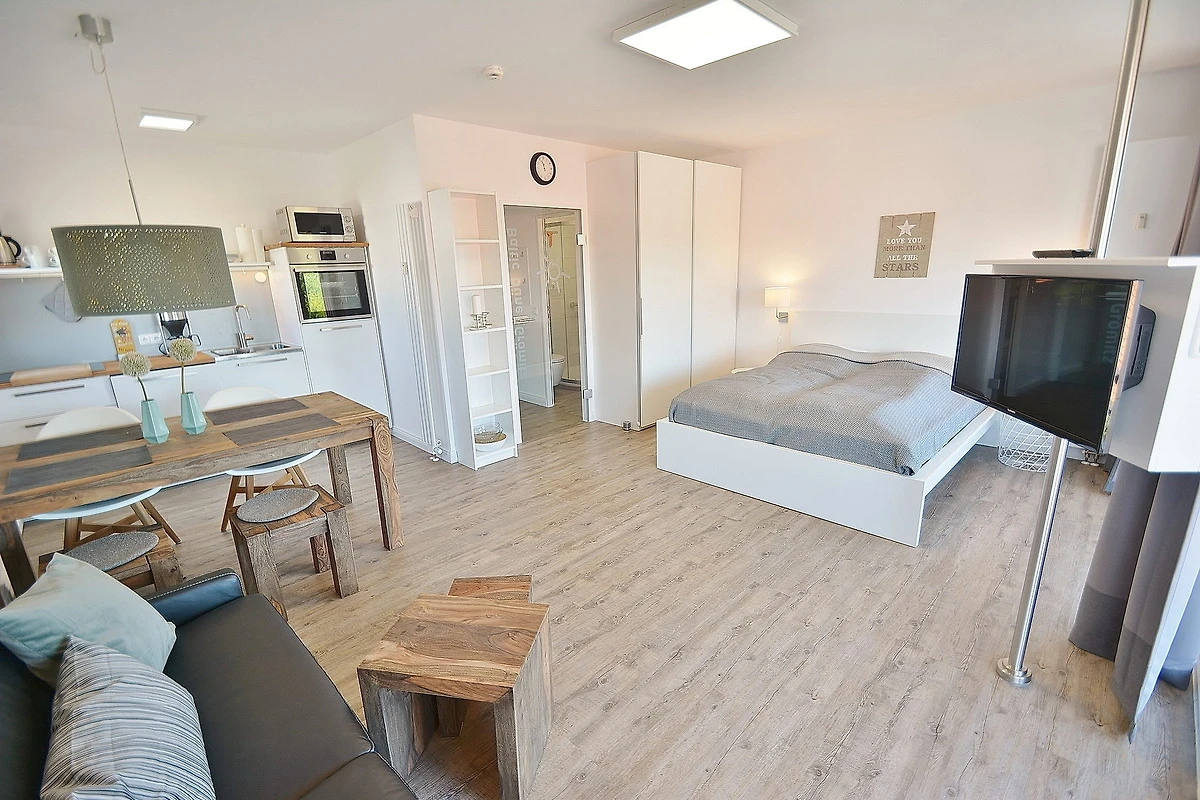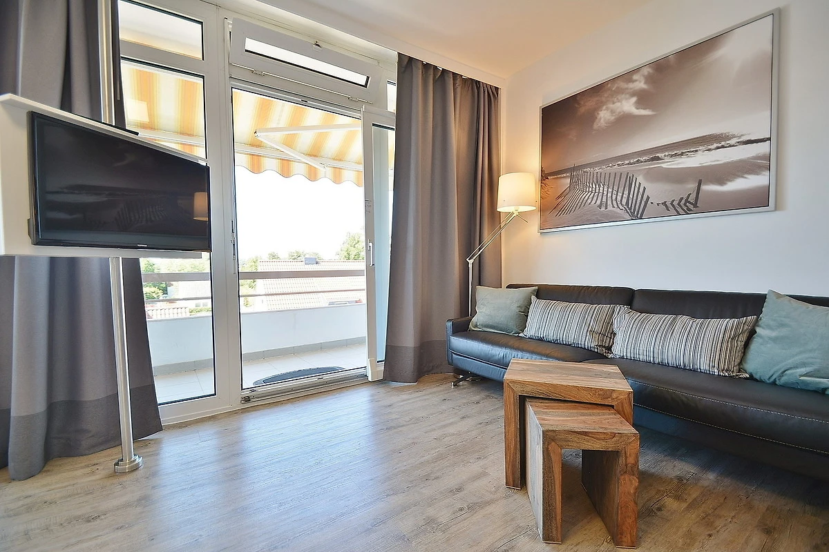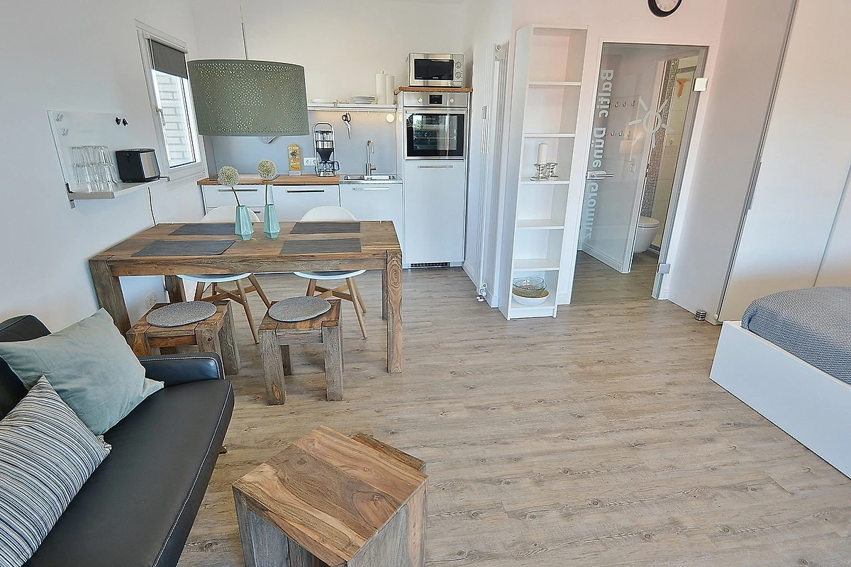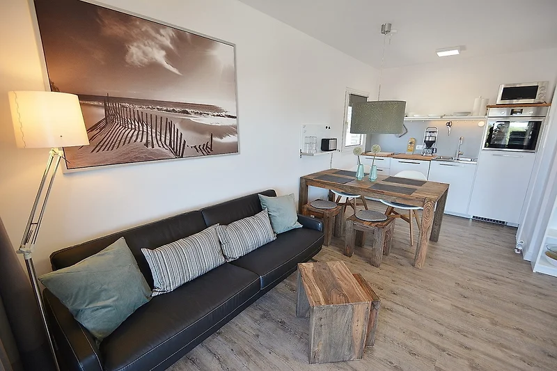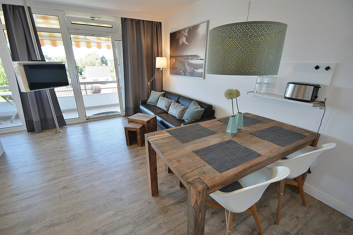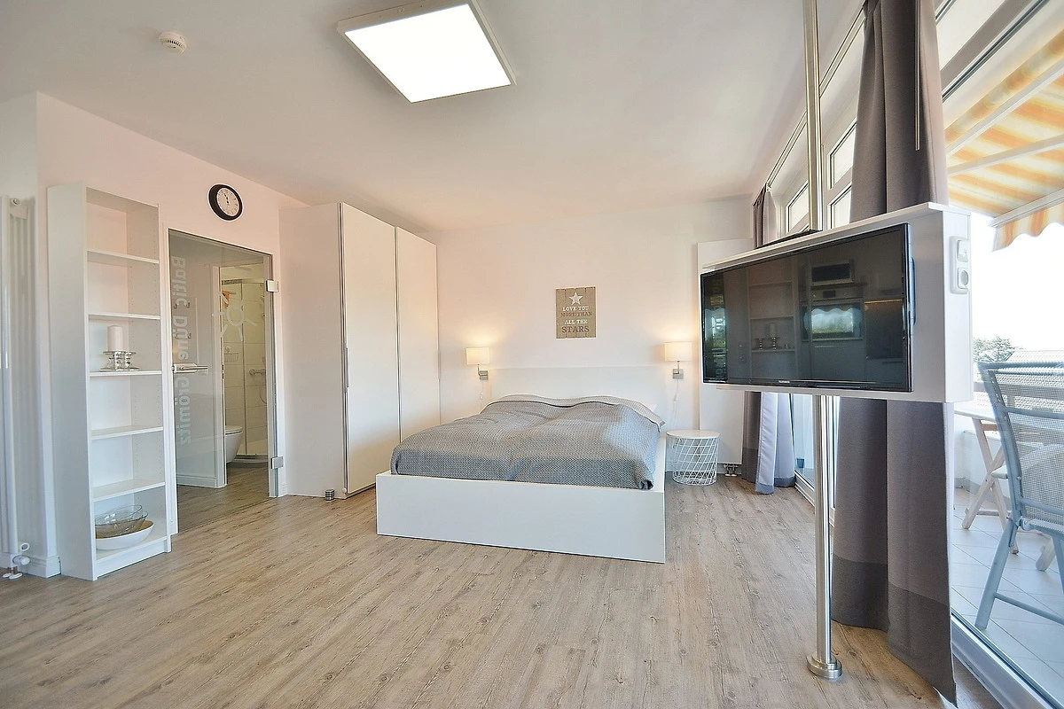 Moderner, freundlicher und heller Wohnbereich mit direktem Zugang zum Balkon. Der Wohnbereich ist mit einer Couch, einem Couchtisch, einem Essbereich für 4 Personen, einem Doppelbett und einem 2-türigem Kleiderschrank ausgestattet. Zur Unterhaltung steht ein Flachbildschirm zur Verfügung.