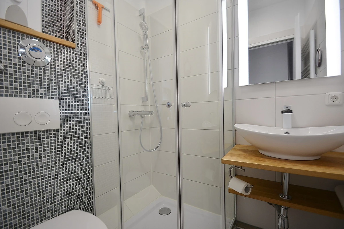 Modernes, freundliches Bad mit Dusche, WC und Waschbecken.