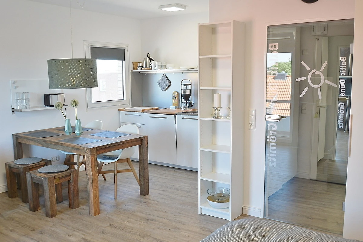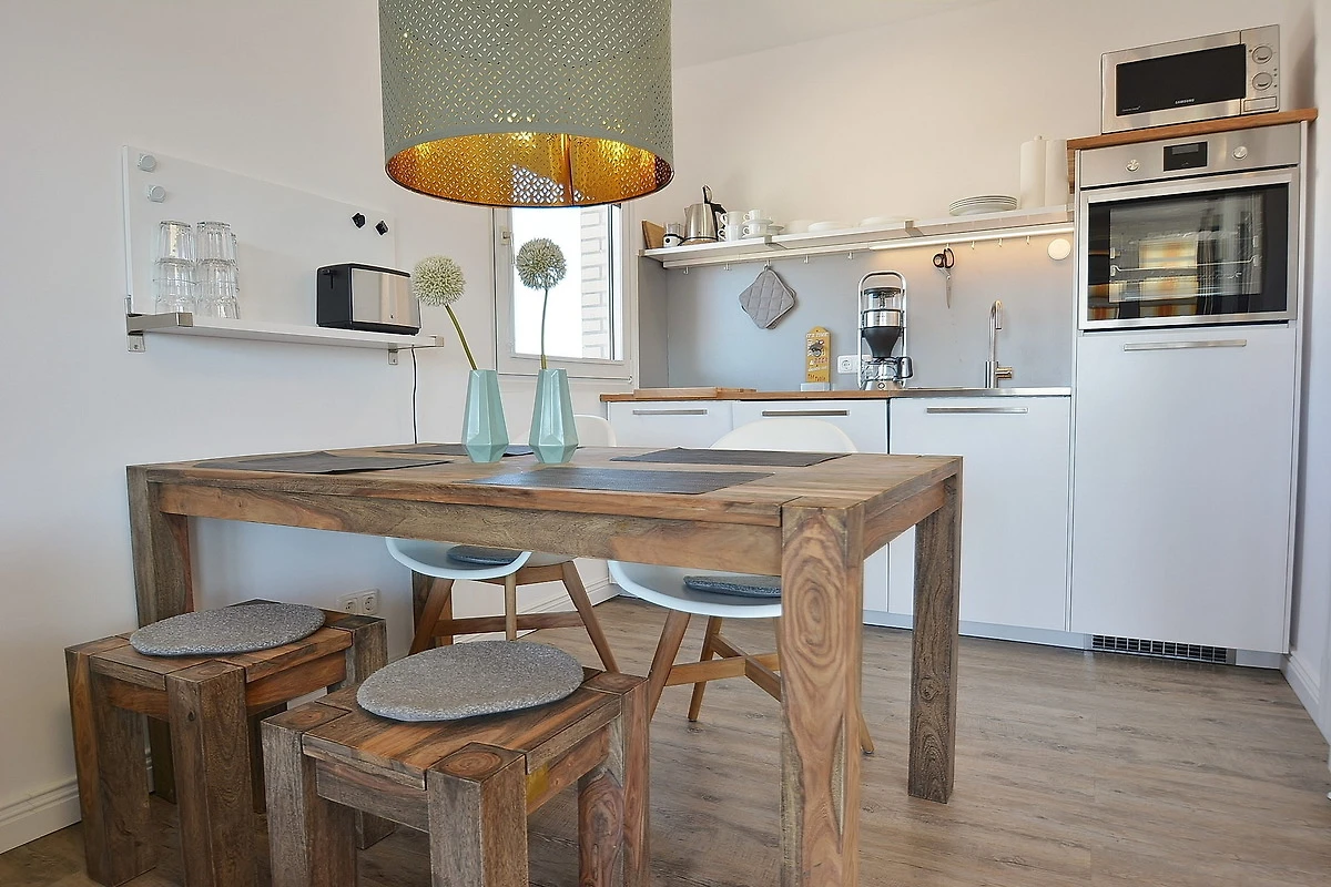 Moderne, komplett eingerichtete, zum Wohnbereich offene Küche. Die Küche ist mit einem Ceran- Kochfeld, einer Spülmaschine, einem Wasserkocher, Toaster, Kaffeemaschine, einem Kühlschrank und einer Mikrowelle ausgestattet.