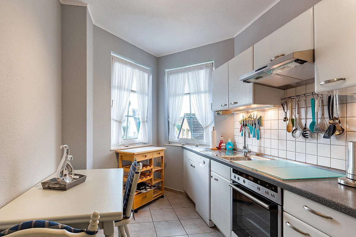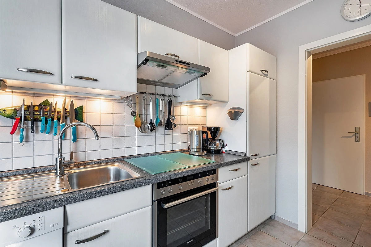 Separate Küche mit 4 Platten-Cerankochfeld, Kühlschrank mit Gefrierfach, Spülmaschine, Backofen und Mikrowelle. Ein Wasserkocher, Kaffeemaschine und Toaster gehören ebenfalls zur Ausstattung.