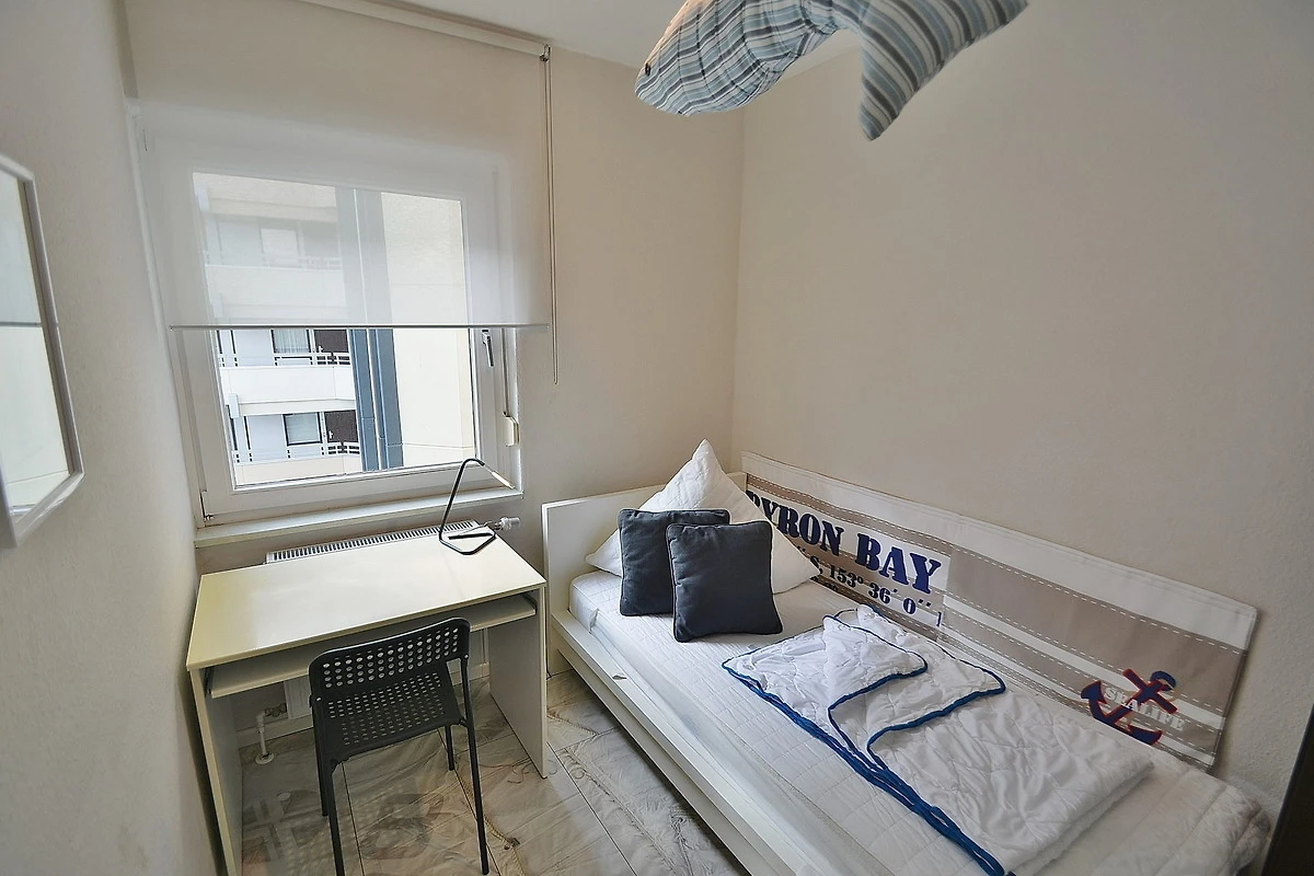 Das modern eingerichtete Kinderzimmer ist mit einem Einzelbett (90x200cm), einem Schreibtisch mit Stuhl und einem kleinen Schrank ausgestattet. Das Kinderzimmer ist mit Laminatboden ausgelegt.