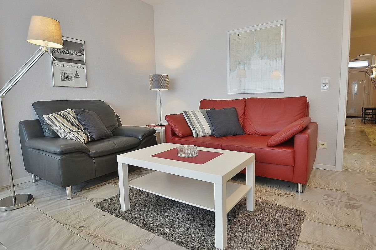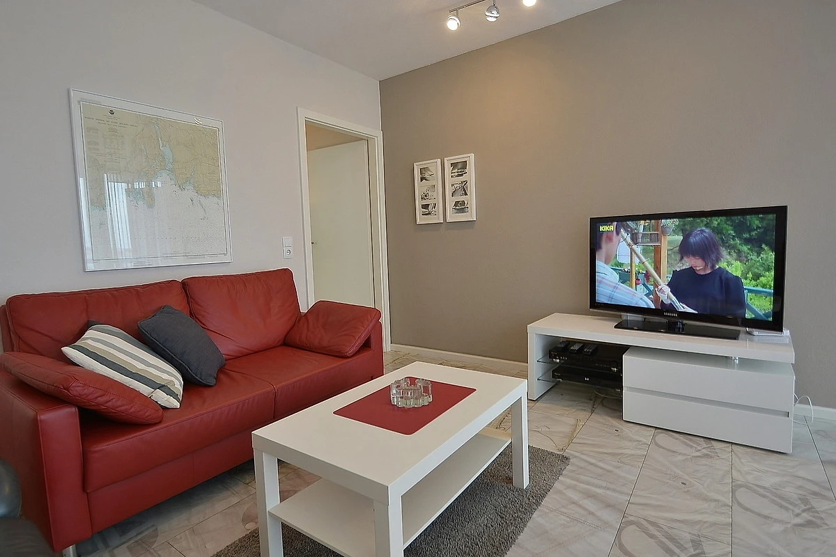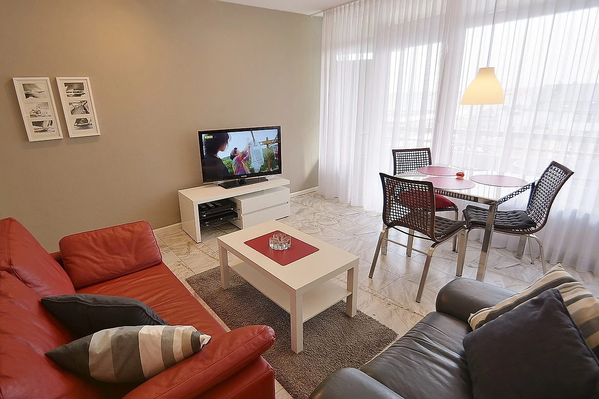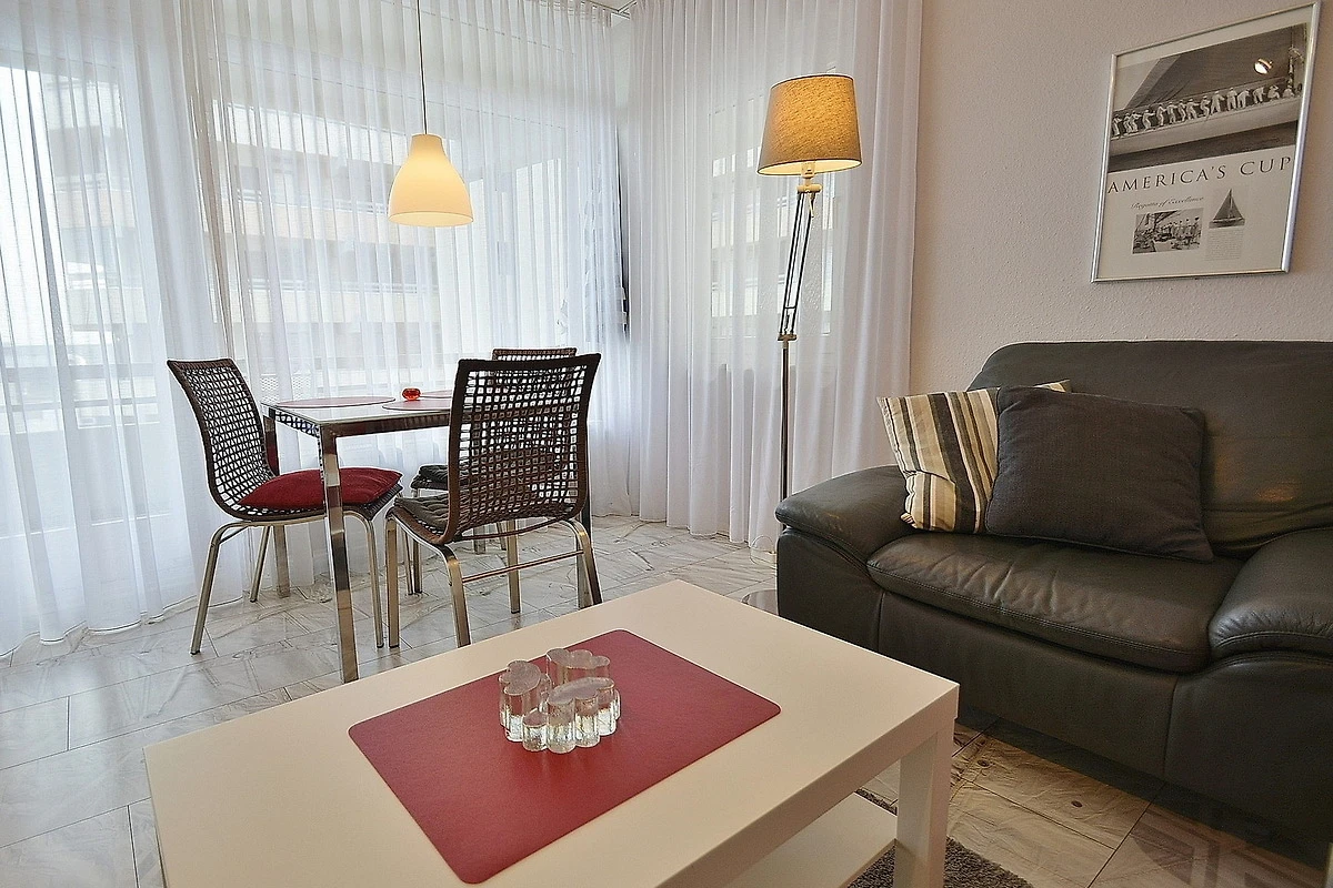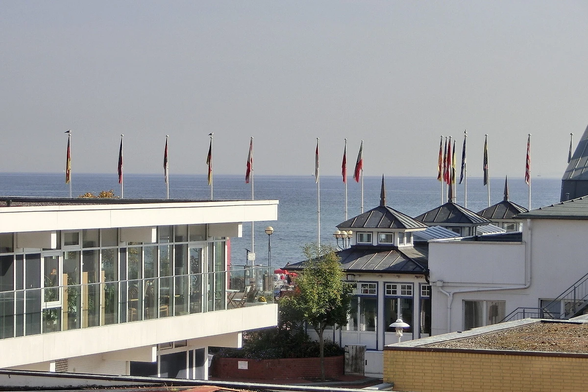 Grosser Balkon (ca. 12qm) in südliche Richtung mit Seeblick und Blick auf die Seebrücke. Eigener PKW-Stellplatz (max. Höhe 2,00 m), Waschmaschine und Trockner gegen Gebühr. Kostenloses WLAN.