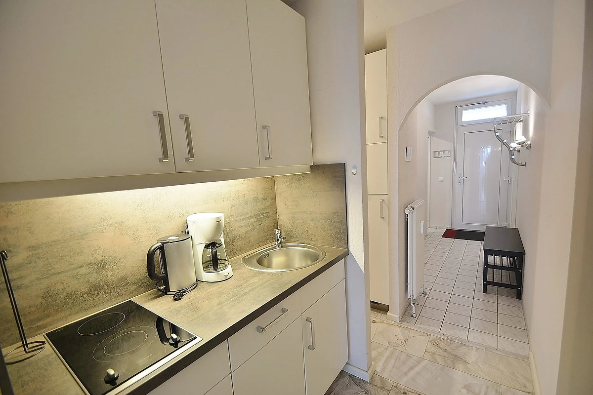 Moderne, hochwertige Pantry-Küche im Flur. Die Küche ist mit einem 2-Platten Cerankochfeld, einer Spülmaschine, einem Kühlschrank mit kleinem 3-Sterne Gefrierfach, Mikrowelle, einer Kaffeemaschine, einem Toaster und einem Wasserkocher ausgestattet.